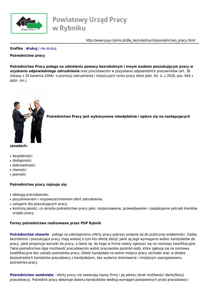 http://www.pup-rybnik.pl/dla_bezrobotnych/posrednictwo_pracy.html Grafika : drukuj / nie drukuj Pośrednictwo pracy Pośrednictwo Pracy polega na udzieleniu pomocy bezrobotnym i innym osobom poszukującym pracy w uzyskaniu odpowiedniego zatrudnienia oraz pracodawcom w pozyskaniu odpowiednich pracowników (art. 36 Ustawy z 20 kwietnia 2004r. o promocji zatrudnienia i instytucjach rynku pracy tekst jedn. Dz. U. z 2016, poz. 645 z późn. zm.). Pośrednictwo Pracy jest wykonywane nieodpłatnie i opiera się na następujących zasadach: ● ● ● ● ● bezpłatności dostępności dobrowolności równości jawności Pośrednictwo pracy zajmuje się: ● ● ● ● obsługą pracodawców; pozyskiwaniem i rozpowszechnianiem ofert zatrudnienia, usługami dla poszukujących pracy; kontrolą jakości, co określa pośrednictwo pracy jako: rozpoznawanie, przewidywanie i zaspokajanie potrzeb klientów urzędu pracy; Formy pośrednictwa realizowane przez PUP Rybnik Pośrednictwo otwarte - polega na udostępnieniu oferty pracy poprzez podanie jej do publicznej wiadomości. Osoby bezrobotne i poszukujące pracy mają wiedzę o tym kto ofertę złożył, jakie są jego wymagania wobec kandydatów do pracy, jakie proponuje warunki do pracy, a także np. do kogo w firmie należy zgłaszać się na rozmowy kwalifikacyjne. Takie pośrednictwo daje możliwość pracodawcom wybór pracownika spośród osób, które zgłoszą się na rozmowy kwalifikacyjne bez udziału pośrednika pracy. Dobór kandydata na wolne miejsce pracy zachodzi więc w drodze bezpośrednich kontaktów pracodawcy z kandydatami, bez wydania skierowania i mniejszym zaangażowaniu pośrednika pracy. Pośrednictwo zamknięte - oferty pracy nie zawierają nazwy firmy i jej adresu (brak możliwości identyfikacji pracodawcy). Pośrednik pracy dokonuje doboru kandydatów według wymagań postawionych przez pracodawcę i kieruje na rozmowy kwalifikacyjne wydając skierowanie. Cechą pozytywną takiego pośrednictwa jest całkowite odciążenie pracodawcy z prowadzenia rozmów kwalifikacyjnych z wieloma, nawet przypadkowymi osobami, co oszczędza jego czas i nakład pracy. Giełdy pracy - organizowane na życzenie pracodawcy. Giełdy pracy (najczęściej na terenie PUP) organizuje się w przypadku, gdy po stronie firmy istnieje potrzeba spotkania się z większą liczbą potencjalnych kandydatów do pracy – najczęściej w tym samym zawodzie. Urząd gwarantuje pracodawcy upowszechnienie informacji o giełdzie i wybranie grupy osób zainteresowanych pracą na danym stanowisku. Pracodawca po przeprowadzeniu postępowania kwalifikacyjnego z kandydatami do pracy informuje PUP o zatrudnieniu określonych osób. Targi pracy - organizuje się w celu umożliwienia bezpośredniego kontaktu większej grupy pracodawców z potencjalnymi kandydatami do pracy, z którymi istnieje możliwość przeprowadzenia podczas imprezy targowej pierwszych rozmów kwalifikacyjnych, a także – zbudowania bazy danych o potencjalnych kandydatach do pracy. Usługi dla poszukujących pracy Informacje o aktualnych ofertach pracy zamieszczane są na: ● ● stronie internetowej urzędu pracy, oraz tablicy ogłoszeń zlokalizowanej w siedzibie urzędu.