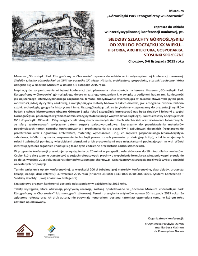 Muzeum „Górnośląski Park Etnograficzny w Chorzowie” zaprasza do udziału w interdyscyplinarnej konferencji naukowej, pt. SIEDZIBY SZLACHTY GÓRNOŚLĄSKIEJ OD XVIII DO POCZĄTKU XX WIEKU… HISTORIA, ARCHITEKTURA, GOSPODARKA, STOSUNKI SPOŁECZNE Chorzów, 5-6 listopada 2015 roku Muzeum „Górnośląski Park Etnograficzny w Chorzowie” zaprasza do udziału w interdyscyplinarnej konferencji naukowej: Siedziby szlachty górnośląskiej od XVIII do początku XX wieku. Historia, architektura, gospodarka, stosunki społeczne, która odbędzie się w siedzibie Muzeum w dniach 5-6 listopada 2015 roku. Inspiracją do zorganizowania niniejszej konferencji jest planowana rekonstrukcja na terenie Muzeum „Górnośląski Park Etnograficzny w Chorzowie” górnośląskiego dworu wraz z jego otoczeniem i, w związku z podjętymi badaniami, konieczność jak najszerszego interdyscyplinarnego rozpoznania tematu, zdecydowanie wykraczająca w zakresie stawianych pytań poza możliwości jednej dyscypliny naukowej, a uwzględniająca metody badawcze takich dziedzin, jak: etnografia, historia, historia sztuki, archeologia, geografia historyczna i inne. Uszczegóławiając zakres terytorialny – zapraszamy do prezentacji wyników badań z całego historycznego obszaru Górnego Śląska (choć szczególnie interesować nas będą siedziby i folwarki z części Górnego Śląska, położonych w graniach administracyjnych dzisiejszego województwa śląskiego). Zakres czasowy obejmuje wiek XVIII do początku XX wieku. Całą uwagę chcielibyśmy skupić na małych siedzibach szlacheckich oraz założeniach folwarcznych, ze sfery zainteresowań wyłączamy zatem zespoły pałacowo-parkowe. Zapraszamy do przedstawienia materiałów podejmujących temat sposobu funkcjonowania i przekształcania się obszarów i zabudowań dworskich (rozplanowanie przestrzenne wraz z ogrodami, architektura, materiały, wyposażenie i in.), ich zaplecza gospodarskiego (charakterystyka zabudowy, źródła utrzymania, rozpoznanie technologii prowadzonych procesów produkcyjnych itp.), a także wzajemnych relacji i zależności pomiędzy właścicielami ziemskimi a ich pracownikami oraz mieszkańcami podlegających im wsi. Wśród interesujących nas zagadnień znajduje się także życie codzienne oraz historia rodzin szlacheckich. W programie konferencji przewidujemy wystąpienia do 20 minut w przypadku referatów oraz do 10 minut dla komunikatów. Osoby, które chcą czynnie uczestniczyć w sesjach referatowych, prosimy o wypełnienie formularza zgłoszeniowego i przesłanie go do 15 września 2015 roku na adres: [email protected]. Organizatorzy zastrzegają możliwość wyboru spośród nadesłanych propozycji. Termin wniesienia opłaty konferencyjnej, w wysokości 200 zł (obejmującej materiały konferencyjne, dwa obiady, uroczystą kolację, napoje, druk referatu): 30 września 2015 roku (nr konta 38 1050 1243 1000 0010 0000 4091, tytułem: Konferencja – Siedziby szlachty…, imię i nazwisko Prelegenta). Szczegółowy program konferencji zostanie udostępniony w październiku 2015 roku. Teksty wystąpień, które otrzymają pozytywną recenzję, zostaną opublikowane w „Roczniku Muzeum »Górnośląski Park Etnograficzny w Chorzowie«” lub monografii zbiorowej. Termin przesyłania artykułów upływa 30 listopada 2015 roku. Za zgłoszone referaty oraz ich druk autorzy nie otrzymają honorarium, dostaną natomiast egzemplarz tomu, w którym tekst zostanie opublikowany. Organizatorzy konferencji: dr Agnieszka Przybyła-Dumin mgr Barbara Klajmon dr Przemysław Nocuń