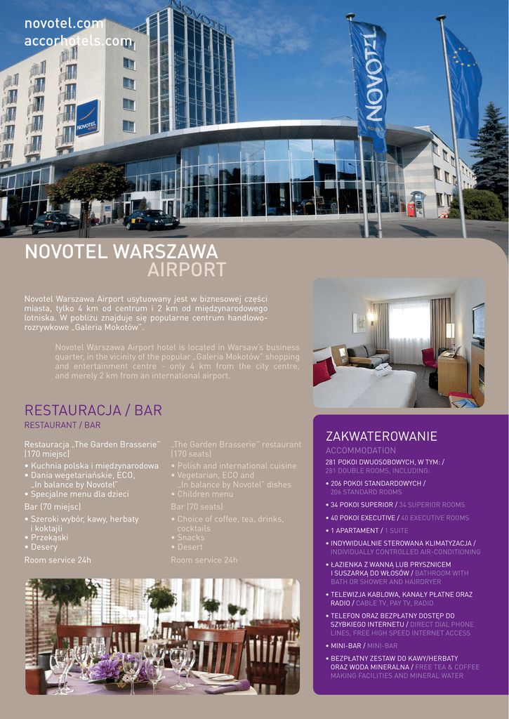 novotel.com accorhotels.com NOVOTEL WARSZAWA AIRPORT Novotel Warszawa Airport usytuowany jest w biznesowej części miasta, tylko 4 km od centrum i 2 km od międzynarodowego lotniska. W pobliżu znajduje się popularne centrum handloworozrywkowe „Galeria Mokotów”. Novotel Warszawa Airport hotel is located in Warsaw’s business quarter, in the vicinity of the popular „Galeria Mokotów” shopping and entertainment centre - only 4 km from the city centre, and merely 2 km from an international airport. RESTAURACJA / BAR RESTAURANT / BAR Restauracja „The Garden Brasserie” (170 miejsc) • Kuchnia polska i międzynarodowa • Dania wegetariańskie, ECO, „In balance by Novotel” • Specjalne menu dla dzieci Bar (70 miejsc) • Szeroki wybór, kawy, herbaty i koktajli • Przekąski • Desery Room service 24h „The Garden Brasserie” restaurant (170 seats) • Polish and international cuisine • Vegetarian, ECO and „In balance by Novotel” dishes • Children menu Bar (70 seats) • Choice of coffee, tea, drinks, cocktails • Snacks • Desert Room service 24h ZAKWATEROWANIE ACCOMMODATION 281 POKOI DWUOSOBOWYCH, W TYM: / 281 DOUBLE ROOMS, INCLUDING: • 206 POKOI STANDARDOWYCH / 206 STANDARD ROOMS • 34 POKOI SUPERIOR / 34 SUPERIOR ROOMS • 40 POKOI EXECUTIVE / 40 EXECUTIVE ROOMS • 1 APARTAMENT / 1 SUITE • INDYWIDUALNIE STEROWANA KLIMATYZACJA / INDIVIDUALLY CONTROLLED AIR-CONDITIONING • ŁAZIENKA Z WANNĄ LUB PRYSZNICEM I SUSZARKĄ DO WŁOSÓW / BATHROOM WITH BATH OR SHOWER AND HAIRDRYER • TELEWIZJA KABLOWA, KANAŁY PŁATNE ORAZ RADIO / CABLE TV, PAY TV, RADIO • TELEFON ORAZ BEZPŁATNY DOSTĘP DO SZYBKIEGO INTERNETU / DIRECT DIAL PHONE LINES, FREE HIGH SPEED INTERNET ACCESS • MINI-BAR / MINI-BAR • BEZPŁATNY ZESTAW DO KAWY/HERBATY ORAZ WODA MINERALNA / FREE TEA & COFFEE MAKING FACILITIES AND MINERAL WATER • 863 m2 nowoczesnej, klimatyzowanej powierzchni, idealnej do organizacji konferencji, prezentacji, bankietów • 9 sal wielofunkcyjnych gotowych pomieścić 735 osób • Jedna z największych sal konferencyjnych w Warszawie (600m2) • Szybkie, bezpłatne łącza internetowe w każdej sali konferencyjnej • Bezprzewodowy, bezpłatny internet w rejonach konferencyjnych • 863 m2 of modern, air-conditioned area, perfect for organization of conferences, presentations, banquets • 9 multifunctional rooms able to accommodate up to 735 people • One of the largest conference rooms in Warsaw (600m2) • Free high speed internet access in every conference room • Wireless internet access in conference area Konferencje i imprezy / Conferences and events • EKRAN, FLIPCHART Z PAPIEREM I PISAKAMI / SCREEN, FLIPCHARTS WITH PAPER AND MARKERS • NAGŁOŚNIENIE I MÓWNICA (W DUŻYCH SALACH) / SOUND SYSTEM AND LECTERN (IN LARGE ROOMS) • WODA MINERALNA / MINERAL WATER NA ŻYCZENIE: / ON REQUEST: • PROJEKTORY MULTIMEDIALNE / LCD PROJECTORS • TŁUMACZENIE SYMULTANICZNE / SIMULTANEOUS TRANSLATION • CYFROWE SYSTEMY GŁOSOWANIA / DIGITAL VOTING SYSTEMS • INNY SPRZĘT AUDIO-WIZUALNY / AUDIO-VISUAL EQUIPMENT USŁUGI I WYPOCZYNEK SERVICES AND LEISURE • ODKRYTY BASEN / OUTDOOR SWIMMING POOL • OGRÓD Z LETNIM TARASEM / GARDEN WITH SUMMER TERRACE • Bezpłatne zakwaterowanie ze śniadaniem dla 2 dzieci poniżej 16 roku życia / Accommodation and breakfast are free for 2 children under 16 years old • W niedzielę doba hotelowa do godziny 17.00 / 5 PM late check out on Sundays • BEZPŁATNY TRANSPORT HOTEL - LOTNISKO DLA GOŚCI INDYWIDUALNYCH / FREE AIRPORT SHUTTLE FOR INDIVIDUAL GUESTS • BEZPŁATNY PARKING DLA AUTOKARÓW / free CAR park FOR COACHES • Kącik zabaw, konsola Xbox 360 / Play area for children, Xbox 360 • 80 bezpłatnych miejsc na parkingu niestrzeżonym / free non-guarded CAR PARK up to 80 cars • Zdrowa i zbilansowana kuchnia / Healthy and balanced meals • 70 MIEJSC NA parkingU DOZOROWANYM (płatnyM) / supervised (Paid) CAR park UP TO 70 CARS TWÓJ CEL PODRÓŻY YOUR DESTINATION • pociągiem: Dworzec kolejowy Warszawa Centralna - 5 km / by train: Central Warsaw Rail Station - 5km • samolotem: Lotnisko F. Chopin Okęcie - 2 km / by plane: F. Chopin International Airport - 2 km Novotel Warszawa Airport ul. 1 Sierpnia 1 02-134 Warszawa Poland tel.: +48 22 575 60 00 fax: +48 22 575 69 99 e-mail: [email protected] novotel.com accorhotels.com