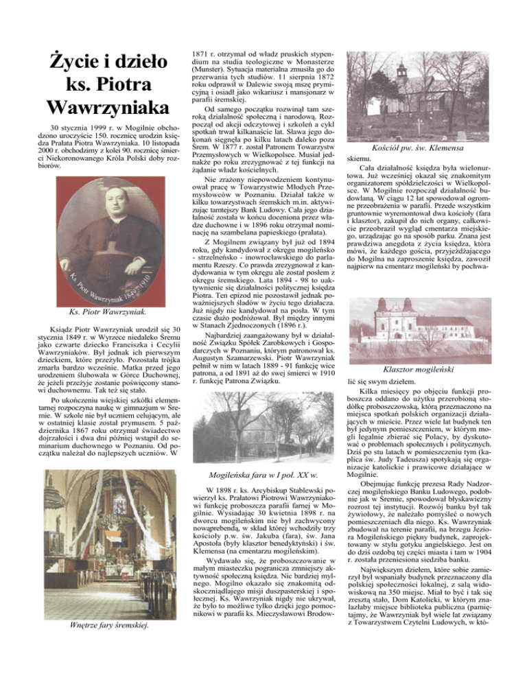 śycie i dzieło ks. Piotra Wawrzyniaka 30 stycznia 1999 r. w Mogilnie obchodzono uroczyście 150. rocznicę urodzin księdza Prałata Piotra Wawrzyniaka. 10 listopada 2000 r. obchodzimy z kolei 90. rocznicę śmierci Niekoronowanego Króla Polski doby rozbiorów. Ks. Piotr Wawrzyniak. Ksiądz Piotr Wawrzyniak urodził się 30 stycznia 1849 r. w Wyrzece niedaleko Śremu jako czwarte dziecko Franciszka i Cecylii Wawrzyniaków. Był jednak ich pierwszym dzieckiem, które przeŜyło. Pozostała trójka zmarła bardzo wcześnie. Matka przed jego urodzeniem ślubowała w Górce Duchownej, Ŝe jeŜeli przeŜyje zostanie poświęcony stanowi duchownemu. Tak teŜ się stało. Po ukończeniu wiejskiej szkółki elementarnej rozpoczyna naukę w gimnazjum w Śremie. W szkole nie był uczniem celującym, ale w ostatniej klasie został prymusem. 5 października 1867 roku otrzymał świadectwo dojrzałości i dwa dni później wstąpił do seminarium duchownego w Poznaniu. Od początku naleŜał do najlepszych uczniów. W 1871 r. otrzymał od władz pruskich stypendium na studia teologiczne w Monasterze (Munster). Sytuacja materialna zmusiła go do przerwania tych studiów. 11 sierpnia 1872 roku odprawił w Dalewie swoją mszę prymicyjną i osiadł jako wikariusz i mansjonarz w parafii śremskiej. Od samego początku rozwinął tam szeroką działalność społeczną i narodową. Rozpoczął od akcji odczytowej i szkoleń a cykl spotkań trwał kilkanaście lat. Sława jego dokonań sięgnęła po kilku latach daleko poza Śrem. W 1877 r. został Patronem Towarzystw Przemysłowych w Wielkopolsce. Musiał jednakŜe po roku zrezygnować z tej funkcji na Ŝądanie władz kościelnych. Nie zraŜony niepowodzeniem kontynuował pracę w Towarzystwie Młodych Przemysłowców w Poznaniu. Działał takŜe w kilku towarzystwach śremskich m.in. aktywizując tamtejszy Bank Ludowy. Cała jego działalność została w końcu doceniona przez władze duchowne i w 1896 roku otrzymał nominację na szambelana papieskiego (prałata). Z Mogilnem związany był juŜ od 1894 roku, gdy kandydował z okręgu mogileńsko - strzelneńsko - inowrocławskiego do parlamentu Rzeszy. Co prawda zrezygnował z kandydowania w tym okręgu ale został posłem z okręgu śremskiego. Lata 1894 - 98 to uaktywnienie się działalności politycznej księdza Piotra. Ten epizod nie pozostawił jednak powaŜniejszych śladów w Ŝyciu tego działacza. JuŜ nigdy nie kandydował na posła. W tym czasie duŜo podróŜował. Był między innymi w Stanach Zjednoczonych (1896 r.). Najbardziej zaangaŜowany był w działalność Związku Spółek Zarobkowych i Gospodarczych w Poznaniu, którym patronował ks. Augustyn Szamarzewski. Piotr Wawrzyniak pełnił w nim w latach 1889 - 91 funkcję wice patrona, a od 1891 aŜ do swej śmierci w 1910 r. funkcję Patrona Związku. Mogileńska fara w I poł. XX w. W 1898 r. ks. Arcybiskup Stablewski powierzył ks. Prałatowi Piotrowi Wawrzyniakowi funkcję proboszcza parafii farnej w Mogilnie. Wysiadając 30 kwietnia 1898 r. na dworcu mogileńskim nie był zachwycony nowąprebendą, w skład której wchodziły trzy kościoły p.w. św. Jakuba (fara), św. Jana Apostoła (były klasztor benedyktyński) i św. Klemensa (na cmentarzu mogileńskim). Wydawało się, Ŝe proboszczowanie w małym miasteczku pogranicza zmniejszy aktywność społeczną księdza. Nic bardziej mylnego. Mogilno okazało się znakomitą odskoczniądlajego misji duszpasterskiej i społecznej. Ks. Wawrzyniak nigdy nie ukrywał, Ŝe było to moŜliwe tylko dzięki jego pomocnikowi w parafii ks. Mieczysławowi Brodow- Wnętrze fary śremskiej. Kościół pw. św. Klemensa skiemu. Cała działalność księdza była wielonurtowa. JuŜ wcześniej okazał się znakomitym organizatorem spółdzielczości w Wielkopolsce. W Mogilnie rozpoczął działalność budowlaną. W ciągu 12 łat spowodował ogromne przeobraŜenia w parafii. Przede wszystkim gruntownie wyremontował dwa kościoły (fara i klasztor), zakupił do nich organy, całkowicie przeobraził wygląd cmentarza miejskiego, urządzając go na sposób parku. Znana jest prawdziwa anegdota z Ŝycia księdza, która mówi, Ŝe kaŜdego gościa, przyjeŜdŜającego do Mogilna na zaproszenie księdza, zawoził najpierw na cmentarz mogileński by pochwa- Klasztor mogileński lić się swym dziełem. Kilka miesięcy po objęciu funkcji proboszcza oddano do uŜytku przerobioną stodółkę proboszczowską, którą przeznaczono na miejsca spotkań polskich organizacji działających w mieście. Przez wiele lat budynek ten był jedynym pomieszczeniem, w którym mogli legalnie zbierać się Polacy, by dyskutować o problemach społecznych i politycznych. Dziś po stu latach w pomieszczeniu tym (kaplica św. Judy Tadeusza) spotykają się organizacje katolickie i prawicowe działające w Mogilnie. Obejmując funkcję prezesa Rady Nadzorczej mogileńskiego Banku Ludowego, podobnie jak w Śremie, spowodował błyskawiczny rozrost tej instytucji. Rozwój banku był tak Ŝywiołowy, Ŝe naleŜało pomyśleć o nowych pomieszczeniach dla niego. Ks. Wawrzyniak zbudował na terenie parafii, na brzegu Jeziora Mogileńskiego piękny budynek, zaprojektowany w stylu gotyku angielskiego. Jest on do dziś ozdobą tej części miasta i tam w 1904 r. została przeniesiona siedziba banku. Największym dziełem, które sobie zamierzył był wspaniały budynek przeznaczony dla polskiej społeczności lokalnej, z salą widowiskową na 350 miejsc. Miał to być i tak się zresztą stało, Dom Katolicki, w którym znalazłaby miejsce biblioteka publiczna (pamiętajmy, Ŝe Wawrzyniak był wiele lat związany z Towarzystwem Czytelni Ludowych, w któ- rym pełnił liczne i waŜne funkcje), a takŜe pomieszczenia dla róŜnych polskich organizacji społecznych. Budynek oddany do uŜytku po śmierci księdza do 1939 roku spełniał funkcje, do których był powołany. Obecnie Bank Ludowy. W głębi widoczny Dom Katolicki. 
