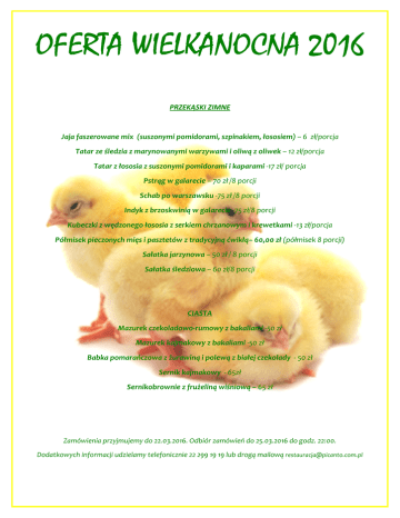 OFERTA WIELKANOCNA 2016 PRZEKĄSKI ZIMNE Jaja faszerowane mix (suszonymi pomidorami, szpinakiem, łososiem) – 6 zł/porcja Tatar ze śledzia z marynowanymi warzywami i oliwą z oliwek – 12 zł/porcja Tatar z łososia z suszonymi pomidorami i kaparami -17 zł/ porcja Pstrąg w galarecie – 70 zł /8 porcji Schab po warszawsku --75 zł /8 porcji Indyk z brzoskwinią w galarecie -75 zł/8 porcji Kubeczki z wędzonego łososia z serkiem chrzanowym i krewetkami -13 zł/porcja Półmisek pieczonych mięs i pasztetów z tradycyjną ćwikłą ćwikłą– 60,00 zł (półmisek 8 porcji) Sałatka jarzynowa – 50 zł / 8 porcji Sałatka śledziowa – 60 zł/8 porcji CIASTA Mazurek czekoladowo-rumowy czekoladowo rumowy z bakaliami -50 zł Mazurek kajmakowy z bakaliami -50 zł Babka pomarańczowa z żurawiną i polewą z białej czekolady - 50 zł Sernik kajmakowy - 65zł Sernikobrownie z frużeliną wiśniową – 65 zł Zamówienia przyjmujemy yjmujemy do 22.03.2016. 22 3.2016. Odbiór zamówień do 25.03 25.03.2016 6 do godz. 22:00. 22 Dodatkowych informacji udzielamy telefonicznie 22 299 19 19 lub drogą mailową [email protected]