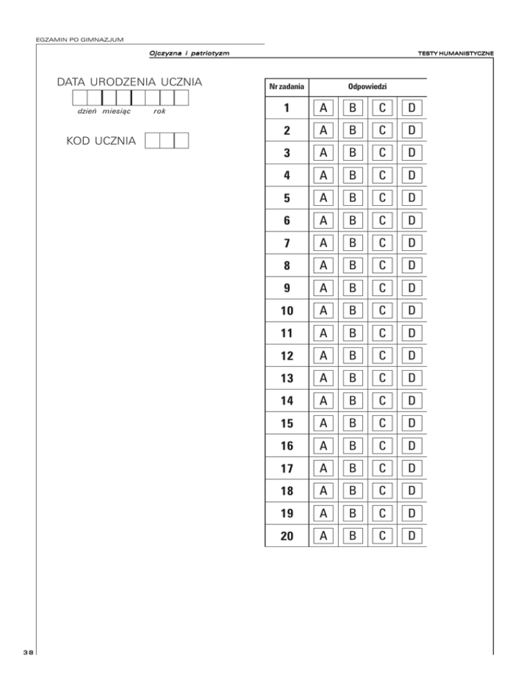 EGZAMIN PO GIMNAZJUM Ojczyzna i patriotyzm DATA URODZENIA UCZNIA dzień miesiąc KOD UCZNIA 38 rok TESTY HUMANISTYCZNE Nr zadania Odpowiedzi 1 A B C D 2 A B C D 3 A B C D 4 A B C D 5 A B C D 6 A B C D 7 A B C D 8 A B C D 9 A B C D 10 A B C D 11 A B C D 12 A B C D 13 A B C D 14 A B C D 15 A B C D 16 A B C D 17 A B C D 18 A B C D 19 A B C D 20 A B C D EGZAMIN PO GIMNAZJUM Ojczyzna i patriotyzm TESTY HUMANISTYCZNE Klucz i schemat oceniania zadań Plan testu Ojczyzna i patriotyzm Numery zadań Obszar standardów wymagań 1, 2, 3, 4, 5, 6, 7, 8, 9, 10, 11, 12, 13, 14, 15, 16, 17, 18, 19, 20, 21, 22, 23, 24 Czytanie i odbiór tekstów kultury Tworzenie własnego tekstu 25, 26, 27 Klucz odpowiedzi do zadań zamkniętych Numer zadania 1 2 3 4 5 6 7 8 9 10 Poprawna odpowiedź B C D A B A D C A C Numer zadania 11 12 13 14 15 16 17 18 19 20 Poprawna odpowiedź D A D C C A C D C C Zadania 21.–26. Jeśli w zadaniach punktowanych 0–1 wśród odpowiedzi poprawnych pojawią się odpowiedzi niepoprawne, uczeń otrzymuje 0 pkt za zadanie. Zadanie Kryteria i sposób punktowania Liczba punktów 21 Uczeń wiąŜe określenie krwią przepojony z tragiczną (pełną ofiar) historią Polski. 0–1 22 Przyznaje się punkty za odpowiedzi wynikające z tekstu, np.: Patrioci „na pokaz”. Demonstrują publicznie swój patriotyzm. Ludzie fałszywi (uniŜeni). Udając miłość ojczyzny, zabiegają o władzę (przychylność władzy). 0–1 0–1 23 Odpowiedź mieści się w formule: Ceni patriotyzm prawdziwy (głęboki, skromny), odrzuca patriotyzm fałszywy (płytki, na pokaz). 0–1 24 Uczeń wskazuje na szacunek (miłość) dla (do) ojczyzny. 0–1 25 I. Temat (0–6) Opisanie wszystkich waŜniejszych elementów treści obrazu (oficer z szablą, kosynier z kosą i dzbanem). 0–1 Wskazanie na tło, koloryt, nastrój. 0–1 II. Kompozycja Wypowiedź spójna, logicznie uporządkowana. 0–1 39 EGZAMIN PO GIMNAZJUM Ojczyzna i patriotyzm Zadanie TESTY HUMANISTYCZNE Kryteria i sposób punktowania Liczba punktów III. Język Nie więcej niŜ 2 błędy językowe. 0–1 IV. Ortografia Nie więcej niŜ 2 błędy ortograficzne. 0–1 V. Interpunkcja 26 Nie więcej niŜ 2 błędy interpunkcyjne. 0–1 Razem 0–6 I. Temat (0–3) Uczeń formułuje opinię i uzasadnia ją rzeczowo, ale powierzchownie 0–1 Uczeń formułuje opinię i uzasadnia ją rzeczowo i niepowierzchownie 0–1 II. Ortografia (0–1) Wypowiedź nie zawiera błędów ortograficznych – 1 pkt 27 0–1 I. Temat (0–6) Tekst we fragmentach zgodny z tematem. 0–1 Sformułowanie tezy. 0–1 Podanie co najmniej jednego przykładu z literatury i z historii. 0–1 Uzasadnienie wyboru jednego przykładu. 0–1 Uzasadnienie wyboru kolejnego przykładu. 0–1 Podsumowanie rozwaŜań. 0–1 II. Kompozycja (0–3) Tekst ma kompozycję trójdzielną. 0–1 Wypowiedź jest spójna (występują wskaźniki zespolenia). 0–1 Wypowiedź jest trójdzielna. 0–1 III. Język i styl (0–4) Poprawnie pod względem znaczeniowym stosowane słownictwo – równieŜ w związkach frazeologicznych; wyrazy uŜyte w poprawnych formach gramatycznych; poprawna składnia; brak raŜących powtórzeń. Trafnie dobrane środki językowe, brak wulgaryzmów, nieuzasadnionych kolokwializmów i powtórzeń, wielosłowia, wieloznaczności. 40 0–3 EGZAMIN PO GIMNAZJUM Ojczyzna i patriotyzm TESTY HUMANISTYCZNE Zadanie Kryteria i sposób punktowania Liczba punktów do 3 błędów – 3 pkt 4 błędy – 2 pkt 5 błędów – 1 pkt 6 błędów – 0 pkt Styl charakterystyczny dla wywodu argumentacyjnego. 0–1 IV. Ortografia i interpunkcja (0–3) Tekst poprawny pod względem ortograficznym. bez błędów – 2 pkt 1 błąd – 1 pkt 2 błędy – 0 pkt 0–2 Tekst poprawny pod względem interpunkcyjnym (dopuszczalne 3 błędy). 0–1 Razem 0–16 Uwaga! Jeśli praca jest nie na temat, uczeń otrzymuje 0 pkt. Jeśli praca jest krótsza niŜ połowa wyznaczonego miejsca, uczeń otrzymuje 0 pkt za kryteria nr II, II i IV. 41