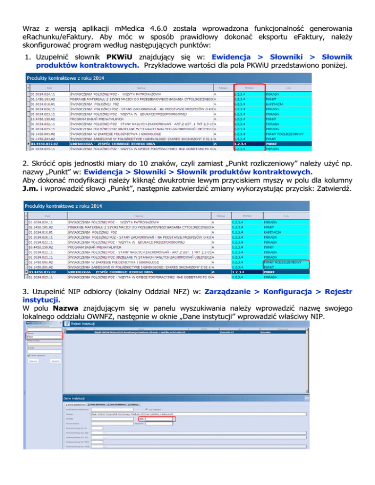Wraz z wersją aplikacji mMedica 4.6.0 została wprowadzona funkcjonalność generowania eRachunku/eFaktury. Aby móc w sposób prawidłowy dokonać eksportu eFaktury, należy skonfigurować program według następujących punktów: 1. Uzupełnić słownik PKWiU znajdujący się w: Ewidencja > Słowniki > Słownik produktów kontraktowych. Przykładowe wartości dla pola PKWiU przedstawiono poniżej. 2. Skrócić opis jednostki miary do 10 znaków, czyli zamiast „Punkt rozliczeniowy” należy użyć np. nazwy „Punkt” w: Ewidencja > Słowniki > Słownik produktów kontraktowych. Aby dokonać modyfikacji należy kliknąć dwukrotnie lewym przyciskiem myszy w polu dla kolumny J.m. i wprowadzić słowo „Punkt”, następnie zatwierdzić zmiany wykorzystując przycisk: Zatwierdź. 3. Uzupełnić NIP odbiorcy (lokalny Oddział NFZ) w: Zarządzanie > Konfiguracja > Rejestr instytucji. W polu Nazwa znajdującym się w panelu wyszukiwania należy wprowadzić nazwę swojego lokalnego oddziału OWNFZ, następnie w oknie „Dane instytucji” wprowadzić właściwy NIP. 4. Zweryfikować wartość w polu Nazwa znajdującym się w Zarządzanie > Konfiguracja > Dane Świadczeniodawcy-> Podmiot leczniczy*. Wprowadzenie niepoprawnej wartości w polu „Nazwa” spowoduje wyświetlenie w momencie importu dokumentu na Portalu Świadczeniodawcy ostrzeżenia o treści: (…) „Niepoprawna lub nieaktualna nazwa sprzedawcy (45088). W dokumencie przesłano: Błędna nazwa podmiotu”. (…) W przypadku uzyskania ostrzeżenia informującego o błędnej nazwie podmiotu proszę skontaktować się z lokalnym OWNFZ w celu ustalenia poprawnej wartości dla pola Nazwa Aby dokonać eksportu eRachunku/eFaktury należy w „Przeglądzie szablonów” podświetlić szablon i wybrać przycisk Nowy rachunek w celu utworzenia dokumentu rozliczeniowego. Po uzupełnieniu wymaganych pól oznaczonych (*) należy kliknąć przycisk Eksportuj eFakturę. Jeśli posiadają Państwo już utworzony rachunek/fakturę eksportu dokumentu mogą Państwo dokonać poprzez Przegląd Rachunków-> Dane -> Eksportuj eRachunek/eFakture W polu Interpretacja należy wskazać jedną z dwóch wyświetlanych wartości, których definicje zamieszczamy poniżej. Dane elektroniczne – Dokument nie jest fakturą elektroniczną w rozumieniu ustawy z dnia 11 marca 2004 r. o podatku od towarów i usług (Dz. U. z 2011 r. Nr 177, poz. 1054 z późn. zm.) i przepisów wydanych na jej podstawie. eDokument – Dokument jest fakturą elektroniczną w rozumieniu ustawy z dnia 11 marca 2004 r. o podatku od towarów i usług (Dz. U. z 2011 r. Nr 177, poz. 1054 z późn. zm.) i przepisów wydanych na jej podstawie lub rachunkiem elektronicznym lub notą elektroniczną. * Na podstawie ustawy o działalności leczniczej (Dz.U. z dnia 1 czerwca 2011 r. nr 112, poz. 654) zmieniła się definicja świadczeniodawcy i status prawny większości podmiotów udzielających świadczeń opieki zdrowotnej. W myśl tych przepisów podmiotem właściwym do złożenia oferty i zawarcia umowy z Narodowym Funduszem Zdrowia jest podmiot leczniczy, którego dane w aplikacji mMedica należy umieścić w oknie „Dane świadczeniodawcy” zakładka „Podmiot Leczniczy”. W związku z powyższym w elektronicznej fakturze jako dane sprzedawcy wysyłane będą dane umieszczone w zakładce „Podmiot Leczniczy”.