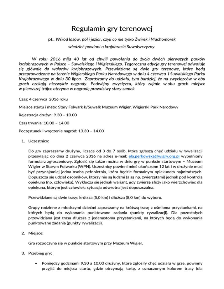 Regulamin gry terenowej pt.: Wśród lasów, pól i jezior, czyli co nie tylko Żwirek i Muchomorek wiedzieć powinni o krajobrazie Suwalszczyzny. W roku 2016 mija 40 lat od chwili powołania do życia dwóch pierwszych parków krajobrazowych w Polsce – Suwalskiego i Wigierskiego. Tegoroczna edycja gry terenowej odwołuje się głównie do walorów krajobrazowych. Przewidziane są dwie gry terenowe, które będą przeprowadzone na terenie Wigierskiego Parku Narodowego w dniu 4 czerwca i Suwalskiego Parku Krajobrazowego w dniu 30 lipca. Zapraszamy do udziału, tym bardziej, że na zwycięzców w obu grach czekają niezwykłe nagrody. Podwójny zwycięzca, który zajmie w obu grach miejsce w pierwszej trójce otrzyma w nagrodę prawdziwy stary zamek. Czas: 4 czerwca 2016 roku Miejsce startu i mety: Stary Folwark k/Suwałk Muzeum Wigier, Wigierski Park Narodowy Rejestracja drużyn: 9.30 – 10.00 Czas trwania: 10.00 – 14.00 Poczęstunek i wręczenie nagród: 13.30 – 14.00 1. Uczestnicy: Do gry zapraszamy drużyny, liczące od 3 do 7 osób, które zgłoszą chęć udziału w rywalizacji przesyłając do dnia 2 czerwca 2016 na adres e-mail: [email protected] wypełniony formularz zgłoszeniowy. Zgłosić się także można w dniu gry w punkcie startowym – Muzeum Wigier w Starym Folwarku (WPN). Uczestnicy powinni mieć ukończone 12 lat i w drużynie musi być przynajmniej jedna osoba pełnoletnia, która będzie formalnym opiekunem najmłodszych. Dopuszcza się udział osobników, którzy nie są ludźmi (a są np. zwierzętami) jednak pod kontrolą opiekuna (np. człowieka). Wyklucza się jednak wariant, gdy zwierzę służy jako wierzchowiec dla opiekuna, którym jest człowiek; sytuacja odwrotna jest dopuszczalna. Przewidziane są dwie trasy: krótsza (5,0 km) i dłuższa (8,0 km) do wyboru. Grupy rodzinne z młodszymi dziećmi zapraszamy na krótszą trasę z ośmioma przystankami, na których będą do wykonania punktowane zadania (punkty rywalizacji). Dla pozostałych przewidziana jest trasa dłuższa z jedenastoma przystankami, na których będą do wykonania punktowane zadania (punkty rywalizacji). 2. Miejsce: Gra rozpoczyna się w punkcie startowym przy Muzeum Wigier. 3. Przebieg gry: Pomiędzy godzinami 9.30 a 10.00 drużyny, które zgłosiły chęć udziału w grze, powinny przyjść do miejsca startu, gdzie otrzymają kartę, z oznaczonym kolorem trasy (dla uczestników, którzy będą mieli do pokonania trasę dłuższą przewidziane są dwa kolory – zielony i czerwony, a dla grup, które zamierzają pokonać trasę krótszą kolory różowy i błękitny) oraz polami, w których wpisywane będą wyniki rywalizacji. Osoby prowadzące rejestrację drużyn wskażą miejsce i czas rozpoczęcia gry przez poszczególne zespoły. Od wyznaczonego punktu startu do kolejnych punktów prowadzić będą kolorowe strzałki (czerwone i zielone lub różowe i błękitne). Przy rozpoczęciu gry (w miejscu startu), wpisany zostanie czas przystąpienia do rywalizacji (godzina i minuta). Na każdym z przystanków drużyny wykonywać będą zadania praktyczne i odpowiadać na pytania. Treść pytań dotyczyć będzie ogólnej wiedzy przyrodniczo-geograficznej, walorów przyrodniczych i kulturowych Wigierskiego Parku Narodowego bądź związanych z historią regionu – nie przekraczając zakresu informacji dostępnych w popularnym kwartalniku „Wigry” (zob. www.wigry.org.pl/kwartalnik/) . Za każde dobrze wykonane zadanie lub prawidłową odpowiedź drużyna otrzymuje 10 punktów ujemnych. W przypadku odpowiedzi błędnej lub nie wykonania zadania praktycznego drużyna otrzymuje 10 punktów dodatnich. Sumę uzyskanych punktów odnotuje na karcie drużyny osoba prowadząca grę na poszczególnych przystankach. 4. Wyniki: Po pokonaniu całej trasy („zaliczeniu” wszystkich punktów) drużyny zgłaszać się będą do punktu końcowego (mety) przy Muzeum Wigier, gdzie nastąpi wpisanie do karty czasu zakończenia rywalizacji (godziny i minuty). Punktowy wynik każdej drużyny zostanie obliczony przez jury według następującej formuły: Liczba minut spędzonych na trasie (1 minuta = 1 pkt) + suma punktów uzyskanych na wszystkich stanowiskach. W grze terenowej zwycięży drużyna, która uzyska najmniejszą liczbę punktów związaną z pokonaniem trasy i największą liczbę punktów z zadań wykonanych na trasie. 5. Nagrody: W grze wygrywa każdy uczestnik, gdyż na każdym z przystanków otrzyma drobny upominek. Nagrody rzeczowe otrzymają 3 zwycięskie drużyny oraz drużyny wyróżnione przez jury.