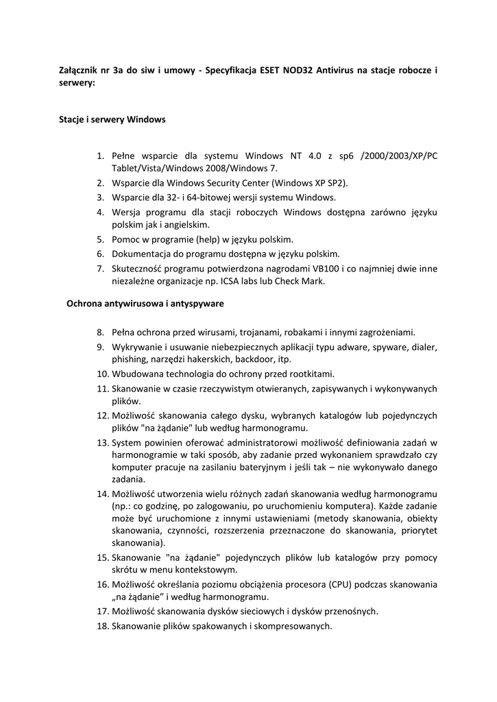 Załącznik nr 3a do siw i umowy - Specyfikacja ESET NOD32 Antivirus na stacje robocze i serwery: Stacje i serwery Windows 1. Pełne wsparcie dla systemu Windows NT 4.0 z sp6 /2000/2003/XP/PC Tablet/Vista/Windows 2008/Windows 7. 2. Wsparcie dla Windows Security Center (Windows XP SP2). 3. Wsparcie dla 32- i 64-bitowej wersji systemu Windows. 4. Wersja programu dla stacji roboczych Windows dostępna zarówno języku polskim jak i angielskim. 5. Pomoc w programie (help) w języku polskim. 6. Dokumentacja do programu dostępna w języku polskim. 7. Skutecznośd programu potwierdzona nagrodami VB100 i co najmniej dwie inne niezależne organizacje np. ICSA labs lub Check Mark. Ochrona antywirusowa i antyspyware 8. Pełna ochrona przed wirusami, trojanami, robakami i innymi zagrożeniami. 9. Wykrywanie i usuwanie niebezpiecznych aplikacji typu adware, spyware, dialer, phishing, narzędzi hakerskich, backdoor, itp. 10. Wbudowana technologia do ochrony przed rootkitami. 11. Skanowanie w czasie rzeczywistym otwieranych, zapisywanych i wykonywanych plików. 12. Możliwośd skanowania całego dysku, wybranych katalogów lub pojedynczych plików "na żądanie" lub według harmonogramu. 13. System powinien oferowad administratorowi możliwośd definiowania zadao w harmonogramie w taki sposób, aby zadanie przed wykonaniem sprawdzało czy komputer pracuje na zasilaniu bateryjnym i jeśli tak – nie wykonywało danego zadania. 14. Możliwośd utworzenia wielu różnych zadao skanowania według harmonogramu (np.: co godzinę, po zalogowaniu, po uruchomieniu komputera). Każde zadanie może byd uruchomione z innymi ustawieniami (metody skanowania, obiekty skanowania, czynności, rozszerzenia przeznaczone do skanowania, priorytet skanowania). 15. Skanowanie "na żądanie" pojedynczych plików lub katalogów przy pomocy skrótu w menu kontekstowym. 16. Możliwośd określania poziomu obciążenia procesora (CPU) podczas skanowania „na żądanie” i według harmonogramu. 17. Możliwośd skanowania dysków sieciowych i dysków przenośnych. 18. Skanowanie plików spakowanych i skompresowanych. 19. Możliwośd definiowania listy rozszerzeo plików, które mają byd skanowane (w tym z uwzględnieniem plików bez rozszerzeo). 20. Możliwośd umieszczenia na liście wyłączeo ze skanowania wybranych plików, katalogów lub plików o określonych rozszerzeniach. 21. Brak konieczności ponownego uruchomienia (restartu) komputera po instalacji programu. 22. Możliwośd przeniesienia zainfekowanych plików i załączników poczty w bezpieczny obszar dysku (do katalogu kwarantanny) w celu dalszej kontroli. Pliki muszą byd przechowywane w katalogu kwarantanny w postaci zaszyfrowanej. 23. Wbudowany konektor dla programów MS Outlook, Outlook Express, Windows Mail, Mozilla Thunderbird i Windows Live Mail (funkcje programu dostępne są bezpośrednio z menu programu pocztowego). 24. Skanowanie i oczyszczanie w czasie rzeczywistym poczty przychodzącej i wychodzącej obsługiwanej przy pomocy programu MS Outlook, Outlook Express, Windows Mail, Mozilla Thunderbird i Windows Live Mail 25. Skanowanie i oczyszczanie poczty przychodzącej POP3 "w locie" (w czasie rzeczywistym), zanim zostanie dostarczona do klienta pocztowego zainstalowanego na stacji roboczej (niezależnie od konkretnego klienta pocztowego). 26. Automatyczna integracja skanera POP3 z dowolnym klientem pocztowym bez konieczności zmian w konfiguracji. 27. Możliwośd definiowania różnych portów dla POP3, na których ma odbywad się skanowanie. 28. Możliwośd opcjonalnego dołączenia informacji o przeskanowaniu do każdej odbieranej wiadomości e-mail lub tylko do zainfekowanych wiadomości e-mail. 29. Możliwośd skanowania na żądanie lub według harmonogramu baz Outlook Express-a. 30. Skanowanie ruchu HTTP na poziomie stacji roboczych. Zainfekowany ruch jest automatycznie blokowany a użytkownikowi wyświetlane jest stosowne powiadomienie. 31. Blokowanie możliwości przeglądania wybranych stron internetowych. Listę blokowanych stron internetowych określa administrator. Program musi umożliwid blokowanie danej strony internetowej po podaniu na liście całej nazwy strony lub tylko wybranego słowa występujące w nawie strony. 32. Automatyczna integracja z dowolną przeglądarką internetową bez konieczności zmian w konfiguracji. 33. Możliwośd definiowania różnych portów dla HTTP, na których ma odbywad się skanowanie. 34. Wbudowane dwa niezależne moduły heurystyczne – jeden wykorzystujący pasywne metody heurystyczne (heurystyka) i drugi wykorzystujący aktywne metody heurystyczne oraz elementy sztucznej inteligencji (zaawansowana heurystyka). Musi istnied możliwośd wyboru, z jaką heurystyka ma odbywad się skanowanie – z użyciem jednej i/lub obu metod jednocześnie. 35. Możliwośd skanowania wyłącznie z zastosowaniem algorytmów heurystycznych tj. wyłączenie skanowania przy pomocy sygnatur baz wirusów. 36. Aktualizacje modułów analizy heurystycznej. 37. Możliwośd automatycznego wysyłania nowych zagrożeo (wykrytych przez metody heurystyczne) do laboratoriów producenta bezpośrednio z programu (nie wymaga ingerencji użytkownika). Użytkownik musi mied możliwośd określenia rozszerzeo dla plików, które nie powinny byd wysyłane automatycznie, oraz czy próbki zagrożeo powinny byd wysyłane w pełni automatycznie czy też po dodatkowym potwierdzeniu przez użytkownika. 38. Możliwośd wysyłania wraz z próbką komentarza dotyczącego nowego zagrożenia i adresu e-mail użytkownika, na który producent może wysład dodatkowe pytania dotyczące zgłaszanego zagrożenia. 39. Wysyłanie zagrożeo do laboratorium powinno byd możliwe z serwera zdalnego zarządzania i lokalnie z każdej stacji roboczej w przypadku komputerów mobilnych. 40. Dane statystyczne zbierane przez producenta na podstawie otrzymanych próbek nowych zagrożeo powinny byd w pełni anonimowe. 41. Możliwośd ręcznego wysłania próbki noweg