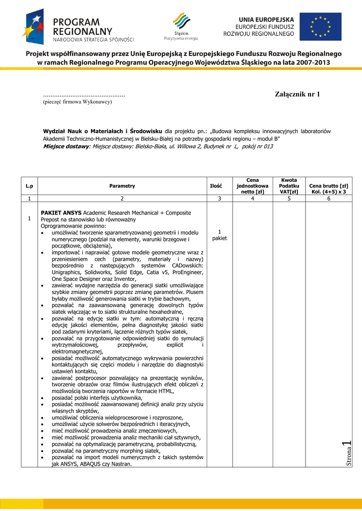 Załącznik nr 1 ............................................. (pieczęć firmowa Wykonawcy) Wydział Nauk o Materiałach i Środowisku dla projektu pn.: „Budowa kompleksu innowacyjnych laboratoriów Akademii Techniczno-Humanistycznej w Bielsku-Białej na potrzeby gospodarki regionu – moduł B” Miejsce dostawy: Miejsce dostawy: Bielsko-Biała, ul. Willowa 2, Budynek nr L, pokój nr 013 1 2 1 PAKIET ANSYS Academic Researeh Mechanical + Composite Prepost na stanowisko lub równoważny Oprogramowanie powinno: umożliwiać tworzenie sparametryzowanej geometrii i modelu numerycznego (podział na elementy, warunki brzegowe i początkowe, obciążenia), importować i naprawiać gotowe modele geometryczne wraz z przeniesieniem cech (parametry, materiały i nazwy) bezpośrednio z następujących systemów CADowskich: Unigraphics, Solidworks, Solid Edge, Catia v5, ProEngineer, One Space Designer oraz Inventor, zawierać wydajne narzędzia do generacji siatki umożliwiające szybkie zmiany geometrii poprzez zmianę parametrów. Plusem byłaby możliwość generowania siatki w trybie bachowym, pozwalać na zaawansowaną generację dowolnych typów siatek włączając w to siatki strukturalne hexahedralne, pozwalać na edycję siatki w tym: automatyczną i ręczną edycję jakości elementów, pełna diagnostykę jakości siatki pod zadanymi kryteriami, łączenie różnych typów siatek, pozwalać na przygotowanie odpowiedniej siatki do symulacji wytrzymałościowej, przepływów, explicit i elektromagnetycznej, posiadać możliwość automatycznego wykrywania powierzchni kontaktujących się części modelu i narzędzie do diagnostyki ustawień kontaktu, zawierać postprocesor pozwalający na prezentację wyników, tworzenie obrazów oraz filmów ilustrujących efekt obliczeń z możliwością tworzenia raportów w formacie HTML, posiadać polski interfejs użytkownika, posiadać możliwość zaawansowanej definicji analiz przy użyciu własnych skryptów, umożliwiać obliczenia wieloprocesorowe i rozproszone, umożliwiać użycie solwerów bezpośrednich i iteracyjnych, mieć możliwość prowadzenia analiz zmęczeniowych, mieć możliwość prowadzenia analiz mechaniki ciał sztywnych, pozwalać na optymalizację parametryczną, probabilistyczną, pozwalać na parametryczny morphing siatek, pozwalać na import modeli numerycznych z takich systemów jak ANSYS, ABAQUS czy Nastran. Ilość 3 Cena jednostkowa netto [zł] Kwota Podatku VAT[zł] Cena brutto [zł] Kol. (4+5) x 3 4 5 6 1 pakiet 1 Parametry Strona L.p System nie powinien mieć żadnych ograniczeń jeśli chodzi o wielkość analizowanego modelu (liczba węzłów). Standardowo powinien umożliwiać prowadzenie obliczeń równoległych na 4 procesorach wraz z możliwością rozbudowy. Dodatkowo oprogramowanie powinno zapewnić dwu trójwymiarową analizę następujących zagadnień: i 1.Analiza wytrzymałościowa - analiza pól odkształceń i naprężeń materiałów i konstrukcji z uwzględnieniem: -nieliniowości geometrycznych, -nieliniowości materiałowych; modele sprężysto-plastyczne, hiperelastyczne, lepkoplastyczne, lepkosprężyste, anizotropowe modele plastyczności, -zagadnień dynamicznych - wyboczenia liniowego (wyznaczanie Eulerowskiej siły krytycznej) i nieliniowego (zachowanie się konstrukcji po utracie stateczności) -zagadnień kontaktu -delaminacji, pęknięć (wyznaczanie WIN i całki J) -optymalizacji wielokryterialnej - adaptacyjnego siatkowania - submodelingu i cyklicznej symetrii 2.Analiza termiczna dla stanów ustalonych oraz zmiennych w czasie uwzględniająca: -przewodność -konwekcję -promieniowanie -przemiany fazowe -wewnętrzne źródła ciepła -użycie uzyskanych pól temperatur jako obciążenia w analizie wytrzymałościowej 3.Analizy elektromagnetyczne: - elektrostatyka (obrazy pola elektrycznego, siły elektrostatyczne, obliczenia pojemności), - magnetostatyka, analiza harmoniczna i w stanie nieustalonym, - analiza obwodów: oporniki, kondensatory, cewki indukcyjne, diody, transformatory, źródła prądu i napięcia, - wysokoczęstotliwościowy elektromagnetyzm Strona 5.Analiza pól sprzężonych (bezpośrednie sprzężenie oraz metodę transferu obciążeń): Rodzaje sprzężeń: - termika/wytrzymałość -elektromagnetyzm/termika, elektromagnetyzm/termika/wytrzymałość (grzanie indukcyjne, RF, chłodzenie Peltiera) - elektrostatyka/wytrzymałość (MEMS) magnetyzm/wytrzymałość (solenoidy, maszyny elektromagnetyczne) - elektromagnetyzm/wytrzymałość (EFI) 2 4.Symulacje szybkozmiennych nieliniowych zjawisk Oprogramowanie powinno pozwalać na analizy typu explicit (Cash testy, wybuchy itp.), łącznie z powiązaniem tych analiz z analizami tylu implicit. Powinno pozwalać na symulację metodami Eulera, Lagranga i SPH. - piezoelektryki (mikrofony, sensory, aktuatory, rezonatory, przetworniki) - piezooporniki (akcelerometry, mierniki odkształcenia, czujniki ciśnienia) - elektryczność/termika/wytrzymałość/magnetyzm (IC, PCB, aktuatory MEMS) Parametry modułu do obliczeń kompozytów: - posiada narzędzia do właściwej oceny wad i zniszczenia, a także informacji technologicznych takich jak: laminacja, czy indentyfikacja warstw. Analiza zniszczeń w oparciu o: - proste kryteria (maks. naprężenie) po wyszukane kryteria dla kompozytów (Puck, Hashin, Cuntze), - wewnętrzne ścinanie, naprężenia normalne dla elementów shells, - zniszczenie przebiegające na grubości. Kombinację kryteriów uszkodzeń z kryterium pokrycia: - 3D wymiarowa implementacja głównych kryteriów (Tsai-Hill, Hashin, Puck, itd.) - możliwość tworzenia własnego kryterium. Prezentacja wyników jako: - dominujące kryterium zniszczenia - wartości krytyczne warstwy. Określanie współczynników bezpieczeństwa np. na bazie wartości granicznych naprężeń - standardowe prezentacje wyników (np. naprężeń) na warstwach. Nazwa pakietu: ………………………………………………………