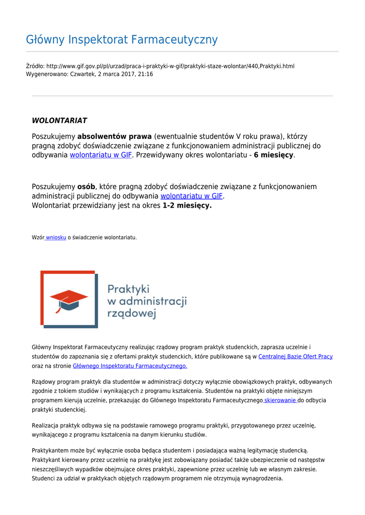 Główny Inspektorat Farmaceutyczny Źródło: http://www.gif.gov.pl/pl/urzad/praca-i-praktyki-w-gif/praktyki-staze-wolontar/440,Praktyki.html Wygenerowano: Czwartek, 2 marca 2017, 21:16 WOLONTARIAT Poszukujemy absolwentów prawa (ewentualnie studentów V roku prawa), którzy pragną zdobyć doświadczenie związane z funkcjonowaniem administracji publicznej do odbywania wolontariatu w GIF. Przewidywany okres wolontariatu - 6 miesięcy. Poszukujemy osób, które pragną zdobyć doświadczenie związane z funkcjonowaniem administracji publicznej do odbywania wolontariatu w GIF. Wolontariat przewidziany jest na okres 1-2 miesięcy. Wzór wniosku o świadczenie wolontariatu. Główny Inspektorat Farmaceutyczny realizując rządowy program praktyk studenckich, zaprasza uczelnie i studentów do zapoznania się z ofertami praktyk studenckich, które publikowane są w Centralnej Bazie Ofert Pracy oraz na stronie Głównego Inspektoratu Farmaceutycznego. Rządowy program praktyk dla studentów w administracji dotyczy wyłącznie obowiązkowych praktyk, odbywanych zgodnie z tokiem studiów i wynikających z programu kształcenia. Studentów na praktyki objęte niniejszym programem kierują uczelnie, przekazując do Głównego Inspektoratu Farmaceutycznego skierowanie do odbycia praktyki studenckiej. Realizacja praktyk odbywa się na podstawie ramowego programu praktyki, przygotowanego przez uczelnię, wynikającego z programu kształcenia na danym kierunku studiów. Praktykantem może być wyłącznie osoba będąca studentem i posiadająca ważną legitymację studencką. Praktykant kierowany przez uczelnię na praktykę jest zobowiązany posiadać także ubezpieczenie od następstw nieszczęśliwych wypadków obejmujące okres praktyki, zapewnione przez uczelnię lub we własnym zakresie. Studenci za udział w praktykach objętych rządowym programem nie otrzymują wynagrodzenia. Praktyka odbywa się na podstawie pisemnego porozumienia dotyczącego przyjęcia na praktykę studencką zawartego między uczelnią a Głównym Inspektoratem Farmaceutycznym. Szczegółowe informacje o ofertach praktyk studenckich w Głównym Inspektoracie Farmaceutycznym można uzyskać pod numerem telefonu 22 44 10 734 oraz poprzez kontakt e-mailowy: [email protected] Materiały informacyjne dotyczące zasad odbywania praktyk studenckich w administracji rządowej w 2015 r. są dostępne na stronie Biuletynu Informacji Publicznej Kancelarii Prezesa Rady Ministrów. Staż absolwencki w GIF Główny Inspektorat Farmaceutyczny informuję, iż na podstawie art. 53 ustawy z dnia 20.04.2004 r. o promocji zatrudnienia i instytucjach rynku pracy (Dz.U. Nr 99, poz. 1001 z późn. zm.) i rozporządzenia Ministra Gospodarki i Pracy z dnia 24 sierpnia 2004r. w sprawie szczegółowych warunków odbywania stażu oraz przygotowania zawodowego w miejscu pracy (Dz. U. nr 185, poz. 1912 z późn. zm.),osoby bezrobotne do 25 roku życia, jak również bezrobotni, w okresie 12 miesięcy od dnia określonego w dokumencie poświadczającym ukończenie szkoły wyższej, którzy nie ukończyli 27 roku życia, mają możliwość ubiegania się we właściwym Urzędzie Pracy o skierowanie do odbycia stażu, na okres nie przekraczający 12 miesięcy. Warunkiem przystąpienia przez bezrobotnego do odbycia stażu jest konieczność rejestracji we właściwym Urzędzie Pracy. Po dopełnieniu obowiązku rejestracji oraz zakwalifikowaniu wniosku o przyznanie stażu, bezrobotny może zostać skierowany na staż trwający nie dłużej niż 6 miesięcy. W przypadku bezrobotnych, którzy nie ukończyli 25 roku życia staż może trwać nawet do 12 miesięcy. Staż absolwencki odbywany jest na podstawie umowy zawartej pomiędzy właściwym Urzędem Pracy a Głównym Inspektoratem Farmaceutycznym, określająca prawa i obowiązki obu stron w czasie trwania stażu. Staż jest finansowany w całości przez Urząd Pracy. W celu uzyskania szczegółowych informacji odnośnie organizacji praktyk, staży i wolontariatu w Głównym Inspektoracie Farmaceutycznym można kontaktować się z Wydziałem Organizacyjnym Biura Dyrektora Generalnego pod numerem 0-22-44-10-735, 0-22-44-10-734.