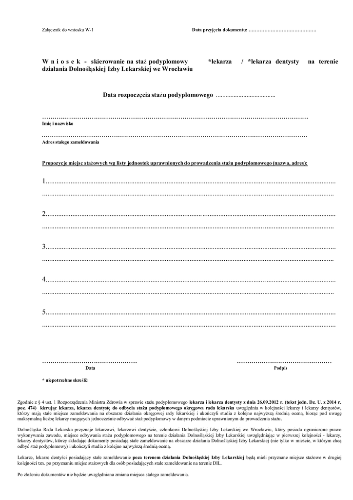Data przyjęcia dokumentu: ……………………………………. Załącznik do wniosku W-1 W n i o s e k - skierowanie na staż podyplomowy działania Dolnośląskiej Izby Lekarskiej we Wrocławiu *lekarza / *lekarza dentysty na terenie Data rozpoczęcia stażu podyplomowego ..................................... ................................................................................................................................. Imię i nazwisko ................................................................................................................................. Adres stałego zameldowania Propozycje miejsc stażowych wg listy jednostek uprawnionych do prowadzenia stażu podyplomowego (nazwa, adres): 1................................................................................................................................................................... .................................................................................................................................................................... 2................................................................................................................................................................... .................................................................................................................................................................... 3................................................................................................................................................................... .................................................................................................................................................................... 4................................................................................................................................................................... .................................................................................................................................................................... 5................................................................................................................................................................... ..................................................................................................................................................................... .............................................. Data .............................................. Podpis * niepotrzebne skreślić Zgodnie z § 4 ust. 1 Rozporządzenia Ministra Zdrowia w sprawie stażu podyplomowego lekarza i lekarza dentysty z dnia 26.09.2012 r. (tekst jedn. Dz. U. z 2014 r. poz. 474) kierując lekarza, lekarza dentystę do odbycia stażu podyplomowego okręgowa rada lekarska uwzględnia w kolejności lekarzy i lekarzy dentystów, którzy mają stałe miejsce zameldowania na obszarze działania okręgowej rady lekarskiej i ukończyli studia z kolejno najwyższą średnią oceną, biorąc pod uwagę maksymalną liczbę lekarzy mogących jednocześnie odbywać staż podyplomowy w danym podmiocie uprawnionym do prowadzenia stażu. Dolnośląska Rada Lekarska przyznaje lekarzowi, lekarzowi dentyście, członkowi Dolnośląskiej Izby Lekarskiej we Wrocławiu, który posiada ograniczone prawo wykonywania zawodu, miejsce odbywania stażu podyplomowego na terenie działania Dolnośląskiej Izby Lekarskiej uwzględniając w pierwszej kolejności - lekarzy, lekarzy dentystów, którzy składając dokumenty posiadają stałe zameldowanie na obszarze działania Dolnośląskiej Izby Lekarskiej (nie tylko w mieście, w którym chcą odbyć staż podyplomowy) i ukończyli studia z kolejno najwyższą średnią oceną. Lekarze, lekarze dentyści posiadający stałe zameldowanie poza terenem działania Dolnośląskiej Izby Lekarskiej będą mieli przyznane miejsce stażowe w drugiej kolejności tzn. po przyznaniu miejsc stażowych dla osób posiadających stałe zameldowanie na terenie DIL. Po złożeniu dokumentów nie będzie uwzględniana zmiana miejsca stałego zameldowania.
