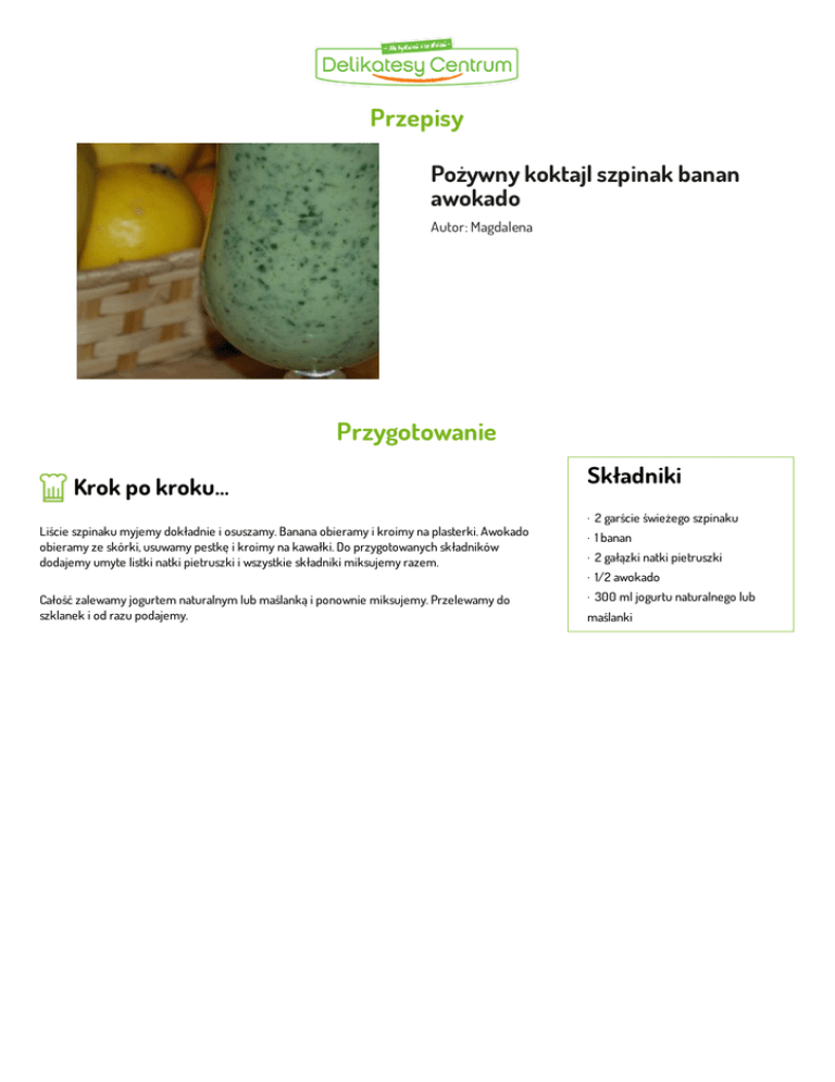 Przepisy Pożywny koktajl szpinak banan awokado Autor: Magdalena Przygotowanie Krok po kroku... Liście szpinaku myjemy dokładnie i osuszamy. Banana obieramy i kroimy na plasterki. Awokado obieramy ze skórki, usuwamy pestkę i kroimy na kawałki. Do przygotowanych składników dodajemy umyte listki natki pietruszki i wszystkie składniki miksujemy razem. Całość zalewamy jogurtem naturalnym lub maślanką i ponownie miksujemy. Przelewamy do szklanek i od razu podajemy. Składniki · 2 garście świeżego szpinaku · 1 banan · 2 gałązki natki pietruszki · 1/2 awokado · 300 ml jogurtu naturalnego lub maślanki