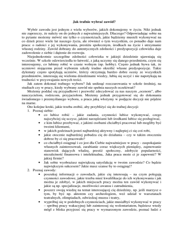 Jak trafnie wybra zawód? Wybór zawodu jest jednym z wielu wyborów, jakich dokonujemy w yciu. Nikt jednak nie zaprzeczy, e nale y on do jednych z najwa niejszych. Dlaczego? Odpowiadaj c sobie na to pytanie mo emy mówi nie tylko o czynno ciach, jakie b dziemy musieli wykonywa na co dzie przez wiele lat naszego ycia, ale równie o tym wszystkim, co ponadto daje nam praca: o rado ci z jej wykonywania, presti u społecznym, rodkach na ycie i utrzymanie własnej rodziny. Zawód dobrany do autentycznych zdolno ci i predyspozycji człowieka daje zadowolenie z siebie i d enie do rozwoju. Niejednokrotnie szczególne zdolno ci człowieka w jakiej dziedzinie ujawniaj si wcze nie. W szkole odzwierciedla to łatwo , z jak uczymy si danego przedmiotu, czym si interesujemy, co lubimy robi w czasie wolnym (np. hobby). Cz sto jednak bywa tak, e uczniowi stoj cemu przed wyborem szkoły trudno okre li własne predyspozycje. Takie dylematy cz sto spotykaj uczniów, którzy otrzymuj bardzo dobre oceny ze wszystkich przedmiotów, interesuj si wieloma dziedzinami wiedzy, lubi si uczy i nie napotykaj na trudno ci w przyswajaniu nowych tre ci. Jak zatem dokona trafnego wyboru? Jak unikn rozczarowania w szkole redniej, na studiach czy w pracy, kiedy wybrany zawód nie spełnia naszych oczekiwa ? Mo emy podda si przypadkowi i pozwoli zdecydowa za nas naszym „ocenom”, albo nauczycielom, rodzicom, przyjaciołom. Mo emy jednak przygotowa si do dokonania wiadomego i przemy lanego wyboru, a praca jak wło ymy w podj cie decyzji nie pójdzie na marne. Oto kolejne kroki, jakie trzeba zrobi , aby przybli y si do trafnej decyzji: 1. Poznaj siebie: • co lubisz robi – jakie zadania, czynno ci lubisz wykonywa , czego najszybciej si uczysz, jakimi narz dziami lub rodkami lubisz si posługiwa , • z kim lubisz przebywa , z jakimi osobami chciałby pracowa lub mogliby by twoimi klientami, • w jakich godzinach jeste najbardziej aktywny i najlepiej ci si co robi, • jakie otocznie najbardziej pobudza ci do działania – czy w takim otoczeniu dobrze by ci si pracowało? • co chciałby osi gn i co jest dla Ciebie najwa niejsze w pracy - zaspokajanie własnych zainteresowa , zarabianie coraz wi kszych pieni dzy, zajmowanie stanowisk daj cych władz , presti społeczny, zdobycie popularno ci, niezale no finansowa i intelektualna,. Jaka praca mo e ci je zapewni ? W jakiej firmie? • Jak sobie wyobra asz najwi ksz satysfakcj w twoim zawodzie? Co b dzie najwi kszym sukcesem? Jakie masz szanse by to osi gn ? 2. Poznaj zawody: • poszukuj informacji o zawodach, jakie ci interesuj – na czym polegaj czynno ci zawodowe, jakie trzeba mie kwalifikacje do ich wykonywania i jak mo na je zdoby , w jakich miejscach pracy mo na ten zawód wykonywa i jakie s np. specjalizacje, mo liwo ci awansu i zatrudnienia, • poszerz swoj wiedz na temat interesuj cej ci dziedziny, np. je li marzysz o tym, by by np. aktorem czy archeologiem, we udział w warsztatach teatralnych, olimpiadach, odwiedzaj muzea i teatry, • wypróbuj si w podobnych czynno ciach, jakie musiałby wykonywa w pracy – spróbuj pracy wakacyjnej lub zainteresuj si wolontariatem, b dziesz wtedy mógł z bliska przyjrze si pracy w wymarzonym zawodzie, pozna ludzi z bran y, pozyska niezb dne informacje dla zdobywania wiedzy i umiej tno ci zawodowych, • porozmawiaj z osob , która wykonuje zawód o którym marzysz. Podczas rozmowy b dziesz mógł zweryfikowa swoje opinie na temat zawodu, szkoły, dosta praktyczne rady. 3. Zaplanuj cie k kariery: • je li znajdziesz zawód, który odzwierciedla twoje zdolno ci i predyspozycje, pozwoli ci w przyszło ci zrealizowa to o czym marzysz, upewnij si , e twoje wyobra enia na temat zawodu s zgodne z rzeczywisto ci , • dowiedz si jak i gdzie mo esz si tego zawodu nauczy – poszukaj szkół w ró nych miejscowo ciach, oce koszty zdobycia wykształcenia i wybierz najbardziej odpowiadaj c ci placówk , • okre l co chcesz osi gn w danym zawodzie (np. specjalizacj , awans) i wpisz to do swojego planu. Zastanów si , jak mo na to osi gn . • Na swojej drodze podejmowania yciowych decyzji jeszcze niejednokrotnie b dziesz si zastanawiał nad słuszno ci obranej drogi, celno ci dokonanych wyborów, dokonywał zmian i przeróbek swoich planów. Im jednak bardziej wnikliwie i wiadomie zastanowisz si nad swoj przyszło ci zawodow , b dzie ci łatwiej podejmowa trafniejsze decyzje. Poradnia Psychologiczno-Pedagogiczna w Brzegu prowadzi dział poradnictwa zawodowego dla młodzie y szkół gimnazjalnych i ponadgimnazjalych. Pracownicy poradni realizuj na terenie szkół zaj cia z zakresu orientacji i poradnictwa zawodowego, na których młodzie przygotowuje si do podj cia decyzji dotycz cych wyboru szkoły na kolejnym etapie edukacyjnym. W I semestrze roku szkolnego 2005/20006 w zaj ciach o tej tematyce wzi ło udział 250 uczniów. Organizowane s równie spotkania z rodzicami o tym, jak pomaga dzieciom w podejmowaniu decyzji dotycz cych wyboru szkoły i zawodu. Aby przybli y uczniom szkół ponadgimnazjalnych, rozwa aj cych podj cie nauki na studiach wy szych, przygotowano cykl spotka zawodoznawczych, umo liwiaj cych zdobycie praktycznych informacji o zawodach i mo liwo ciach kształcenia. Spotkania te zostały przygotowane przez pracowników placówek o wiatowych - Poradni PsychologicznoPedagogicznej w Brzegu – mgr El biet Neroj – dyrektora, psychologa, mgr Renat StraubPieczykolan oraz Biblioteki Pedagogicznej w Brzegu - mgr Ew Schroeder-Kustr kierownika i mgr Ann Nowakowsk - nauczyciela-bibliotekarza.