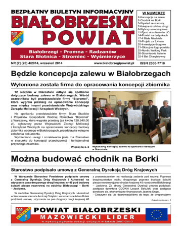 BEZPŁATNY BIULETYN INFORMACYJNY BIAŁOBRZESKI POWIAT Białobrzegi - Promna - Radzanów Stara Błotnica - Stromiec - Wyśmierzyce www.bialobrzegipowiat.pl NR [7] (20) 4/2014, wrzesień 2014 W NUMERZE 2-Koncepcja na zalew 2-Chodnik na Borki 3-Wywiad ze starostą 7-Kolejne środki na drogi 8-Wybory samorządowe 11-Zjazd absolwentów LO 14-Powiat na dożynkach 17-II Biała Niedziela 19-Projekt za 2,4 mln 20-Inwestycje drogowe 21-Głosuj na logo powiatu 25-Nordic Walking Park 26-Stromieckie historie 32-II Bal Charytatywny ISSN 2300-7710 Będzie koncepcja zalewu w Białobrzegach Wyłoniona została firma do opracowania koncepcji zbiornika 12 sierpnia w Starostwie odbyło się spotkanie dotyczące budowy zalewu w Białobrzegach. Wśród uczestników byli przedstawiciele firmy “Bipromel”, która wygrała przetarg na opracowanie koncepcji oraz między innymi przedstawiciele Wojewódzkiego Zarządu Melioracji i Urządzeń Wodnych. Na spotkaniu przedstawiciele firmy: Biuro Studiów i Projektów Gospodarki Wodnej Rolnictwa “Bipromel” z Warszawy, która wygrała przetarg (za kwotę 120.540,00 zł), ogłoszony przez Wojewódzki Zarząd Melioracji i Urządzeń Wodnych na opracowanie koncepcji budowy zbiornika wodnego w Białobrzegach, przedstawiła wstępne założenia dokumentu. Wymieniono uwagi i oczekiwania jakie ma Starostwo w stosunku do koncepcji przestrzennej i funkcjonalnej przyszłego zbiornika. Więcej na s. 2 Wykonawcy koncepcji zalewu na spotkaniu roboczym w Starostwie. Można budować chodnik na Borki Starostwo podpisało umowę z Generalną Dyrekcją Dróg Krajowych W Warszawie Starostwo Powiatowe podpisało umowę z Generalną Dyrekcją Dróg Krajowych i Autostrad na użyczenie pasa drogowego drogi krajowej nr 48 pod budowę ścieżki pieszo rowerowej na odcinku Białobrzegi – Borki – Jasionna. W siedzibie Generalnej Dyrekcji Dróg Krajowych i Autostrad w Warszawie starosta Andrzej Oziębło i wicestarosta Adam Bolek podpisali umowę użyczenia na pas drogowy drogi krajowej 48 z przeznaczeniem na realizację zadania pod nazwą: Poprawa bezpieczeństwa ruchu drogowego poprzez budowę ścieżki pieszo rowerowej przy drodze krajowej 48 na odcinku Białobrzegi – Jasionna. Ze strony Generalnej Dyrekcji umowę podpisali: zastępca dyrektora GDDKiA Leszek Sekulski oraz zastępca dyrektora ds. ekonomiczno-finansowych Joanna Engel. - Cieszymy się, że doprowadziliśmy do tego, że dysponujemy Dokończenie na s. 2 s. 2 Umowa na koncepcję zalewu podpisana Koncepcja zalewu będzie gotowa w listopadzie 12 sierpnia w Starostwie odbyło się spotkanie dotyczące budowy zalewu w Białobrzegach. Wśród uczestników byli przedstawiciele firmy “Bipromel”, która wygrała przetarg na opracowanie koncepcji oraz między innymi przedstawiciele Wojewódzkiego Zarządu Melioracji i Urządzeń Wodnych. W spotkaniu wzięli udział: starosta Andrzej Oziębło, wicestarosta Adam Bolek, dyrektor Biura Wojewody w Radomiu Rafał Rajkowski, dyrektor WZMiUW w Radomiu Czesław Kwiecień, prezes firmy “Bipromel” Krzysztof Latoszek, kierownik WZMiUW w Białobrzegach Jan Komorek oraz przedstawiciel Okręgowego Związku Wędkarskiego Piotr Szprendałowicz. Na spotkaniu przedstawiciele firmy: Biuro Studiów i Projektów Gospodarki Wodnej Rolnictwa “Bipromel” z Warszawy, która wygrała przetarg (za kwotę 120.540,00 zł), ogłoszony przez Wojewódzki Zarząd Melioracji i Urządzeń Wodnych na opracowanie koncepcji budowy zbiornika wodnego w Białobrzegach, przedstawiła wstępne założenia dokumentu. Wymieniono uwagi i oczekiwania jakie ma Starostwo w stosunku do koncepcji przestrzennej i funkcjonalnej przyszłego zbiornika. Ustalono również harmonogram dalszych działań oraz wstępne terminy spotkań grupy roboczej, w której Starostwo będzie miało swojego przedstawiciela. Koncepcja projektowa będzie obejmować: 3 warianty przedsięwzięcia, analizę powiązań każdego wariantu inwestycji z ramową dyrektywą wodną, analizę oddziaływania każdego wariantu inwestycji na poszczególne elementy środowiska oraz wpływ każdego wariantu inwestycji na Spotkanie z firmą Bipromel miało charakter roboczy. jednolite części wód. Wykonanie koncepcji przewidziane jest na połowę listopada 2014 roku. Za prace związane z opracowaniem koncepcji budowy zbiornika zapłaci Wojewódzki Zarząd Melioracji i Urządzeń Wodnych. wr ! Umowa dostępna na www.bialobrzegipowiat.pl pod zakładką „Umowy i porozumienia”. Można budować chodnik na Borki Starostwo podpisało umowę z Generalaną Dyrekcją Dróg Krajowych i Autostrad pasem drogowym pod budowę chodnika. Przez kilkanaście lat samorząd gminny nie potrafił sobie poradzić z problemem zapewnienia bezpieczeństwa na tym odcinku drogi. Starostwo wzięło sprawę w swoje ręce i dzisiaj mamy możliwość budowy chodnika – mówi starosta Andrzej Oziębło. Starostwo we wrześniu chce złożyć wniosek do wojewody o dofinansowanie (połowa kosztów) tego zadania z tzw. „schetynówki”. - Zwróciliśmy się również do burmistrza Miasta i Gminy Białobrzegi o dofinansowanie tego zadania w wysokości 50% wkładu własnego. Niestety do dnia dzisiejszego nie otrzymaliśmy jednoznacznej odpowiedzi co do formy przekazania środków – mówi starosta. Projekt zakłada budowę ciągu pieszo rowerowego o szerokości 2,5 m po południowej stronie drogi krajowej 48 na odcinku około 1300 m między Białobrzegami a drogą powiatową w kierunku Jasionnej. W zakres prac wejdzie również budowa dwóch kładek nad ciekami wodnymi, między innymi rzeką Pierzchnianką. Generalna Dyrekcja jeszcze w tym roku poszerzy przepusty pod drogą krajową w ten sposób, aby można było na nich zlokalizować ciąg rowerowo pieszy. Jeśli uda się uzyskać dofinansowanie od wojewody oraz od Gminy Białobrzegi to inwestycja, w zakładanym zakresie, zrealizowana będzie w następnym roku. Jednocześnie Starostwo prowadzi rozmowy z Generalną Dyrekcją Dróg Krajowyc