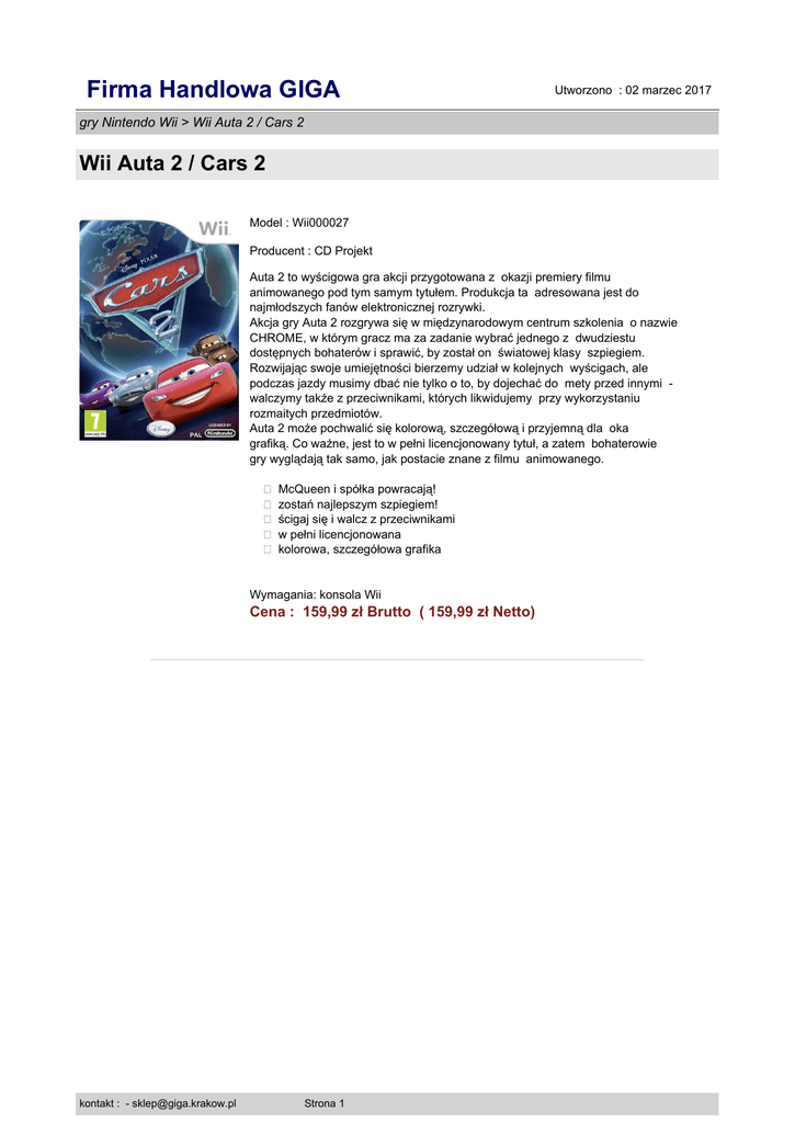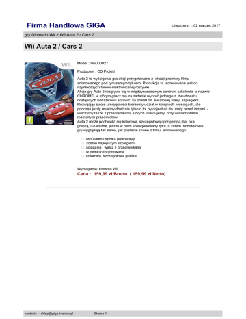 Firma Handlowa GIGA Utworzono : 02 marzec 2017 gry Nintendo Wii > Wii Auta 2 / Cars 2 Wii Auta 2 / Cars 2 Model : Wii000027 Producent : CD Projekt Auta 2 to wyścigowa gra akcji przygotowana z okazji premiery filmu animowanego pod tym samym tytułem. Produkcja ta adresowana jest do najmłodszych fanów elektronicznej rozrywki. Akcja gry Auta 2 rozgrywa się w międzynarodowym centrum szkolenia o nazwie CHROME, w którym gracz ma za zadanie wybrać jednego z dwudziestu dostępnych bohaterów i sprawić, by został on światowej klasy szpiegiem. Rozwijając swoje umiejętności bierzemy udział w kolejnych wyścigach, ale podczas jazdy musimy dbać nie tylko o to, by dojechać do mety przed innymi walczymy także z przeciwnikami, których likwidujemy przy wykorzystaniu rozmaitych przedmiotów. Auta 2 może pochwalić się kolorową, szczegółową i przyjemną dla oka grafiką. Co ważne, jest to w pełni licencjonowany tytuł, a zatem bohaterowie gry wyglądają tak samo, jak postacie znane z filmu animowanego. � McQueen i spółka powracają! � zostań najlepszym szpiegiem! � ścigaj się i walcz z przeciwnikami � w pełni licencjonowana � kolorowa, szczegółowa grafika Wymagania: konsola Wii Cena : 159,99 zł Brutto ( 159,99 zł Netto) kontakt : - [email protected] Strona 1