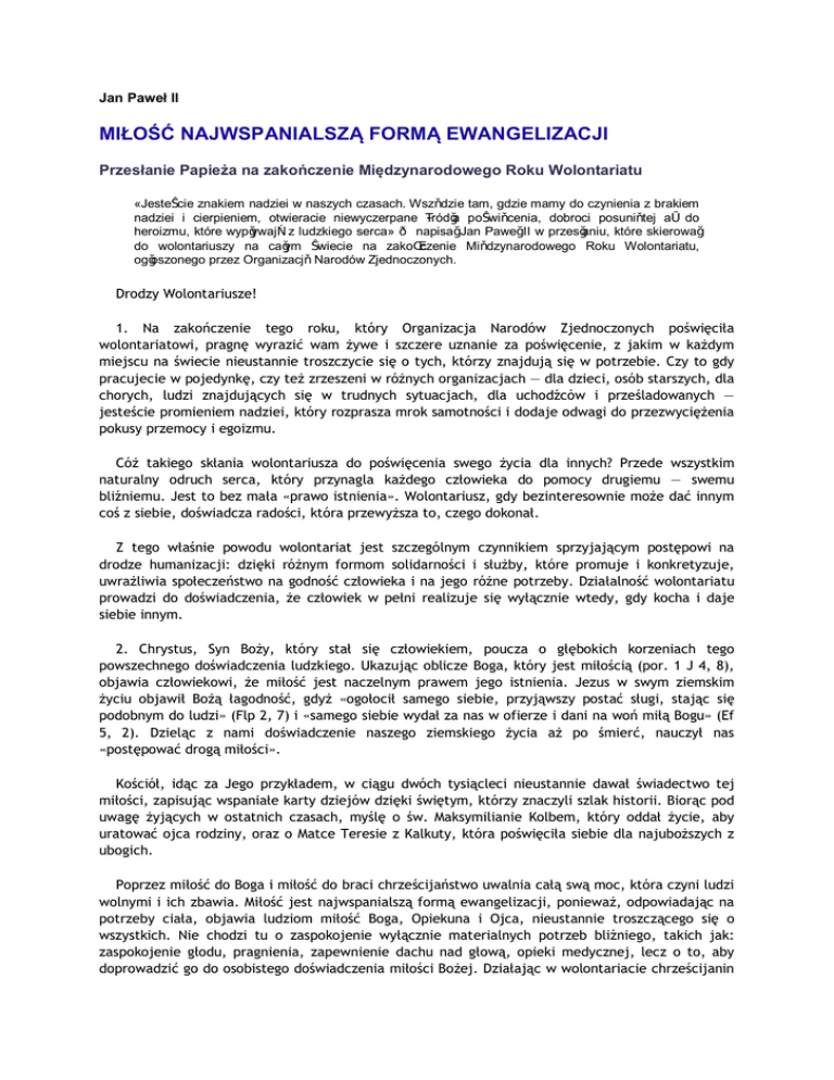 Jan Paweł II MIŁOŚĆ NAJWSPANIALSZĄ FORMĄ EWANGELIZACJI Przesłanie Papieża na zakończenie Międzynarodowego Roku Wolontariatu «Jesteście znakiem nadziei w naszych czasach. Wszędzie tam, gdzie mamy do czynienia z brakiem nadziei i cierpieniem, otwieracie niewyczerpane źródła poświęcenia, dobroci posuniętej aż do heroizmu, które wypływają z ludzkiego serca» — napisał Jan Paweł II w przesłaniu, które skierował do wolontariuszy na całym świecie na zakończenie Międzynarodowego Roku Wolontariatu, ogłoszonego przez Organizację Narodów Zjednoczonych. Drodzy Wolontariusze! 1. Na zakończenie tego roku, który Organizacja Narodów Zjednoczonych poświęciła wolontariatowi, pragnę wyrazić wam żywe i szczere uznanie za poświęcenie, z jakim w każdym miejscu na świecie nieustannie troszczycie się o tych, którzy znajdują się w potrzebie. Czy to gdy pracujecie w pojedynkę, czy też zrzeszeni w różnych organizacjach — dla dzieci, osób starszych, dla chorych, ludzi znajdujących się w trudnych sytuacjach, dla uchodźców i prześladowanych — jesteście promieniem nadziei, który rozprasza mrok samotności i dodaje odwagi do przezwyciężenia pokusy przemocy i egoizmu. Cóż takiego skłania wolontariusza do poświęcenia swego życia dla innych? Przede wszystkim naturalny odruch serca, który przynagla każdego człowieka do pomocy drugiemu — swemu bliźniemu. Jest to bez mała «prawo istnienia». Wolontariusz, gdy bezinteresownie może dać innym coś z siebie, doświadcza radości, która przewyższa to, czego dokonał. Z tego właśnie powodu wolontariat jest szczególnym czynnikiem sprzyjającym postępowi na drodze humanizacji: dzięki różnym formom solidarności i służby, które promuje i konkretyzuje, uwrażliwia społeczeństwo na godność człowieka i na jego różne potrzeby. Działalność wolontariatu prowadzi do doświadczenia, że człowiek w pełni realizuje się wyłącznie wtedy, gdy kocha i daje siebie innym. 2. Chrystus, Syn Boży, który stał się człowiekiem, poucza o głębokich korzeniach tego powszechnego doświadczenia ludzkiego. Ukazując oblicze Boga, który jest miłością (por. 1 J 4, 8), objawia człowiekowi, że miłość jest naczelnym prawem jego istnienia. Jezus w swym ziemskim życiu objawił Bożą łagodność, gdyż «ogołocił samego siebie, przyjąwszy postać sługi, stając się podobnym do ludzi» (Flp 2, 7) i «samego siebie wydał za nas w ofierze i dani na woń miłą Bogu» (Ef 5, 2). Dzieląc z nami doświadczenie naszego ziemskiego życia aż po śmierć, nauczył nas «postępować drogą miłości». Kościół, idąc za Jego przykładem, w ciągu dwóch tysiącleci nieustannie dawał świadectwo tej miłości, zapisując wspaniałe karty dziejów dzięki świętym, którzy znaczyli szlak historii. Biorąc pod uwagę żyjących w ostatnich czasach, myślę o św. Maksymilianie Kolbem, który oddał życie, aby uratować ojca rodziny, oraz o Matce Teresie z Kalkuty, która poświęciła siebie dla najuboższych z ubogich. Poprzez miłość do Boga i miłość do braci chrześcijaństwo uwalnia całą swą moc, która czyni ludzi wolnymi i ich zbawia. Miłość jest najwspanialszą formą ewangelizacji, ponieważ, odpowiadając na potrzeby ciała, objawia ludziom miłość Boga, Opiekuna i Ojca, nieustannie troszczącego się o wszystkich. Nie chodzi tu o zaspokojenie wyłącznie materialnych potrzeb bliźniego, takich jak: zaspokojenie głodu, pragnienia, zapewnienie dachu nad głową, opieki medycznej, lecz o to, aby doprowadzić go do osobistego doświadczenia miłości Bożej. Działając w wolontariacie chrześcijanin staje się świadkiem tej Boskiej miłości, głosi ją i poprzez gesty odważne i profetyczne ją uwidacznia. 3. Nie wystarczy zaradzić potrzebom kogoś, kto znajduje się w trudnej sytuacji materialnej, należy jednocześnie zaspokoić jego pragnienie wartości i głębokich odpowiedzi. Ważny jest rodzaj pomocy, którą się oferuje, ale jeszcze ważniejsze od tego jest serce, z jakim tej pomocy się udziela. Zarówno gdy chodzi o projekty na małą skalę, jak i o wielkie przedsięwzięcia, wolontariat w każdym przypadku powinien być szkołą życia, zwłaszcza dla ludzi młodych, przyczyniając się do ich wychowania w kulturze solidarności i otwartości, w gotowości do dania daru z siebie. Iluż wolontariuszy poprzez odważne zaangażowanie się na rzecz bliźnich dochodzi do odkrycia wiary! Chrystus, który zachęca, aby służyć Mu w ubogich, przemawia do serca tego, kto staje się ich sługą. Pozwala doświadczyć radości miłości bezinteresownej, miłości, która jest źródłem prawdziwego szczęścia. Bardzo bym pragnął, aby Międzynarodowy Rok Wolontariatu, w którym miały miejsce liczne inicjatywy i wydarzenia, pomógł społeczeństwu coraz pełniej doceniać różne formy wolontariatu, które są motorem wzrostu i dojrzewania cywilizacji. Wolontariusze często zastępują i uprzedzają interwencje instytucji publicznych, od których oczekuje się odpowiedniego podejścia do dzieł, które zrodziły się dzięki odwadze wolontariuszy, oraz wspierania ich, nie gasząc ich charyzmatu. 4. Drodzy bracia i siostry, którzy współtworzycie tę «armię» pokoju obecną w każdym zakątku ziemi, jesteście znakiem nadziei w naszych czasach. Wszędzie tam, gdzie mamy do czynienia z brakiem nadziei i cierpieniem, otwieracie niewyczerpane źródła poświęcenia, dobroci posuniętej aż do heroizmu, które wypływają z ludzkiego serca. Jako rzecznik ubogich całego świata pragnę podziękować wam za nieustanne poświęcenie. Kroczcie odważnie obraną drogą, niech was nigdy nie powstrzymują trudności. Chrystus, Miłosierny Samarytanin (por. Łk 10, 30-37), niech będzie najlepszym przykładem do naśladowania dla każdego wolontariusza. Naśladujcie także Maryję, która wybierając się «z pośpiechem», aby pomóc swej krewnej Elżbiecie, sta