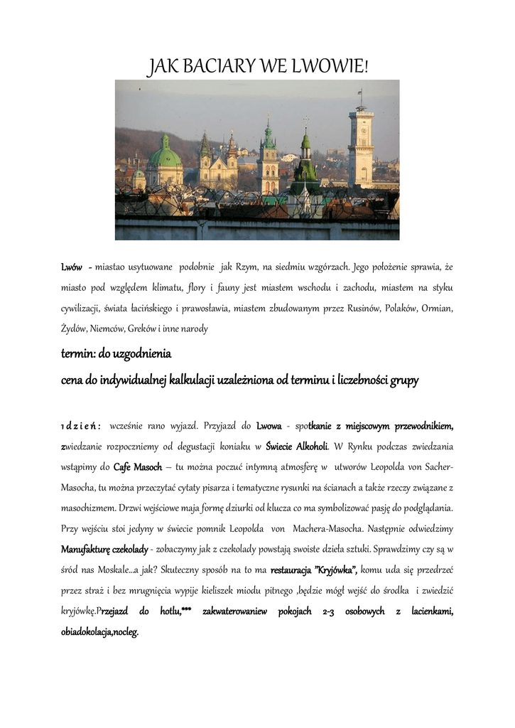 JAK BACIARY WE LWOWIE! Lwów - miasta0 usytuowane podobnie jak Rzym, na siedmiu wzgórzach. Jego położenie sprawia, że miasto pod względem klimatu, flory i fauny jest miastem wschodu i zachodu, miastem na styku cywilizacji, świata łacińskiego i prawosławia, miastem zbudowanym przez Rusinów, Polaków, Ormian, Żydów, Niemców, Greków i inne narody termin: do uzgodnienia cena do indywidualnej kalkulacji uzależniona od terminu i liczebności grupy 1 d z i e ń : wcześnie rano wyjazd. Przyjazd do Lwowa - spotkanie z miejscowym przewodnikiem, zwiedzanie rozpoczniemy od degustacji koniaku w Świecie Alkoholi. W Rynku podczas zwiedzania wstąpimy do Cafe Masoch – tu można poczuć intymną atmosferę w utworów Leopolda von SacherMasocha, tu można przeczytać cytaty pisarza i tematyczne rysunki na ścianach a także rzeczy związane z masochizmem. Drzwi wejściowe maja formę dziurki od klucza co ma symbolizować pasję do podglądania. Przy wejściu stoi jedyny w świecie pomnik Leopolda von Machera-Masocha. Następnie odwiedzimy Manufakturę czekolady - zobaczymy jak z czekolady powstają swoiste dzieła sztuki. Sprawdzimy czy są w śród nas Moskale…a jak? Skuteczny sposób na to ma restauracja ”Kryjówka”, komu uda się przedrzeć przez straż i bez mrugnięcia wypije kieliszek miodu pitnego ,będzie mógł wejść do środka i zwiedzić kryjówkę.Przejazd do hotlu,*** zakwaterowaniew pokojach 2-3 osobowych z lacienkami, obiadokolacja,nocleg. 2 d z i e ń : Po śniadaniu objazd autokarem z przewodnikiem stadionu wybudowanego na Euro 2012, Parku Stryjskiego (obecnie Kilińskiego), przejazd przez wzgórze Wóleckie - krótki postój przy pomniku Pomordowanych Profesorów Lwowskich. Wizyta w byłym Szlacheckim Kasynie(niegdyś wstęp tylko dla najbogatszych mieszkańców Lwowa. Przejazd do kawiarni „Sztuka” - degustacja kawy. Zwiedzanie słynnej Opery Lwowskiej(wewnątrz). Przejście do Karczmy „Halba” - tu po chlopsku degustacja słynnej słoniny Lwowskiej oczywiście popijana bimberkiem. Powrót do autokaru, przejazd do Browaru Lwowskiego zwiedzanie, degustacja piwa. Następnie obiadokolacja w restauracji „Lwowska Premiera”. występ kapeli „WESOŁE LWOWIAKI”, którzy przeniosą nas do przedwojennego Lwowa. Przejazd do hotelu, nocleg. 3 d z i e ń : Po śniadaniu wyjazd z przewodnikiem na dalsze zwiedzanie Lwowa: Cmentarz Łyczakowski jeden z największych cmentarzy w Europie nazywany "lwowskim Pere- Lachaise", cmentarz Orląt Lwowskich. Czas wolny na zakupy, wyjazd ze Lwowa. Przyjazd w godzinach wieczornych. CENA OBEJMUJE: transport autokarem bilety wstępu wg programu degustacje wg programu. zakwaterowanie: 2 noclegi we Lwowie(pokoje 2-3 osobowe z łazienkami występ kapeli „Wesołe Lwowiaki” wyżywienie: 2x śniadania,2x obiadokolacje, lokalny przewodnik przez 3 dni opiekę pilota na całej trasie ubezpieczenie KL i NNW POSIADAMY SYSTEM SŁUCHAWKOWY TOUR GUIDE, dzieki niemu, usłyszą państwo kazde słowo pilota i przewodnika, nawet w najbardziej zatłoczonym miejscu!