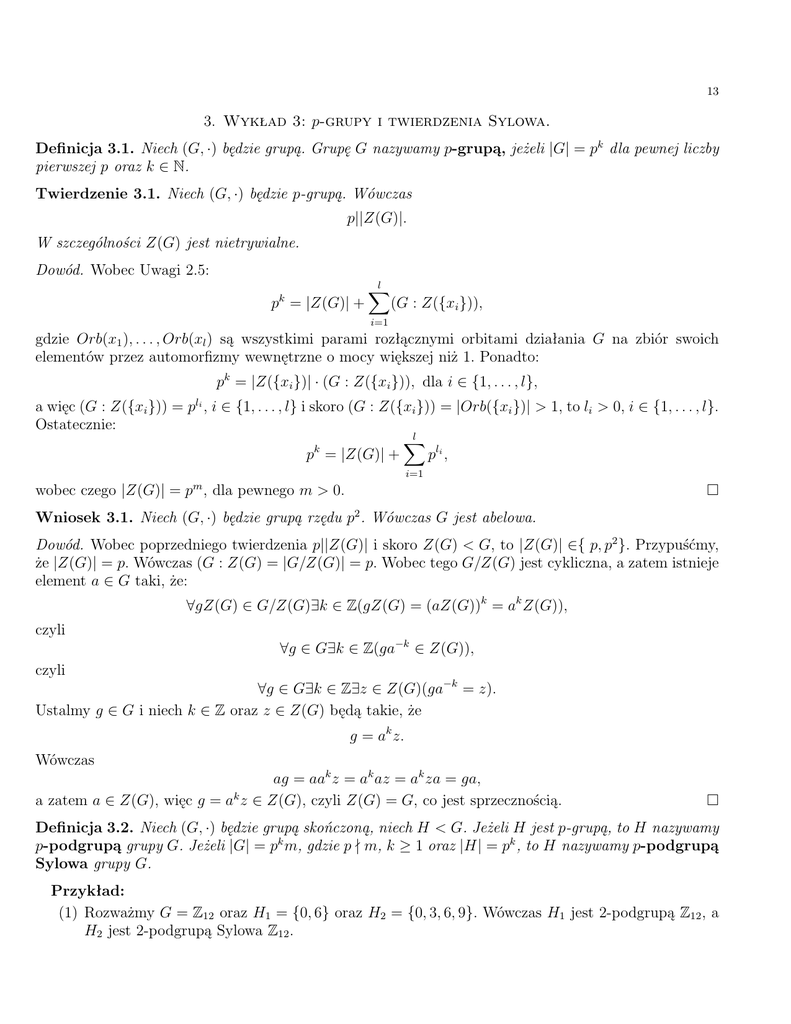 3. Wykład 3: p-grupy i twierdzenia Sylowa. Definicja 3.1. Niech (G