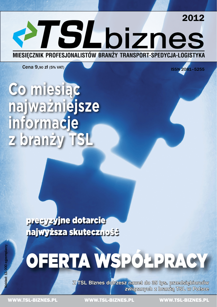 2012 biznes Miesięcznik profesjonalistów branży transport-spedycja-logistyka Cena 9,90 zł (5% VAT) ISSN 2081–5255 Co miesiąc najważniejsze informacje z branży TSL Nakład: 11 000 egzemplarzy precyzyjne dotarcie najwyższa skuteczność Oferta współpracy WWW.TSL-BIZNES.PL Z TSL BIznes dotrzesz nawet do 35 tys. przedsiębiorców związanych z branżą TSL w Polsce WWW.TSL-BIZNES.PL WWW.TSL-BIZNES.PL biznes Miesięcznik profesjonalistów branży transport-spedycja-logistyka Miesięcznik TSL Biznes to magazyn informacyjny, na którego łamach czytelnik odnajdzie wszystkie najważniejsze wiadomości z branży transportu, spedycji i logistyki. Branża TSL to jeden zwarty organizm, dlatego właśnie w jednym tytule scalamy wszystko to, co najistotniejsze. Informujemy o nowych produktach, usługach i rozwiązaniach. Piszemy o aktualnych tendencjach i kierunkach zmian. Dostarczamy pożytecznych i wartościowych wskazówek, opinii i porad. Czasopismo tworzą eksperci mający bogate doświadczenia w tej branży. Nasze łamy otwieramy też dla specjalistów pracujących w branży TSL. Nasi czytelnicy: Miesięcznik kierujemy do profesjonalistów związanych z branżą TSL, zarówno budujących ofertę tej branży, jak i korzystających z jej usług. Nasi czytelnicy to osoby stale poszukujące nowych rozwiązań organizacyjnych i technicznych, pozwalających na obniżanie kosztów i podwyższanie jakości w dziedzinie transportu i logistyki. Czytają nas w szczególności: – dyrektorzy, kierownicy i menedżerowie logistyki oraz transportu w firmach sektora produkcyjnego, handlowego i dystrybucyjnego – właściciele i kierownicy firm transportowych, przewoźnicy – spedytorzy i pracownicy spedycji – operatorzy logistyczni i pracownicy firm kurierskich – dostawcy rozwiązań i usług dla branży TSL (producenci i dystrybutorzy sprzętu transportowego, wyposażenia magazynowego, systemów IT itp.) – studenci, naukowcy, ludzie nauki – wszyscy inni zainteresowani lub związani z branżą TSL Szerokie dotarcie – szerokie korzyści – miesięczny cykl wydawniczy zapewnia nam częstsze dotarcie, aktualne wiadomości i możliwość szybkiego prezentowania nowości – mamy atrakcyjną cenę - znamy logistyków oraz transportowców i wiemy, że nie lubią oni trwonić pieniędzy, dlatego oferujemy gazetę w najlepszej cenie i jakości – jeszcze większy nakład: od 2012 roku zwiększamy nakład miesięcznika do 11 000 egzemplarzy. – wykorzystujemy wiele kanałów dotarcia do czytelników. Poza prenumeratą i sprzedażą bezpośrednią (m.in. sieć Empik i inne salony prasowe) docieramy do sprecyzowanych grup czytelników dzięki współpracy z naszymi partnerami oraz poprzez bezpłatną wysyłkę rotacyjną do wybranych odbiorców. – w naszej bazie wysyłki rotacyjnej znajduje się ponad 35 000 firm i przedsiębiorców z branży transportowej i logistycznej, do których docieramy. – nieskończona „żywotność” reklam i artykułów, dzięki bezpłatnej dystrybucji wydań archiwalnych na wydarzeniach i w wysyłce bezpośredniej oraz darmowemu i ogólnodostępnemu archiwum elektronicznemu wcześniejszych wydań, które planujemy wkrótce uruchomić. – jesteśmy obecni na najważniejszych imprezach branżowych, targach, konferencjach, spotkaniach – również z wydaniami archiwalnymi, dzięki czemu do uczestników tych wydarzeń dotrze również Państwa przekaz marketingowy. Co nas wyróżnia: Rzetelność i profesjonalizm to podstawa, ale naszą dewizą we współpracy z branżą jest też elastyczność oraz otwartość na zmieniające się potrzeby i oczekiwania zarówno naszych czytelników, jak i partnerów marketingowych. Będziemy się zmieniać i stale podążać za tym, jak zmienia się nasza branża. Elastycznie i otwarcie podchodzimy też do współpracy z naszymi partnerami marketingowymi. Liczymy na to, że dostrzegą Państwo w nas partnerów do współpracy. Jesteśmy otwarci na Państwa oczekiwania, potrzeby i sugestie oraz na różne formy współpracy indywidualnej. Zapraszamy do bezpośredniego kontaktu. Redakcja TSL Biznes ul. Trzcinowa 30/13 02-446 Warszawa tel. 22 213 88 28 fax 22 205 07 57 [email protected] Mirosław Ganiec [email protected] kom. 502 532 575 Cała strona 1/1 biznes 210 x 297 mm Miesięcznik profesjonalistów branży transport-spedycja-logistyka Oferta reklamowa 2012 cennik i wymiary reklam 1/2 poziom spad 210 x 150 mm 1/2 poziom 170 x 132 mm (+4 mm spadów z każdej strony) (bez spadów) Junior Page 128 x 180 mm przeskalowane A4 (+4 mm spadów z każdej strony) Cena: 3 900 zł Cena: 3 900 zł 1/3 poziom 1/3 poziom spad 170 x 95 mm 210 x 100 mm (bez spadów) (+4 mm spadów z każdej strony) (bez spadów) Cena: 2 900 zł Cena: 2 300 zł Cena: 2 900 zł Cena: 3 900 zł (+4 mm spadów z każdej strony) OFERTA SPECJALNA: Dwie strony 9900 zł Cena: 6 900 zł 1/2 pion spad 1/2 pion 1/3 pion 105 x 297 mm 90 x 245 mm 65 x 245 mm (+4 mm spadów z każdej strony) (bez spadów) (bez spadów) Cena: 3 900 zł Cena: 3 900 zł 1/4 spad 1/4 1/4 poziom 105 x 150 mm 90 x 132 mm 170 x 70 mm (+4 mm spadów z każdej strony) (bez spadów) Cena: 2 900 zł Moduł na stronie ogłoszeniowej 90 x 50 mm (bez spadów) Cena: 2 300 zł Cena: 2 300 zł Cena: 600 zł Wszystkie ceny netto (+23% VAT) Możliwe są również inne formy prezentacji i promocji (np. reklama na kopertach, specjalne wkładki „eventowe” i targowe – zawsze jesteśmy otwarci na propozycje – zapraszamy do rozmów Stałym klientom udzielamy wysokich rabatów i proponujemy oferty specjalne – szczegóły do indywidualnego ustalenia Usługi specjalne: Wymagania techniczne: • tylko kolory CMYK • rozdzielczość 300 dpi • spady 4mm (tam gdzie wymagane) Wysyłka czasopisma do wskazanych odbiorców: od 2,50 zł za egzemplarz Prosimy przesyłać materiały w formatach: • EPS (fonty zamienione na krzywe) • TIFF (300 dpi, barwy CMYK) • PDF (Press Quality, fonty dołączone lub krzywe
