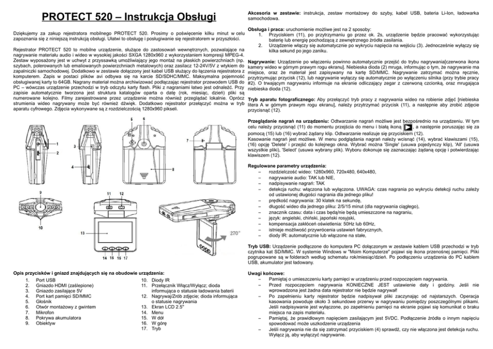 PROTECT 520 – Instrukcja Obsługi Akcesoria w zestawie: instrukcja, zestaw montażowy do szyby, kabel USB, bateria Li-Ion, ładowarka samochodowa. Obsługa i praca: uruchomienie możliwe jest na 2 sposoby: 1. Przyciskiem (11), po przytrzymaniu go przez ok. 2s, urządzenie będzie pracować wykorzystując baterię lub energię pochodzącą z zewnętrznego źródła zasilania. 2. Urządzenie włączy się automatycznie po wykryciu napięcia na wejściu (3). Jednocześnie wyłączy się Rejestrator PROTECT 520 to mobilne urządzenie, służące do zastosowań wewnętrznych, pozwalające na kilka sekund po jego zaniku. nagrywanie materiału audio i wideo w wysokiej jakości SXGA 1280x960 z wykorzystaniem kompresji MPEG-4. Zestaw wyposażony jest w uchwyt z przyssawką umożliwiający jego montaż na płaskich powierzchniach (np. Nagrywanie: Urządzenie po włączeniu powinno automatycznie przejść do trybu nagrywania[czerwona ikona szybach, polerowanych lub emaliowanych powierzchniach metalowych) oraz zasilacz 12-24V/5V z wtykiem do kamery wideo w górnym prawym rogu ekranu]. Niebieska dioda (2) mruga, informując o tym, że nagrywanie ma zapalniczki samochodowej. Dodatkowo w zestawie dołączony jest kabel USB służący do łączenia rejestratora z miejsce, oraz że materiał jest zapisywany na kartę SD/MMC. Nagrywanie zatrzymać można ręcznie, komputerem. Zapis w postaci plików avi odbywa się na karcie SD/SDHC/MMC. Maksymalna pojemność przytrzymując przycisk (12), lub nagrywanie wyłączy się automatycznie po wyłączeniu silnika (przy trybie pracy obsługiwanej karty to 64GB. Nagrany materiał można archiwizować podłączając rejestrator przewodem USB do #2). O trwającym nagrywaniu informuje na ekranie odliczający zegar z czerwoną czcionką, oraz mrugająca PC – wówczas urządzenie przechodzi w tryb odczytu karty flash. Pliki z nagraniami łatwo jest odnaleźć. Przy niebieska dioda (12). zapisie automatycznie tworzona jest struktura katalogów oparta o datę (rok, miesiąc, dzień) pliki są numerowane kolejno. Filmy zarejestrowane przez urządzenie można również przeglądać lokalnie. Oprócz Tryb aparatu fotograficznego: Aby przełączyć tryb pracy z nagrywania wideo na robienie zdjęć [niebieska strumienia wideo nagrywany może być również dźwięk. Dodatkowo rejestrator przełączyć można w tryb litera A w górnym prawym rogu ekranu], należy przytrzymać przycisk (11), a następnie aby zrobić zdjęcie aparatu cyfrowego. Zdjęcia wykonywane są z rozdzielczością 1280x960 pikseli. przycisnąć (12). Dziękujemy za zakup rejestratora mobilnego PROTECT 520. Prosimy o poświęcenie kilku minut w celu zapoznania się z niniejszą instrukcją obsługi. Ułatwi to obsługę i posługiwanie się rejestratorem w przyszłości. Przeglądanie nagrań na urządzeniu: Odtwarzanie nagrań możliwe jest bezpośrednio na urządzeniu. W tym celu należy przycisnąć (11) do momentu przejścia do menu i białą ikoną , a następnie poruszając się za pomocą (15) lub (16) wybrać żądany klip. Odtwarzanie realizuje się przyciskiem (12). Kasowanie nagrań jest możliwe. W menu podglądania nagrań należy wcisnąć (14), wybrać klawiszami (15), (16) opcję 'Delete' i przejść do kolejnego okna. Wybrać można 'Single' (usuwa pojedynczy klip), 'All' (usuwa wszystkie pliki), 'Select' (usuwa wybrany plik). Wyboru dokonuje się zaznaczając żądaną opcję i potwierdzając klawiszem (12). Regulowane parametry urządzenia: – rozdzielczość wideo: 1280x960, 720x480, 640x480, – nagrywanie audio: TAK lub NIE, – nadpisywanie nagrań: TAK – detekcja ruchu: włączona lub wyłączona. UWAGA: czas nagrania po wykryciu detekcji ruchu zależy od ustawionej długości nagrania dla jednego pliku! – prędkość nagrywania: 30 klatek na sekundę, – długość wideo dla jednego pliku: 2/5/15 minut (dla nagrywania ciągłego), – znacznik czasu: data i czas będą/nie będą umieszczone na nagraniu, – język: angielski, chiński, japoński rosyjski, – kompensacja zakłóceń oświetlenia: 50Hz lub 60Hz, – istnieje możliwość przywrócenia ustawień fabrycznych, – diody IR: automatycznie lub włączone na stałe, Tryb USB: Urządzenie podłączone do komputera PC dołączonym w zestawie kablem USB przechodzi w tryb czytnika kat SD/MMC. W systemie Windows w "Moim Komputerze" pojawi się ikona przenośnej pamięci. Pliki pogrupowane są w folderach według schematu rok/miesiąc/dzień. Po podłączeniu urządzenia do PC kablem USB, akumulator jest ładowany. Opis przycisków i gniazd znajdujących się na obudowie urządzenia: 1. Port USB 10. Diody IR 2. Gniazdo HDMI (zaślepione) 11. Przełącznik Włącz/Wyłącz; dioda 3. Gniazdo zasilające 5V informująca o statusie ładowania baterii 4. Port kart pamięci SD/MMC 12. Nagrywaj/Zrób zdjęcie; dioda informująca 5. Głośnik o statusie nagrywania 6. Otwór montażowy z gwintem 13. Ekran LCD 2.5'' 7. Mikrofon 14. Menu 8. Pokrywa akumulatora 15. W dół 9. Obiektyw 16. W górę 17. Tryb Uwagi końcowe: – Pamiętaj o umieszczeniu karty pamięci w urządzeniu przed rozpoczęciem nagrywania. – Przed rozpoczęciem nagrywania KONIECZNE JEST ustawienie daty i godziny. Jeśli nie wprowadzona jest żadna data rejestrator nie będzie nagrywał! – Po zapełnieniu karty rejestrator będzie nadpisywał pliki zaczynając od najstarszych. Operacja kasowania powoduje około 3 sekundowe przerwy w nagrywaniu pomiędzy poszczególnymi plikami. Jeśli nadpisywanie jest wyłączone, po zapełnieniu pamięci na ekranie pojawi się komunikat o braku miejsca na zapis materiału. – Pamiętaj, że prawidłowym napięciem zasilającym jest 5VDC. Podłączenie źródła o innym napięciu spowodować może uszkodzenie urządzenia – Jeśli nagrywania nie da się zatrzymać przyciskiem (4) sprawdź, czy nie włączona jest detekcja ruchu. Wyłącz ją, aby wyłączyć nagrywanie. Tabela parametrów technicznych urządzenia: Mode
