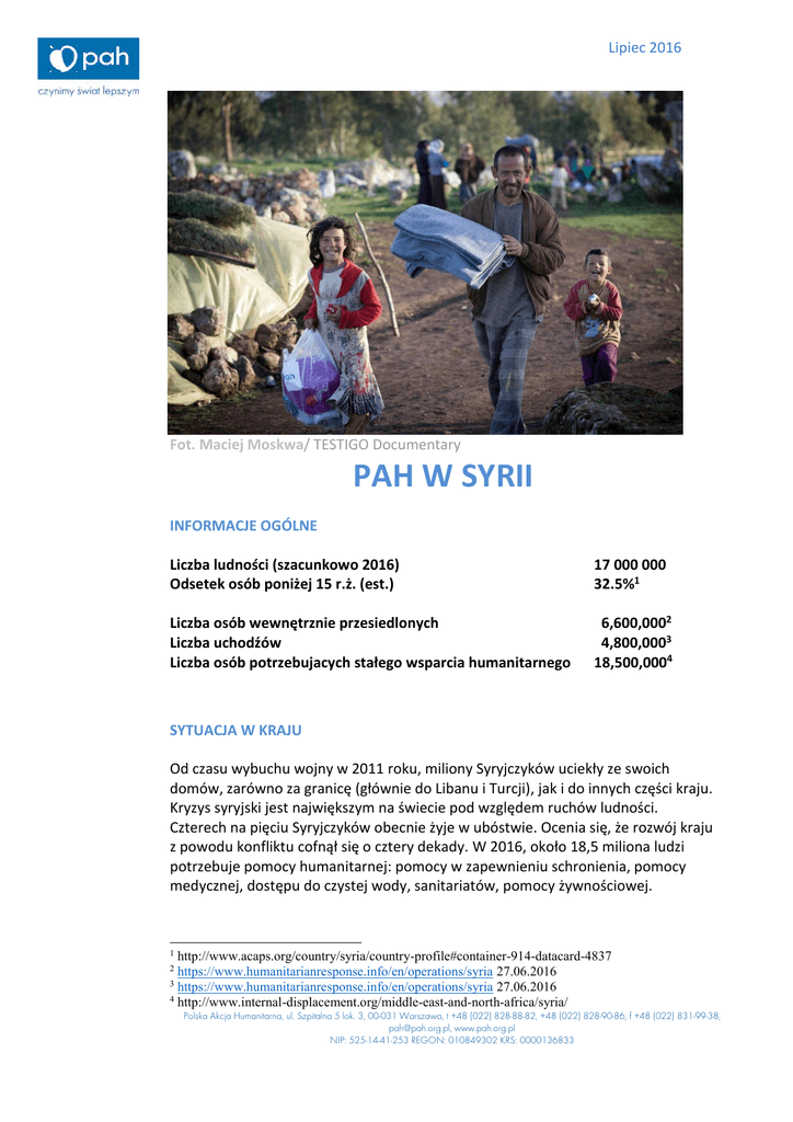 Lipiec 2016 Fot. Maciej Moskwa/ TESTIGO Documentary PAH W SYRII INFORMACJE OGÓLNE Liczba ludności (szacunkowo 2016) Odsetek osób poniżej 15 r.ż. (est.) 17 000 000 32.5%1 Liczba osób wewnętrznie przesiedlonych Liczba uchodźów Liczba osób potrzebujacych stałego wsparcia humanitarnego 6,600,0002 4,800,0003 18,500,0004 SYTUACJA W KRAJU Od czasu wybuchu wojny w 2011 roku, miliony Syryjczyków uciekły ze swoich domów, zarówno za granicę (głównie do Libanu i Turcji), jak i do innych części kraju. Kryzys syryjski jest największym na świecie pod względem ruchów ludności. Czterech na pięciu Syryjczyków obecnie żyje w ubóstwie. Ocenia się, że rozwój kraju z powodu konfliktu cofnął się o cztery dekady. W 2016, około 18,5 miliona ludzi potrzebuje pomocy humanitarnej: pomocy w zapewnieniu schronienia, pomocy medycznej, dostępu do czystej wody, sanitariatów, pomocy żywnościowej. 1 http://www.acaps.org/country/syria/country-profile#container-914-datacard-4837 https://www.humanitarianresponse.info/en/operations/syria 27.06.2016 3 https://www.humanitarianresponse.info/en/operations/syria 27.06.2016 4 http://www.internal-displacement.org/middle-east-and-north-africa/syria/ 2 Polska Akcja Humanitarna, ul. Szpitalna 5 lok. 3, 00-031 Warszawa, t +48 (022) 828-88-82, +48 (022) 828-90-86, f +48 (022) 831-99-38, [email protected], www.pah.org.pl NIP: 525-14-41-253 REGON: 010849302 KRS: 0000136833 Mimo tak ogromnych potrzeb, bardzo trudno jest dotrzeć z pomocą do potrzebujących. Ciągły konflikt, niezapowiedziane ataki, zmienne linie frontu, rozdrobnienie grup walczących o władzę, rozmaite obostrzenia administracyjne i biurokracja powodują, że niesienie pomocy jest szczególnie skomplikowane. Co więcej pomoc humanitarna, a właściwie jej brak jest wykorzystywany przez strony konfliktu jako narzędzie nacisku. Syryjczycy szukają schronienia poza granicami kraju. Jest to jednak coraz trudniejsze. Coraz mniej uchodźców rejestruje się w sąsiednich krajach.5 Ocenia się, że liczba uchodźców w Turcji, Jordanie, Iraku, Libanie i Egipcie pod koniec 2016 roku osiągnie 4,7 miliona osób.6 POMOC HUMANITARNA UDZIELANA PRZEZ PAH Od 2013 roku Polska Akcja Humanitarna realizuje projekty pomocy humanitarnej w Syrii. Obecnie pomagamy w prowincji Idleb, gdzie prócz mieszkańców, przebywają setki tysięcy uchodźców wewnętrznych, głównie z sąsiedniej prowincji Aleppo. Niosąc wsparcie w regionie, PAH zatrudnia do pracy ponad 80 syryjskich fachowców (inżynierów, specjalistów od uzdatniania wody, edukatorów). Obecnie realizujemy projekty: wodno-sanitarne (dostarczamy wodę, odbudowujemy stacje pompujące, wodociągi, systemy kanalizacyjne oraz toalety w szkołach, dystrybuujemy zestawy higieniczne), żywnościowe (dostarczamy żywność oraz współpracujemy z miejscowymi piekarniami), medyczne (dystrybuujemy leki do punktów medycznych), edukacyjne (prowadzimy zajęcia edukacyjne i rekreacyjne w Child Friendly Space dla dzieci-uchodźców w Turcji) PROGRAM WODNO-SANITARNY W wyniku działań wojennych, a także wynikających z konfliktu zaniedbań, systemy dostarczania czystej wody oraz kanalizacyjne zostały w wielu miejscach zniszczone. PAH odbudowuje stacje pompujące (także wyposaża w generatory) oraz systemy ściekowe. Dostęp do wody jest podstawową potrzebą mieszkańców oraz uchodźców wewnętrznych, którą staramy się zaspokajać. Zarządzanie nieczystościami jest szczególnie ważne w profilaktyce zdrowia. W ramach projektu sponsorowanego przez UNICEF odbudowujemy systemy wodne w Quminas i Maart Dibsah. W ramach projektu sponsorowanego przez Komisję Europejską między 5 https://www.humanitarianresponse.info/en/operations/syria 27.06.2016 http://www.3rpsyriacrisis.org/crisis/ 3RP Regional, refugee & Resilence Plan 2016-2017 in response to the Syria crisis. Regional Strategic Overview 6 Polska Akcja Humanitarna, ul. Szpitalna 5 lok. 3, 00-031 Warszawa, t +48 (022) 828-88-82, +48 (022) 828-90-86, f +48 (022) 831-99-38, [email protected], www.pah.org.pl NIP: 525-14-41-253 REGON: 010849302 KRS: 0000136833 innymi odbudowaliśmy system wodny w Sarmadzie, co posłuży ponad 100 000 beneficjentów. W prowincji Idleb gdzie działamy istnieje wiele nieformalnych obozów dla uciekinierów z innych części kraju, w których brakuje jakiejkolwiek infrastruktury. PAH codziennie dowozi do takich miejsc wodę pitną cysternami. Ponadto przeprowadziliśmy dystrybucję zbiorników na wodę. Usuwamy ciężarówkami nieczystości, dystrybuowaliśmy kosze na śmieci. W ramach projektu sponsorowanego przez Norwegian Church Aid w maju rozdystrybuowano 100 kontenerów na śmieci, 1444 zbiorników na wodę, zbudowano 42 latryny w obozach oraz rozdystrybuowano 2516 zestawów higienicznych. Przeprowadzono dostawy wody oraz usuwanie nieczystości z 21 obozów, zamieszkiwanych przez ok. 27 000 osób. Dzięki wpłatom indywidulanym darczyńców PAH, uczestnictwie w Klubie PAH SOS oraz zbiórkom publicznym PAH może finansować powyższe działania niezależnie od funduszy instytucjonalnych. Dziękujemy. Wiele szkół w Syrii przestało funkcjonować po wybuchu konfliktu. Wiedząc jak ważne jest zapewnienie dostępu do edukacji i godnych warunków nauki dla młodych Syryjczyków, odbudowujemy szkolne latryny i łazienki, tak by działające jeszcze szkoły (często przeciążone ze względu na napływ dzieci i młodzieży z zamkniętych placówek) mogły dobrze służyć uczniom. Część szkół działa jako miejsca schronienia dla osób wewnętrzne przesiedlonych, dlatego także w takich miejscach odbudowujemy lub budujemy sanitariaty. Od marca do lipca w ramach m.in. projektu finansowanego przez Biuro Narodów Zjednoczonych ds. Koordynacji Pomocy Humanitarnej (UN OCHA) odbudowaliśmy około 200 latryn szkolnych. Większość naszych beneficjentów żyje w skrajnym ubóstwie. Dostęp do wody pitnej, odbiór nieczystości i inne działania sanitarne pozwalają im zachowa