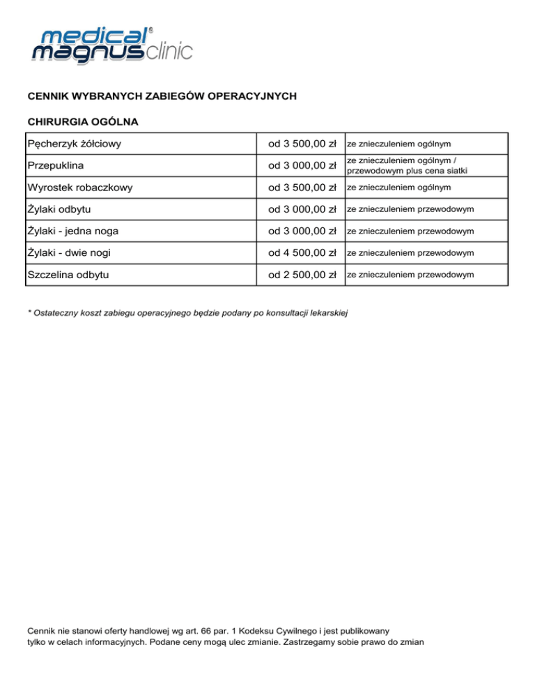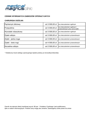 CENNIK WYBRANYCH ZABIEGÓW OPERACYJNYCH CHIRURGIA OGÓLNA Pęcherzyk żółciowy od 3 500,00 zł ze znieczuleniem ogólnym Przepuklina od 3 000,00 zł przewodowym plus cena siatki Wyrostek robaczkowy od 3 500,00 zł ze znieczuleniem ogólnym Żylaki odbytu od 3 000,00 zł ze znieczuleniem przewodowym Żylaki - jedna noga od 3 000,00 zł ze znieczuleniem przewodowym Żylaki - dwie nogi od 4 500,00 zł ze znieczuleniem przewodowym Szczelina odbytu od 2 500,00 zł ze znieczuleniem przewodowym ze znieczuleniem ogólnym / * Ostateczny koszt zabiegu operacyjnego będzie podany po konsultacji lekarskiej Cennik nie stanowi oferty handlowej wg art. 66 par. 1 Kodeksu Cywilnego i jest publikowany tylko w celach informacyjnych. Podane ceny mogą ulec zmianie. Zastrzegamy sobie prawo do zmian