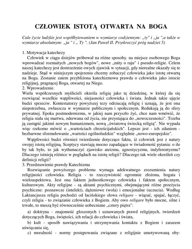 CZŁOWIEK ISTOTĄ OTWARTA NA BOGA Cale życie ludzkie jest współbytowaniem w wymiarze codziennym: „ty" i „ja ",a także w wymiarze absolutnym: „ja " i „ Ty ". (Jan Paweł II. Przekroczyć próg nadziei 5) 1. Motywacja katechezy Człowiek w ciągu dziejów próbował na różne sposoby. na miejsce osobowego Boga wprowadzać rozmaitych „nowych bogów", nowe „mity o raju" i pseudo-religie. Celem naszej katechezy jest dostrzeżenie owych zjawisk w sytuacji, gdy nierealne okazały się te nadzieje. Stąd w niniejszym spojrzeniu chcemy zobaczyć człowieka jako istotę otwartą na Boga. Zostanie zatem przybliżona katechizmowa prawda o człowieku jako istocie religijnej, pragnącej Boga, otwartej na Niego. 2. Wprowadzenie. Wielu współczesnych myślicieli określa religię jako tę dziedzinę, w której da się rozwiązać wszelkie wątpliwości, niejasności człowieka i świata. Jednak takie ujęcie budzi sprzeciw. Kontestatorzy powyższej tezy odrzucają religię i uznają, że jest ona niepotrzebna, zwłaszcza w wymiarze publicznym i społecznym. Redukują ją do sfery prywatnej. Epoka postmodernizmu, w jakiej nam przyszło żyć, chce nam wmówić, że religia stała się martwa, oderwana od życia, nie przystająca do „nowoczesności". Trzeba ją zastąpić jakimś nowym humanizmem, nową „światową świecką religią". Nie wypada więc rzekomo mówić o „wartościach chrześcijańskich". Lepsze jest - ich zdaniem bezbarwne sformułowanie „wartości ogólnoludzkie" względnie „nowo-europejskie". Wątpliwości budzi również twierdzenie dotyczące faktu, iż człowiek jest z natury swojej istotą religijną. Sceptycy stawiają mocno zapadające w świadomość pytania: o ile by tak było, to jak wytłumaczyć zjawisko ateizmu, agnostycyzmu, indyferentyzmu? Dlaczego istnieją różnice w poglądach na istotę religii? Dlaczego tak wiele określeń czy definicji religii? 3. Przedstawienie prawdy Katechizmu Rozwiązanie powyższego problemu wymaga adekwatnego zrozumienia natury religijności człowieka. Religia - to rzeczywistość ogromnie złożona, bogata i wieloaspektowa. Jest ona faktem jednostkowego człowieka i faktem społecznym, kulturowym. Akty religijne - są aktami psychicznymi, obejmującymi różne przeżycia psychiczne: poznawcze (intelekt), dążeniowe (wola) i emocjonalne (uczucia). Według Laktancjusza religia pochodzi od łacińskiego słowa religare - wiązać, spajać, łączyć, czyli religia - to związanie człowieka z Bogiem. Aby owo religare było mocne, silne i trwałe, to muszą być równocześnie uobecniane „cztery piętra": a) doktryna - znajomość głoszonych i uznawanych prawd religijnych, twierdzeń dotyczących Boga, świętości, ich relacji do człowieka i świata, b) kult - sposób nawiązywania i utrzymywania kontaktu z Bogiem i zarazem uświęcania się, c) moralność - normy postępowania związane z religijnie umotywowaną oby- czajowością, d) wspólnotowość - budowana w relacjach międzyludzkich (horyzontalność) i między człowiekiem a Bogiem (wertykalność). Obie te zależności są ściśle ze sobą złączone. Z tych „czterech pięter" wynika, że religia jest faktem społeczno-kulturowym, a nie tylko prywatnym, osobistym. I to wyjaśnia, dlaczego istnieje wiele religii, wiele sposobów pojmowania Boga i wyrażania przez człowieka stosunku do Niego. Przyczyną różnych odpowiedzi na pytanie: czym jest religia, jest także wzięcie pod uwagę jednego jej wymiaru z pominięciem pozostałych (np. psychoanalitycy interesują się religią jako faktem psychicznym i redukują ją tylko do tego wymiaru, pomijając jej pozostałe aspekty: społeczny, ontyczny itp.). Zjawisko religii może być ponadto rozpatrywane z różnych punktów widzenia, w zależności od przedmiotu zainteresowania określonej dyscypliny naukowej (np. historii religii, psychologii, socjologii, filozofii itp.). Wszystko to tłumaczy, dlaczego istnieje wiele teorii religii, jej interpretacji i wyjaśnień. Różne są bowiem koncepcje człowieka, społeczności, to i różne teorie religii (powiedz mi, jakie jest twoje rozumienie człowieka, a powiem ci, jakie jest twoje wyobrażenie o religii, o Bogu). Jaka zatem jest natura religijności człowieka? Człowiek jest otwarty na drugie „ty" osobowe i ostatecznie na absolutne „Ty" osoby Boga. Człowiek jest więc istotą religijną. Religijność stanowi atrybut ludzkiej natury. Racją istnienia człowieka, jego integralnego rozwoju, wszelkich przeżyć, dążeń, uniesień, jest druga osoba. Jednak „pojemności" ludzkiego poznania i ludzkiej miłości nie jest w stanie zapełnić żadne dobro, żadna nawet najbardziej kochająca osoba.- W poznaniu ma się do czynienia z trudem zdobywania prawdy, z narażeniem na na pomyłki, błędy. W miłości - ktoś ukochany odchodzi, umiera, doświadcza się też miłości udanej i nieudanej. A zatem to wychylenie się człowieka w kierunku „ty" drugiego ostatecznie dopełnia się, umacnia w potrzebie zaufania i zawierzenia „TY" transcendentnemu, czyli Bogu. Bóg jest dla człowieka źródłem istnienia i jego celem ostatecznym. Owo religare, ta relacja człowiek-Bóg, jest relacją międzyosobową, spotkaniem się osób: osoby człowieka i Osoby Boga. Ta jednak relacja ma charakter moralny. Co to znaczy? Oznacza to, że zachodzi tu konieczność powinności. Człowiek p o w i n i e n być religijny, p o w i n i e n uznać swoją zależność względem Boga, p o w i n i e n uznać Go za Najwyższą Osobową Wartość: Prawdę, Dobro, Piękno. P o w i n i e n..., ale nie musi, bo człowiek jest istotą wolną. Przypomina się Chrystusowe: „Jeśli chcesz...". Bóg szanuje ludzką wolność, dlatego nie przymusza człowieka do wiary, do Siebie, nie traktuje go jako przedmiot zdalnie sterowany, ale dowartościowuje to etyczne: „powinieneś". Stąd człowiek może powiedzieć Bogu: „nie".. Otwartość człowieka na Boga nie dokonuje się więc