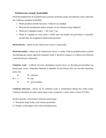 Podstawowe zasady hydrauliki Przed przystąpieniem do projektowania systemu automatycznego nawadniania warto zapoznać się z kilkoma zasadami hydrauliki: • Woda przybiera kształt naczynia, w którym się znajduje • Dla potrzeb nawadniania należy przyjąć, że nie zmienia swojej objętości • Woda jest względnie ciężka - 1 litr waży 1 kg • Woda ze względu na swój ciężar i ciekły stan oraz dzięki sile grawitacji w naturalny sposób dąży do osiągnięcia najniższego poziomu Hydrostatyka - odnosi się do właściwości cieczy w spoczynku. Hydrodynamika - odnosi się do właściwości cieczy w ruchu. Podczas projektowania systemu nawadniającego należy zapewnić transport wody w docelowe miejsca we właściwych ilościach i pod określonym ciśnieniem. Ciśnienie wody - wielkość fizyczna określająca nacisk cieczy na dowolną powierzchnię wg poniższego wzoru. Jednostką ciśnienia w układzie SI jest Pascal (Pa), ale również atmosfera (atm), bar. F P = --S P - ciśnienie F - siła S – powierzchnia Ciśnienie statyczne - odnosi się do ciśnienia wody w zamkniętym obiegu bez ruchu wody. Ciśnienie określane jest jako ciężar słupa wody wysokości 1 metra, który wynosi 9,79 kPa. Są dwa sposoby wytwarzania ciśnienia statycznego: 1) Wysokość słupa wody, czyli różnica poziomów 2) Pompy wymuszające ruch wody (mechanicznie) Ciśnienie statyczne możemy określić na dwa sposoby: 1) Z odpowiednich instytucji uzyskać informację na temat ciśnienia w linii głównej, a następnie zmierzymy różnicę wysokości pomiędzy tą linią, a punktem mierzonego ciśnienia pozwoli to określić wzrost lub spadek ciśnienia w tym punkcie. 2) Zastosować ciśnieniomierz. Ciśnienie statyczne w każdym punkcie na tym samym poziomie będzie zawsze takie same. Ciśnienie ulegnie zmianie z chwilą zmiany wysokości słupa wody; każdy metr różnicy wysokości spowoduje wzrost(-) lub spadek(+) ciśnienia o 0,1atm. Ciśnienie dynamiczne - to ciśnienie wody w danym punkcie systemu przy określonej ilości wody przepływającej przez ten punkt. Zmiany ciśnienia zależą przede wszystkim od ilości wody przepływającej przez system. Im większy przepływ wody, tym większe straty ciśnienia. Ciśnienie dynamiczne pojawia się, kiedy otwiera się zawór i woda zaczyna przepływać przez system nawadniający. Mamy wtedy do czynienia z nowym zjawiskiem: spadkiem ciśnienia spowodowanym tarciem. Straty te mają miejsce w każdym elemencie systemu, przez który przepływa woda. Rury, zawory, liczniki, kształtki - wszystkie te elementy stawiają jakiś opór przepływającej przez nie wodzie, powodując straty ciśnienia. Ciśnienie dynamiczne różni się od statycznego tym, że w każdym punkcie systemu może mieć inną wartość, zależnie od zmian wysokości oraz strat powodowanych przez tarcie. W katalogach urządzeń nawadniających dla każdego produktu i rozmiaru podane są straty ciśnienia przy określonym przepływie wody. Tabele te, oprócz straty ciśnienia podawanej w PSI (funtach na cal kwadratowy) lub atmosferach, podają także prędkość, z jaką płynie woda przy określonym przepływie. Im szybciej woda przepływa przez system, tym większe powstają straty ciśnienia. Producenci rur i innych urządzeń nawadniających ustalili 1,5 m/s jako limit prędkości przepływu. Powyżej tej prędkości straty ciśnienia drastycznie wzrastają. Przy mniejszych prędkościach mniejsze są straty i prawdopodobieństwo zniszczenia elementów systemu. PRZELICZNIKI Z JEDNOSTEK AMERYKAŃSKICH NA JEDNOSTKI OBOWIĄZUJĄCE W UKŁADZIE SI 1‘ - 1 cal = 2,54 cm 1‘ - 1 stopa = 0,3048 m = 30,48 cm ciśnienie: 15 PSI = 1 atmosfera wydajność: GPM - galony na minutę = 3,785 litra na minutę