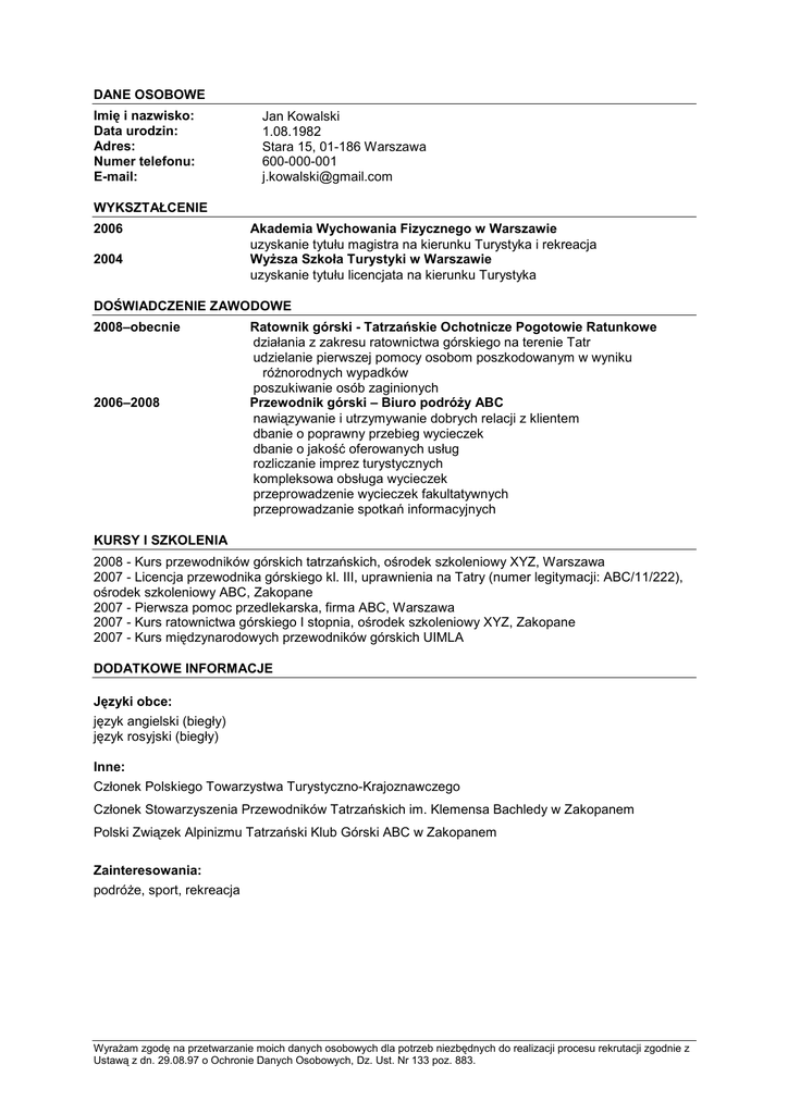 DANE OSOBOWE Imię i nazwisko: Data urodzin: Adres: Numer telefonu: E-mail: Jan Kowalski 1.08.1982 Stara 15, 01-186 Warszawa 600-000-001 [email protected] WYKSZTAŁCENIE 2006 2004 Akademia Wychowania Fizycznego w Warszawie uzyskanie tytułu magistra na kierunku Turystyka i rekreacja WyŜsza Szkoła Turystyki w Warszawie uzyskanie tytułu licencjata na kierunku Turystyka DOŚWIADCZENIE ZAWODOWE 2008–obecnie 2006–2008 Ratownik górski - Tatrzańskie Ochotnicze Pogotowie Ratunkowe działania z zakresu ratownictwa górskiego na terenie Tatr udzielanie pierwszej pomocy osobom poszkodowanym w wyniku róŜnorodnych wypadków poszukiwanie osób zaginionych Przewodnik górski – Biuro podróŜy ABC nawiązywanie i utrzymywanie dobrych relacji z klientem dbanie o poprawny przebieg wycieczek dbanie o jakość oferowanych usług rozliczanie imprez turystycznych kompleksowa obsługa wycieczek przeprowadzenie wycieczek fakultatywnych przeprowadzanie spotkań informacyjnych KURSY I SZKOLENIA 2008 - Kurs przewodników górskich tatrzańskich, ośrodek szkoleniowy XYZ, Warszawa 2007 - Licencja przewodnika górskiego kl. III, uprawnienia na Tatry (numer legitymacji: ABC/11/222), ośrodek szkoleniowy ABC, Zakopane 2007 - Pierwsza pomoc przedlekarska, firma ABC, Warszawa 2007 - Kurs ratownictwa górskiego I stopnia, ośrodek szkoleniowy XYZ, Zakopane 2007 - Kurs międzynarodowych przewodników górskich UIMLA DODATKOWE INFORMACJE Języki obce: język angielski (biegły) język rosyjski (biegły) Inne: Członek Polskiego Towarzystwa Turystyczno-Krajoznawczego Członek Stowarzyszenia Przewodników Tatrzańskich im. Klemensa Bachledy w Zakopanem Polski Związek Alpinizmu Tatrzański Klub Górski ABC w Zakopanem Zainteresowania: podróŜe, sport, rekreacja WyraŜam zgodę na przetwarzanie moich danych osobowych dla potrzeb niezbędnych do realizacji procesu rekrutacji zgodnie z Ustawą z dn. 29.08.97 o Ochronie Danych Osobowych, Dz. Ust. Nr 133 poz. 883.