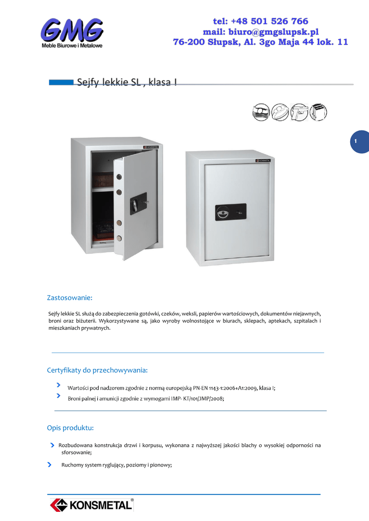 1 Zastosowanie: Sejfy lekkie SL służą do zabezpieczenia gotówki, czeków, weksli, papierów wartościowych, dokumentów niejawnych, broni oraz biżuterii. Wykorzystywane są, jako wyroby wolnostojące w biurach, sklepach, aptekach, szpitalach i mieszkaniach prywatnych. Certyfikaty do przechowywania: Opis produktu: Rozbudowana konstrukcja drzwi i korpusu, wykonana z najwyższej jakości blachy o wysokiej odporności na sforsowanie; Ruchomy system ryglujący, poziomy i pionowy; Konstrukcja rygla stałego uniemożliwiająca wyrwanie drzwi; System zawiasowania wewnętrznego, kąt otwarcia drzwi 900 ; Każdy model wyposażony w klamkę; Przystosowane do mocowania do podłoża; Gwarancja 24 miesiące. 2 Wyposażenie podstawowe: Zamek kluczowy kl. A z dwoma kluczami; Półki z regulacją wysokości zawieszenia; maksymalne obciążenie półki 50 kg; Dwa otwory do kotwienia (w modelu SL 26 – 1 otwór); Instrukcja obsługi i użytkowania wyrobu z kartą gwarancyjną. Wyposażenie dodatkowe: Rodzaje zamków: kluczowy szyfrowy elektroniczny Standardowe kolory: Jasnoszary RAL 7035 (domyślny przy zamówieniu, jeśli nie zaznaczono koloru); Jasnoszary RAL 9002 (należy zaznaczyć w zamówieniu, bezpłatny) Czarny RAL 9005 (należy zaznaczyć w zamówieniu, bezpłatny). 3 *Na indywidualne zamówienie wszystkie kolory z palety RAL (lakier proszkowy). Dane techniczne: Wymiary zewnętrzne [mm] Wymiary wewnętrzne [mm] Waga Pojemność [l] Model SL 26 W S G W S G 260 410 340 150 220 205 [kg] 9 45 SL 45 SL 67 450 490 440 348 388 295 670 490 440 568 388 295 80 40 65 109 SL100 1000 490 440 898 388 295 SL120 1200 490 440 1098 388 295 140 103 126 179 SL150 1500 490 440 1398 388 295 215 160 Półki [szt.] Skrytka* Dodatkowy zamek* SL 26 0 Nie Nie SL 45 1 Nie Tak SL 67 1 Tak Tak SL100 2 Tak Tak SL120 2 Tak Tak Model SL150 Model 2 Promień otwarcia drzwi R [mm] Tak Tak Prześwit drzwi [mm] W S SL 26 240 160 250 SL 45 378 350 323 SL 67 378 570 323 SL 100 378 900 323 SL 120 378 1100 323 SL 150 378 1300 323 4 Montaż do podłoża: Sejfy montowane są do podłoża dwoma stalowymi łącznikami rozporowymi (Rys.1). 5 Rys. 1 Głębokość kotwienia min. 65mm Beton min. C16/20 Aby zamontować sejf do podłoża należy: 1. Ustawić sejf w miejscu przeznaczenia. 2. Zdjąć zaślepkę z otworów w dnie wyrobu. 3. Nawiercić otwory w podłożu przez otwory w wyrobie na głębokość odpowiadającą długości łącznika rozporowego. 4. Ustawić sejf tak, aby otwory w dnie sejfu i otwory w podłożu nachodziły na siebie. 5. Włożyć kotwę i dokręcić nakrętkę. W przypadku, gdy śruba łącznika rozporowego po dokręceniu nakrętki wystaje powyżej dna wewnątrz sejfu, należy poluzować nakrętkę, a następnie wkrętakiem wkręcić śrubę i dokręcić nakrętkę. 6. Przykryć otwory zaślepką. W przypadku, gdy sejf jest za mały aby nawiercić otwory przez otwory w sejfie (wiertarka nie mieści się środka sejfu np. ze względu na wbudowane skarbczyki) należy: 1. Zmierzyć rozstaw otworów w sejfie. 2. Natrasować usytuowanie otworów na podłożu. 3. Nawiercić otwory w podłożu na głębokość odpowiadającą długości łącznika rozporowego. 4. Ustawić sejf tak, aby otwory w dnie sejfu i otwory w podłożu nachodziły na siebie. 5. Włożyć kotwę i dokręcić nakrętkę. W przypadku, gdy śruba łącznika rozporowego po dokręceniu nakrętki wystaje powyżej dna wewnątrz sejfu, należy poluzować nakrętkę, a następnie wkrętakiem wkręcić śrubę i dokręcić nakrętkę. 6. Przykryć otwory zaślepką. do Obsługa sejfu – otwieranie: UWAGA: W przypadku modelu SL26 należy obrócić klamkę o 45°. Pozostałe zapisy instrukcji pozostają bez zmian. 6 Otwieranie wyrobów wyposażonych tylko w zamek kluczowy: 1. Włożyć klucz do otworu zamka. 2. Obrócić klucz o kąt pow. 90° (pow.1/4 obrotu) zgodnie z ruchem wskazówek zegara, napotkany opór świadczy o otwarciu zamka, klucz musi pozostać w zamku (konstrukcja zamka kluczowego uniemożliwia wyjęcie klucza w pozycji otwartej zamka). 3. Obrócić klamkę o około 70° (niemal 1/5 obrotu) zgodnie z ruchem wskazówek zegara, napotkany opór świadczy o odblokowaniu mechanizmów drzwi. 4. Po odciągnięciu drzwi do siebie następuje otwarcie wyrobu. Otwieranie wyrobów wyposażonych tylko w zamek szyfrowy: 1. Otworzyć zamek szyfrowy wykonując czynności opisane w dołączonej instrukcji obsługi zamka szyfrowego. 2. Obrócić klamkę o około 70° (niemal 1/5 obrotu) zgodnie z ruchem wskazówek zegara, napotkany opór świadczy o odblokowaniu mechanizmów drzwi. 3. Po odciągnięciu drzwi do siebie następuje otwarcie wyrobu. Otwieranie wyrobów wyposażonych w zamki kluczowy i szyfrowy: 1. Otworzyć zamek szyfrowy zgodnie z dołączoną instrukcji obsługi zamka szyfrowego. 2. Włożyć klucz do otworu zamka. 3. Obrócić klucz o kąt pow. 90° (pow.1/4 obrotu) zgodnie z ruchem wskazówek zegara, napotkany opór świadczy o otwarciu zamka, klucz musi pozostać w zamku (konstrukcja zamka kluczowego uniemożliwia wyjęcie klucza w pozycji otwartej zamka). 4. Obrócić klamkę o około 70° (niemal 1/5 obrotu) zgodnie z ruchem wskazówek zegara, napotkany opór świadczy o odblokowaniu mechanizmów drzwi. 5. Po odciągnięciu drzwi do siebie, następuje otwarcie wyrobu. Otwieranie wyrobów wyposażonych w dwa zamki kluczowe: 1. Włożyć klucz do pierwszego otworu zamka. 2. Obrócić klucz o kąt pow. 90° (pow. 1/4 obrotu) zgodnie z ruchem wskazówek zegara, napotkany opór świadczy o otwarciu zamka, klucz musi pozostać w zamku (konstrukcja zamka kluczowego uniemożliwia wyjęcie klucza w pozycji otwartej zamka). 3. Otworzyć drugi zamek postępując jak wyżej. 5. Obrócić klamkę o około 70° (niemal 1/5 obrotu) zgodnie z ruchem wskazówek zegara, napotkany opór świadczy o odblokowaniu mechanizmów drzwi. 5. Odciągnąć drzwi do siebie, następuje otwarcie wyrobu. Obsługa sejfu – zamykanie: UWAGA: W przypadku modelu SL26 należy ob
