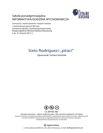 Szkoła ponadgimnazjalna INFORMATYKA/GODZINA WYCHOWAWCZA Scenariusz z wykorzystaniem nowych mediów i metod aktywizujących (90 min) Scenariusz zgodny z podstawą programową (Rozporządzenie Ministra Edukacji Narodowej z dn. 27 sierpnia 2012 r.). Sixto Rodríguez i „piraci” Opracował: Tomasz Sowiński CC BY-NC-ND Uznanie autorstwa - Użycie niekomercyjne - Bez utworów zależnych 3.0 Polska Licencja ta zezwala na rozpowszechnianie, przedstawianie i wykonywanie utworu jedynie w celach niekomercyjnych oraz pod warunkiem zachowania go w oryginalnej postaci (nie tworzenia utworów zależnych). creativecommons.org/licenses/by-nc-nd/3.0/pl ul. Marszałkowska 84/92 lok. 121, 00-514 Warszawa, e-mail: [email protected] Cele lekcji: Uczeń: - poznaje terminy z zakresu prawa autorskiego; - analizuje wpływ piractwa na jakość życia artystów; - nabywa umiejętności wyszukiwania legalnych sposobów użytkowania utworów audio i audiowizualnych, objętych ochroną własności intelektualnej; - kształtuje w sobie negatywną postawę wobec zjawiska piractwa; - kształtuje w sobie postawę poszanowania dla pracy artysty. Metody: - praca w grupach; - drama; - pogadanka; - burza mózgów; - projekcja filmu. Środki dydaktyczne: - karty pracy w postaci wniosków do zawarcia umowy licencyjnej; - dostęp do Internetu; - film Sugar Man w reżyserii Malika Bendjelloula. Powiązanie z podstawą programową z informatyki: wymagania ogólne: II. Wyszukiwanie, gromadzenie i przetwarzanie informacji z różnych źródeł; opracowywanie za pomocą komputera prezentacji multimedialnych. III. Rozwiązywanie problemów i podejmowanie decyzji z wykorzystaniem komputera. IV. Wykorzystanie komputera do poszerzania wiedzy i umiejętności z różnych dziedzin. wymagania szczegółowe: 7.3) Uczeń stosuje normy etyczne i prawne związane z rozpowszechnianiem programów komputerowych, bezpieczeństwem i ochroną danych oraz informacji w komputerze i w sieciach komputerowych; 7.4) Uczeń omawia zagadnienia przestępczości komputerowej, w tym piractwo komputerowe. Przygotowanie do lekcji: Kilka tygodni przed planowanymi zajęciami nauczyciel prosi uczniów, by przygotowali w parach portfolio/prezentację multimedialną wybranej gwiazdy z rankingu „Forbsa” (lub podobnego): Zack O'Malley Greenburg: Najlepiej zarabiający muzycy 2013, „Forbes” [online], 27 listopada 2013, aktualizacja 28.11.2013 [dostęp: 24 lutego 2014]. Dostępny w Internecie (link: http://www.forbes.pl/najlepiej-zarabiajacy-muzycy-2013,artykuly,167208,1,1.html). Przebieg lekcji: FAZA WSTĘPNA W dramie, która rozpocznie lekcję, wybrane pary odegrają następującą scenkę: do przedstawiciela prestiżowej firmy fonograficznej przybywa agent wybranego artysty i próbuje przekonać go do podpisania kontraktu. W prezentacji gwiazdy powinien wykazać jej pracowitość, dotychczasowe sukcesy oraz styl życia, który będzie utrzymywał gwiazdę na pierwszych stronach tabloidów, przynosząc jej popularność i napędzając mechanizm reklamy. Następnie nauczyciel prowadzi z uczniami pogadankę na temat pracy muzyków. Zadaje pytania: Co sadzą o przygotowaniach do nagrania płyty; o trasach koncertowych i samym procesie komponowania muzyki pisania tekstów, układania choreografii do teledysków?. Czy to jest praca, czy rozrywka? Czy za tę pracę należy się zapłata? FAZA REALIZACYJNA Nauczyciel powraca do tematu filmu Sugar Man, wcześniej obejrzanego z uczniami. Przeprowadza pogadankę na temat życia Sixto Rodrígueza. Pyta uczniów co spowodowało, iż wokalista, którego płyty dobrze sprzedawały się w RPA, żył na granicy ubóstwa? Czy film zmienił w jakiś sposób ich stosunek do „piractwa”? W pogadance nauczyciel odwołuje się do wypowiedzi uczniów z fazy wstępnej lekcji na temat pracy artystów. Następnie informuje uczniów o istniejącym prawie własności intelektualnej. Uczniowie siadają przed komputerami i na stronie kampanii Legalna Kultura szukają „Przewodnika po prawie autorskim”(http://legalnakultura.pl/pl/prawo-w-kulturze/b-przewodnik-b-po-prawie-autorskim). Nauczyciel dzieli uczniów na grupy. Każda z grup będzie miała za zadanie zapoznać się z podstawowymi definicjami związanymi z prawem autorskim (prawa autorskie, własność intelektualna, domena publiczna, dozwolony użytek, licencja, organizacje zbiorowego zarządzania itp.), a następnie krótko zaprezentować je własnymi słowami. Nauczyciel pokazuje uczniom oryginalne opakowanie filmu DVD (dystrybutor Gutek Film) i informuje ich, że gdyby oglądali film na lekcji, byłoby to działanie zgodne z prawem, które upoważnia szkołę do legalnego odtworzenia filmu, jeśli jest on środkiem do realizacji celów dydaktycznych zawartych w podstawie programowej kształcenia ogólnego. Następnie nauczyciel informuje uczniów, iż w przypadku, gdyby chcieli zorganizować nieodpłatny seans otwarty dla wszystkich chętnych, musieliby wcześniej wykupić licencję. Uczniowie otwierają stronę internetową ZAiKS (http://www.zaiks.org.pl). Po krótkiej prezentacji strony, nauczyciel rozdaje uczniom wydrukowane z odpowiedniej strony (http://www.zaiks.org.pl/92,27,wzory_wnioskow) wnioski umów licencyjnych, np.: wniosek o zawarcie umowy dla jednorazowej projekcji filmu (http://www.zaiks.org.pl/pliki/92/5_4WniosekKinaJednorazowa.pdf); wniosek o zawarcie umowy licencyjnej na wykonywanie utworów podczas imprezy (http://www.zaiks.org.pl/pliki/92/7_1WniosekIWykazUtworow.pdf); wniosek o zawarcie umowy licencyjnej na odtworzenie utworów podczas imprezy (http://www.zaiks.org.pl/pliki/92/10_1WniosekLI.pdf); wniosek o zawarcie umowy licencyjnej na umieszczenie utworów na stronie internetowej (http://www.zaiks.org.pl/pliki/92/Wniosek_internet_K1.pdf). Uczniowie w grupach wypełniają wnioski. FAZA PODSUMOWUJĄCA W fazie podsumowującej nauczyciel przeprowadza z uczniami trzecią pogadankę. Tym razem odwołuje się do ich własnych odczuć. Nauczyciel pyta, jak w