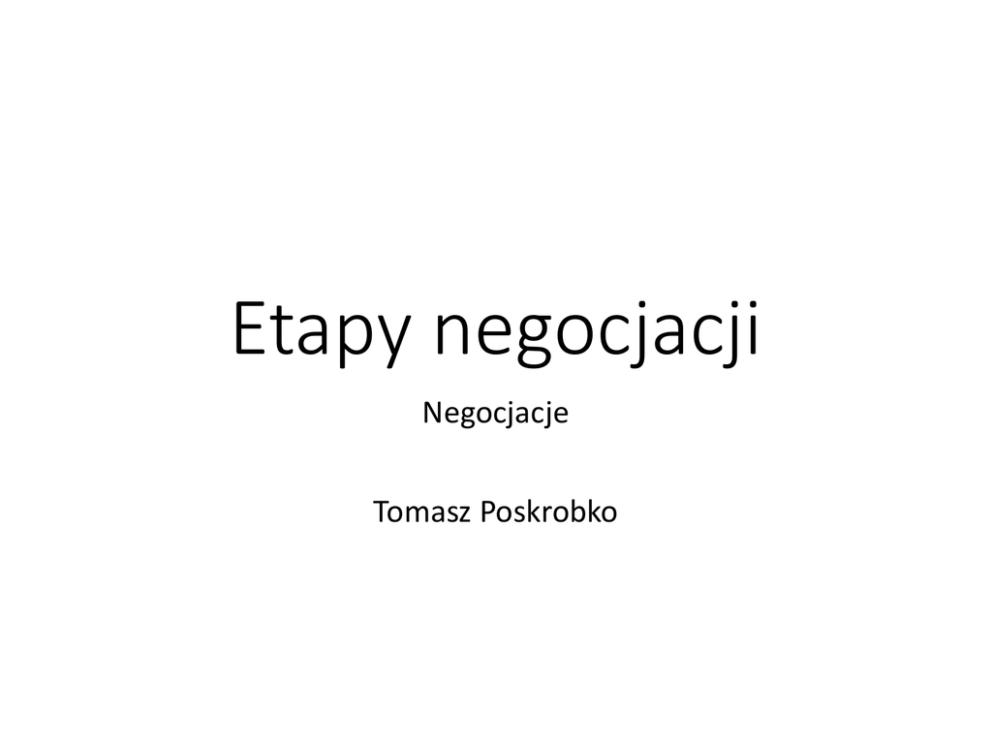 Etapy negocjacji Negocjacje Tomasz Poskrobko Ogólny model procesu negocjacji Etap wstępny (przygotowania) Etap środkowy (właściwe negocjacje) Etap końcowy (finalizacja rozmów) Etap ponegocjacyjny Ogólny model procesu negocjacji Etap wstępny (przygotowania) Etap środkowy (właściwe negocjacje) Etap końcowy (finalizacja rozmów) Etap ponegocjacyjny Etap wstępny analiza sytuacji konfliktowej ocena drugiej strony ustalenie spraw organizacyjnych analiza wzajemnych relacji wybór taktyki i strategii Etap wstępny analiza sytuacji konfliktowej ocena drugiej strony ustalenie spraw organizacyjnych analiza wzajemnych relacji wybór taktyki i strategii Stanowisko i interes Stanowisko to żądanie dotyczące czegoś konkretnego (np. wysokość opłat, jakość towaru, czas pracy). Stanowisko to sposób w jaki strony chcą realizować swoje interesy Interesy to motywacje, które prowadzą do określonych stanowisk. Przedmiot sporu zdefiniowanie przedmiotu sporu przygotowanie listy problemów i zagadnień podział zagadnień na logiczne grupy podział grup wg kryteriów (np. ważności, konfliktowości) Analiza celów określenie celów dla każdej z grup zagadnień doprecyzowanie celów ustalenie sposobu wyrażania celów ustalenie warunków brzegowych ustalenie BANTA Warunki brzegowe CEL NEGOCJACJI Idealny • to co chcemy osiągnąć, jeśli wszystko się ułoży, • maksimum tego, czego spodziewamy się uzyskać, • od tego zaczynamy negocjacje. Minimalny • bez osiągnięcia tego, negocjacje będą całkowitą porażką, • granica, poza którą negocjacje tracą sens, • zaczynamy go uwzględniać pod koniec negocjacji BATNA BATNA • wymyślenie wszystkich możliwych działań, jakie będzie można podjąć, jeśli porozumienie nie zostanie osiągnięte • udoskonalenie kilku najbardziej obiecujących pomysłów i przekształcenie ich w praktyczne możliwości działania • doskonalenie tymczasowego wyboru jednej z możliwości – tej, która wydaje się najlepsza. Zalety BATNA Brak BANTA BANTA • akceptacja rozwiązania, • większa siła negocjacji, które nie jest optymalne • większa pewność (zbyt duże ustępstwa) siebie, • odrzucenie • więcej argumentów porozumienia, które nie uzasadniających nasze jest idealne, ale jest interesy. lepsze niż alternatywa, Etap wstępny analiza sytuacji konfliktowej ocena drugiej strony ustalenie spraw organizacyjnych analiza wzajemnych relacji wybór taktyki i strategii Ocena drugiej strony • Ogólna informacja (np. kondycja firmy, wiarygodność, …) • Cele (również ukryte) i ich ważność • Stanowiska i interesy • Kto ma wpływ na negocjacje? Etap wstępny analiza sytuacji konfliktowej ocena drugiej strony ustalenie spraw organizacyjnych analiza wzajemnych relacji wybór taktyki i strategii Wzajemne relacje • Ważność naszych celów dla drugiej strony • BATNA i ZOPA • Przewidywane trudności • Możliwości rekompensaty BANTA i ZOPA Cel idealny Cel minimalny Strona 1 Strona 2 BATNA Cel idealny ZOPA BATNA Cel minimalny BANTA i ZOPA Cel idealny Cel minimalny Strona 1 Strona 2 BATNA BATNA Cel idealny Cel minimalny Etap wstępny analiza sytuacji konfliktowej ocena drugiej strony ustalenie spraw organizacyjnych analiza wzajemnych relacji wybór taktyki i strategii Sprawy organizacyjne • Ilość możliwych sesji i deadline • Wybór negocjatora i mediatora • Wybór miejsca spotkania Liczba ustępstw Czas w negocjacjach Czas Wybór miejsca U drugiej strony Neutralne miejsce U siebie Miejsce Etap wstępny analiza sytuacji konfliktowej ocena drugie strony ustalenie spraw organizacyjnych analiza wzajemnych relacji wybór taktyki i strategii Przygotowanie strategii • Oferta wejścia • Przygotowanie argumentacji • Przygotowania sposobów łagodzenia napięcia • Obranie konkretnej strategii max Rodzaje negocjacji Przegrany Wygrany Porozumienie Przegrany Wygrany Przegrany Przegrany min Interesy partnera min Moje interesy max Strategie negocjacji Strategia pozycyjna Strategia problemowa Strategia pozycyjna • Celem jest uzyskanie jak najwięcej • Koncentracja na obronnie własnego stanowiska • Druga strona jest przeciwnikiem • Podważanie argumentów przeciwnika • Ludzie Podejście Harvardzkie (strategia problemowa) Problem + człowiek • należy oddzielić ludzi od problemu; Interes • w negocjacjach trzeba koncentrować się na interesach, a nie na zajmowanych przez strony stanowiskach; Porozumienie • należy dążyć do wypracowania rozstrzygnięcia satysfakcjonującego i korzystnego dla obu stron; Obiektywizm • konflikt należy rozwiązywać w oparciu o neutralne, obiektywne kryteria Ogólny model procesu negocjacji Etap wstępny (przygotowania) Etap środkowy (właściwe negocjacje) Etap końcowy (finalizacja rozmów) Etap ponegocjacyjny Ogólny model procesu negocjacji Etap wstępny (przygotowania) Etap środkowy (właściwe negocjacje) Etap końcowy (finalizacja rozmów) Etap ponegocjacyjny Etapy negocjacji właściwych Otwarcie negocjacji Przedstawienie oferty obu stron Ustalenie zagadnień nie wymagających dalszych negocjacji Ustalenie kolejności negocjowania zagadnień Rozmowy właściwe (targowanie się) Styl negocjacji Predyspozycje Styl negocjacji Świadomy wybór Dominacja Integratywne negocjacje Dopasowanie się Typy negocjatora Kompromis Unikanie Dominacja Integratywne negocjacje Dopasowanie się Typy negocjatora Kompromis Unikanie Cechy stylu dominującego • przeciwnicy są wrogami • ustępstwa jako warunek wzajemnych stosunków • twardość w stosunku do ludzi oraz problemu • całkowity brak zaufania • stosowanie gróźb i wprowadzanie w błąd • poszukiwanie jedynie rozwiązania korzystnego dla strony dominującej Wady i zalety stylu dominującego osiąganie maksimum korzyści prawdopodobieństwo zerwania kontraktu wytworzenie niechęci drugiej strony złe stosunki zła opinia Dominacja Integratywne negocjacje Dopasowanie się Typy negocjatora Kompromis
