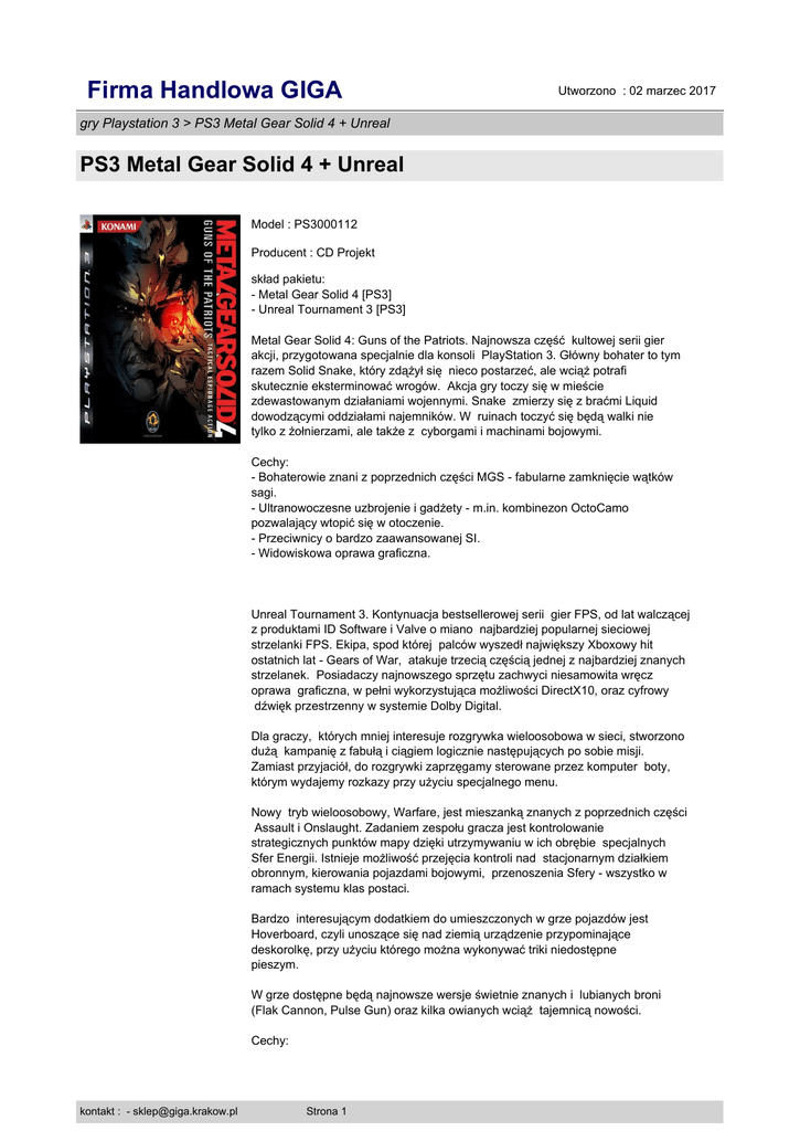 Firma Handlowa GIGA Utworzono : 02 marzec 2017 gry Playstation 3 > PS3 Metal Gear Solid 4 + Unreal PS3 Metal Gear Solid 4 + Unreal Model : PS3000112 Producent : CD Projekt skład pakietu: - Metal Gear Solid 4 [PS3] - Unreal Tournament 3 [PS3] Metal Gear Solid 4: Guns of the Patriots. Najnowsza część kultowej serii gier akcji, przygotowana specjalnie dla konsoli PlayStation 3. Główny bohater to tym razem Solid Snake, który zdążył się nieco postarzeć, ale wciąż potrafi skutecznie eksterminować wrogów. Akcja gry toczy się w mieście zdewastowanym działaniami wojennymi. Snake zmierzy się z braćmi Liquid dowodzącymi oddziałami najemników. W ruinach toczyć się będą walki nie tylko z żołnierzami, ale także z cyborgami i machinami bojowymi. Cechy: - Bohaterowie znani z poprzednich części MGS - fabularne zamknięcie wątków sagi. - Ultranowoczesne uzbrojenie i gadżety - m.in. kombinezon OctoCamo pozwalający wtopić się w otoczenie. - Przeciwnicy o bardzo zaawansowanej SI. - Widowiskowa oprawa graficzna. Unreal Tournament 3. Kontynuacja bestsellerowej serii gier FPS, od lat walczącej z produktami ID Software i Valve o miano najbardziej popularnej sieciowej strzelanki FPS. Ekipa, spod której palców wyszedł największy Xboxowy hit ostatnich lat - Gears of War, atakuje trzecią częścią jednej z najbardziej znanych strzelanek. Posiadaczy najnowszego sprzętu zachwyci niesamowita wręcz oprawa graficzna, w pełni wykorzystująca możliwości DirectX10, oraz cyfrowy dźwięk przestrzenny w systemie Dolby Digital. Dla graczy, których mniej interesuje rozgrywka wieloosobowa w sieci, stworzono dużą kampanię z fabułą i ciągiem logicznie następujących po sobie misji. Zamiast przyjaciół, do rozgrywki zaprzęgamy sterowane przez komputer boty, którym wydajemy rozkazy przy użyciu specjalnego menu. Nowy tryb wieloosobowy, Warfare, jest mieszanką znanych z poprzednich części Assault i Onslaught. Zadaniem zespołu gracza jest kontrolowanie strategicznych punktów mapy dzięki utrzymywaniu w ich obrębie specjalnych Sfer Energii. Istnieje możliwość przejęcia kontroli nad stacjonarnym działkiem obronnym, kierowania pojazdami bojowymi, przenoszenia Sfery - wszystko w ramach systemu klas postaci. Bardzo interesującym dodatkiem do umieszczonych w grze pojazdów jest Hoverboard, czyli unoszące się nad ziemią urządzenie przypominające deskorolkę, przy użyciu którego można wykonywać triki niedostępne pieszym. W grze dostępne będą najnowsze wersje świetnie znanych i lubianych broni (Flak Cannon, Pulse Gun) oraz kilka owianych wciąż tajemnicą nowości. Cechy: kontakt : - [email protected] Strona 1 Firma Handlowa GIGA Utworzono : 02 marzec 2017 gry Playstation 3 > PS3 Metal Gear Solid 4 + Unreal PS3 Metal Gear Solid 4 + Unreal - Najlepsza grafika na rynku, pełne wsparcie DirectX10. - Nowy tryb gry - Warfare - walka o kontrolę nad strategicznymi punktami mapy. - Podział na klasy postaci w trybie Warfare. - Nowe pojazdy, w tym deska Hoverboard i przypominający motocykl Viper. - Kampania single player i cooperative - wspólna walka z kontrolowanymi przez komputer botami. - Nowe bronie oraz podrasowane wersje starych faworytów. Cena : 129,90 zł Brutto ( 129,90 zł Netto) kontakt : - [email protected] Strona 2