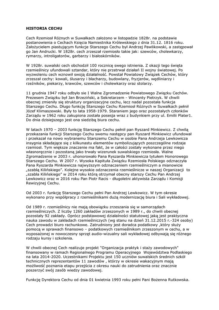HISTORIA CECHU Cech Rzemiosł Różnych w Suwałkach założono w listopadzie 1828r. na podstawie postanowienia o Cechach Księcia Namiestnika Królewskiego z dnia 31.12. 1816 roku. Założycielem piastującym funkcje Starszego Cechu był Andrzej Pawlikowski, a zastępował go Jan Andrucki. W 1828r. cech zrzeszał rzemiosło takie jak: szewców, cholewkarzy, rymarzy, introligatorów, garbarzy i białoskórników. W 1928r. suwalski cech obchodził 100 rocznicę swego istnienia. Z okazji tego święta rzemieślnicy ufundowali sztandar, który nie przetrwał działań II wojny światowej. Po wyzwoleniu cech wznowił swoją działalność. Powstał Powiatowy Związek Cechów, który zrzeszał cechy: kowali, ślusarzy i blacharzy, budowlany, fryzjerów, wędliniarzy i rzeźników, piekarzy, krawców, szewców i cholewkarzy oraz stolarzy. 11 grudnia 1947 roku odbyło sie I Walne Zgromadzenie Powiatowego Związku Cechów. Prezesem Związku był Jan Brzeziński, a Sekretarzem - Wincenty Pietrzyk. W chwili obecnej zmieniły się struktury organizacyjne cechu, lecz nadal pozostała funkcja Starszego Cechu. Długo funkcję Starszego Cechu Rzemiosł Różnych w Suwałkach pełnił Józef Klimaszewski. Były to lata 1958-1979. Staraniem jego oraz pozostałych członków Zarządu w 1962 roku zakupiona została posesja wraz z budynkiem przy ul. Emilii Plater1. Do dnia dzisiejszego jest ona siedzibą biura cechu. W latach 1970 – 2003 funkcję Starszego Cechu pełnił pan Ryszard Minkiewicz. Z chwilą przekazania funkcji Starszego Cechu swemu następcy pan Ryszard Minkiewicz ufundował i przekazał na nowo wybranemu Starszemu Cechu w osobie Pana Andrzeja Lewkowicza insygnia składające się z kilkunastu elementów symbolizujących poszczególne rodzaje rzemiosł. Tym większe znaczenie ma fakt, że w całości zostały wykonane przez niego własnoręcznie i pozostaną jako trwały wizerunek suwalskiego rzemiosła. Walne Zgromadzenie w 2003 r. uhonorowało Pana Ryszarda Minkiewicza tytułem Honorowego Starszego Cechu. W 2007 r. Wysoka Kapituła Związku Rzemiosła Polskiego odznaczyła Pana Ryszarda Minkiewicza najwyższym odznaczeniem rzemieślniczym a mianowicie „szablą Kilińskiego”. Kolejne wysokie odznaczenia rzemieślnicze w naszej Organizacji to „szabla Kilińskiego” w 2014 roku którą otrzymał obecny starszy Cechu Pan Andrzej Lewkowicz oraz w 2016 roku Pan Piotr Racis - długoletni aktywista Zarządu i Komisji Rewizyjnej Cechu. Od 2003 r. funkcję Starszego Cechu pełni Pan Andrzej Lewkowicz. W tym okresie wykonano przy współpracy z rzemieślnikami dużą modernizację biura i Sali wykładowej. Od 1989 r. rzemieślnicy nie mają obowiązku zrzeszania się w samorządach rzemieślniczych. Z liczby 1260 zakładów zrzeszonych w 1989 r., do chwili obecnej pozostały 92 zakłady. Oprócz podstawowej działalności statutowej jaką jest praktyczna nauka zawodu w zakładach rzemieślniczych (wg stanu na dzień 31.12.2015 r.-324 osoby) Cech prowadzi biuro rachunkowe. Zatrudniony jest doradca podatkowy ,który służy pomocą w sprawach finansowo – podatkowych rzemieślnikom zrzeszonym w cechu, a w wyposażonej w nowoczesny sprzęt audio-wizualny sali wykładowej odbywają się różnego rodzaju kursy i szkolenia. W chwili obecnej Cech realizuje projekt "Organizacja praktyk i staży zawodowych" finansowany w ramach Regionalnego Programu Operacyjnego Województwa Podlaskiego na lata 2014-2020. Uczestnikami Projektu jest 150 uczniów suwalskich średnich szkół technicznych reprezentantów 11 zawodów , którzy w okresie wakacyjnym mają możliwość poznania etapu przejścia z okresu nauki do zatrudnienia oraz znacznie poszerzyć swój zasób wiedzy zawodowej. Funkcję Dyrektora Cechu od dnia 01 kwietnia 1993 roku pełni Pani Bożenna Rutkowska.