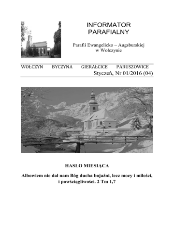 INFORMATOR PARAFIALNY Parafii Ewangelicko – Augsburskiej w Wołczynie WOŁCZYN BYCZYNA GIERAŁCICE PARUSZOWICE Styczeń, Nr 01/2016 (04) HASŁO MIESIĄCA Albowiem nie dał nam Bóg ducha bojaźni, lecz mocy i miłości, i powściągliwości. 2 Tm 1,7 Parafia Ewangelicko-Augsburska w Wołczynie (Wołczyn, Byczyna, Gierałcice, Paruszowice) Pl. Wolności 5, 46-250 Wołczyn Nr konta: 51 88760009 0000 1788 2000 0001 Kontakt: [email protected] Tel.: (77) 414 52 77 Duchowny: Proboszcz: ks. Sebastian Olencki e-mail: [email protected] kom. 533 759 399 Adresy kościołów: Kościół Ewangelicki w Wołczynie – ul. Byczyńska 6. Kościół Ewangelicki w Byczynie – Plac Wolności 1. Kościół Ewangelicki w Gierałcicach – Gierałcice 68a. Kościół Ewangelicki w Paruszowicach – Paruszowice 1 strona internetowa: www.wolczyn.luteranie.pl Słowo od Duszpasterza „Wszystko, cokolwiek czynicie w słowie lub w uczynku, wszystko czyńcie w imieniu Pana Jezusa, dziękując przez niego Bogu Ojcu.” Tymi słowami Apostoła Pawła z listu do Kolosan 3,17 wkraczamy w Nowy Rok. Styczeń to czas podsumować, rozliczeń budżetowych, bilanse, dane statystyczne. Początek Roku to czas wspomnień, postanowień oraz nowych wyzwań. Niektórzy z Nas chcieliby już zapomnieć o 2015r. Dla Nas jako rodziny pastorskiej jest to czas dziękczynienia za Was, za nasz zbór. Za minione trzy miesiące Starego Roku. Za Wasze zaangażowanie w życie parafii. Za wkład Waszych serc. Za Waszą pomoc w naszym starcie. Nie jestem w stanie wszystkich wyliczyć, ale jest Was wielu. Dlatego niech podziękowaniem będzie Słowo Boże. Wprawdzie nie jest ono materialne, ale jest tym czego nam dzisiaj brakuje. „Najpierw dziękuję Bogu mojemu przez Jezusa Chrystusa za was wszystkich, że wiara wasza słynie po całym świecie.” (Rz 1,8). Tam gdzie przebywam, chwalę się Wami, proszę również o modlitwę za Nas, a także o wsparcie. Przypomina mi się historia pierwszego zboru, który sprzedał całą swoją majętność, oczekując rychłego przyjścia Chrystusa. Kiedy okazało się, że tych materialnych dóbr zabrakło, a Chrystus nie przychodzi nic innego nie pozostało jak wierzyć. Ale czy człowiek nakarmi się samą wiarą? Apostołowie musieli zakasać rękawy i ruszyć w świat, głosząc Ewangelię. W szczególności Apostoł Paweł zdobył się na wielką odwagę – zaczął podróżować po ówczesnym mu świecie zbierając datki i pieniądze na Zbór w Jerozolimie. Pierwszy budżet zboru chrześcijańskiego zamknął się na wielkim minusie. Nie oznacza to, że my musimy naśladować pierwsze zbory. Żyjemy dzisiaj, a nie kiedyś. Nasze warunki diametralnie się różnią. Borykamy się z własnymi problemami. Ubóstwo nie jest niczym dobrym, prowadzi często do marginalizacji i patologii. Bogactwo jeśli jest zrównoważone i dobrze przemyślane może być błogosławieństwem. Taka odwrotność. Nie zapominajmy, że nie chodzi o ubóstwo, ani o bogactwo. Chodzi o ubóstwo i bogactwo w Duchu. O wiele trudniej dzisiaj jest nam dawać, łatwiej brać. O wiele trudniej dzielić się, o wiele łatwiej prowadzić spory. O wiele łatwiej wydać natychmiastową opinię co trzeba zrobić! Gorzej już z naszym wykonaniem! Mamy wiele pomysłów na czyjeś życie! Pismo Święte głosi, że większe błogosławieństwo jest w dawaniu niż w braniu. Kiedy człowiek obdarowuje z pomyślunkiem i przekonaniem wychodzi mu to na zdrowie. Pomagajmy! Ale czyńmy to z rozwagą. Patrzmy komu pomagamy i czy nasza pomoc jest efektywna. Ktoś może pogardzić naszą dobroczynnością. Może powiem przewrotne słowa. Zaryzykuje. Nieśmy pomoc tym, którzy jej potrzebują, a nie tym którzy ją stale trwonią. Pomagajmy tak, aby ludzie wyszli sami z biedy i sami mogli sobie pomóc. Dawać mądrze! Życzę wraz z moją rodziną wielu błogosławieństw w nadchodzącym Roku Pańskim. ks. Sebastian Olencki Kącik dla dzieci DOLINA CHARIS 4. Niedźwiedzica Nad Doliną Charis wstał kolejny dzień. Ciepłe promienie wschodzącego słońca rozchyliły kielichy kwiatów uwalniając barwne stworzenia. Tafla jeziora pokryła się dywanem maleńkich skrzydlatych stworzeń, które jak co rano oddawały cześć i chwałę Stwórcy. Ptaki śpiewały pochwalne pieśni, a lekki poranny wietrzyk budził resztę mieszkańców doliny. Tego ranka Sasanka i Pierwiosnek mieli sprawdzić co dzieje się w rodzinie niedźwiedzi. Kiedy dotarli do groty zauważyli coś bardzo niepokojącego. Mama niedźwiedzica leżała bez ruchu, a jej mały synek miotał się w koło nie mogąc znaleźć dla siebie miejsca. - Co się stało? – Zapytał Pierwiosnek małego niedźwiadka. - Moja mama bardzo źle się czuje – odparł – mówi, że bardzo boli ją brzuch i nie ma siły wstać. – Kiedy to powiedział, niedźwiadek spuścił głowę i położył się na kępce trawy. - Sasanko – zawołała cichym głosem niedźwiedzica - zaopiekuj się moim synkiem ja muszę odpocząć. - Sasanka podfrunęła jak najbliżej ucha niedźwiedzicy i swoim ciepłym głosem wyszeptała: - nie trać nadziei. Sasanka zajęła się małym niedźwiadkiem, a Pierwiosnek pofrunął do doliny Charis, aby poinformować, co się stało. Kiedy stworzenia to usłyszały, natychmiast wzbiły się w górę i poleciały do groty niedźwiedzi. - Witam Pani niedźwiedzico – powiedziało jedno ze stworzeń – Każdy z nas otrzymał od Stwórcy dar, którym może pomagać innym. Przedstawiam pani Fiołka, jest nieśmiały, ale myślę, że może pani pomóc. Fiołek zbliżył się do chorej, na jego widok niedźwiedzica od razu poczuła przepełniający ją pokój. - Czy pani wierzy, że Ten, który nas stworzył może panią uleczyć? – niedźwiedzica spojrzała na niego swoimi wielkimi oczami i pokiwała głową. Stworzenia uniosły się w górę i zaczęły nucić spokojną pieśń. Fiołek śpiewał na tle chóru jak solista. Z każdą nutą niedźwiedzica czuła jak ból ustępuj