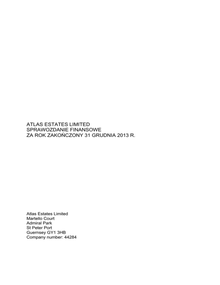 ATLAS ESTATES LIMITED SPRAWOZDANIE FINANSOWE ZA ROK ZAKOŃCZONY 31 GRUDNIA 2013 R. Atlas Estates Limited Martello Court Admiral Park St Peter Port Guernsey GY1 3HB Company number: 44284 ATLAS ESTATES LIMITED Spis treści Strona 3 Wstęp 4 Wybrane dane finansowe 5 List Przewodniczącego Rady Dyrektorów 9 Raport Zarządzającego Nieruchomościami 20 Opis portfela nieruchomości 22 Członkowie Rady Dyrektorów – Atlas Estates Limited 23 Członkowie Rady Dyrektorów i zespół zarządzający wyższego szczebla – Atlas Management Company Limited (Zarządzający Nieruchomościami) 24 Sprawozdanie Rady Dyrektorów 34 Raport w sprawie wynagrodzeń 37 Oświadczenia Rady Dyrektorów 38 Raport niezależnego biegłego rewidenta 39 Sprawozdanie finansowe 43 Stosowane zasady rachunkowości 48 Noty do sprawozdania finansowego 58 Główne jednostki zależne oraz spółki joint venture 2 ATLAS ESTATES LIMITED Wstęp Atlas Estates Limited („Atlas” lub „Spółka”) jest spółką inwestycyjną zamkniętą wpisaną do rejestru na wyspie Guernsey, inwestującą w nieruchomości w krajach Europy Środkowo-Wschodniej. Akcje Spółki zostały dopuszczone do obrotu na Giełdzie Papierów Wartościowych w Warszawie 12 lutego 2008 r. Spółka i jej jednostki zależne („Grupa”) prowadzą działalność inwestycyjną głównie na rynku nieruchomości w Polsce. Obecnie Grupa prowadzi również działalność na rynkach nieruchomości na Węgrzech, w Rumunii i Bułgarii. Aktywa Spółki są zarządzane przez Atlas Management Company Limited („AMC”), spółkę skupiającą swoją działalność na zarządzaniu portfelem nieruchomości Grupy. AMC zapewnia Grupie zespół menedżerów dysponujący doświadczeniem i dogłębną znajomością procesów inwestycyjnych na rynku nieruchomości oraz działalności deweloperskiej. AMC posiada w szczególności ugruntowane doświadczenie w zarządzaniu działalnością inwestycyjną i deweloperską oraz nieruchomościami w krajach Europy Środkowej i Wschodniej. Spółka nie posiada żadnych znaczących transakcji operacyjnych, w związku z czym komentarz i najważniejsze dane finansowe zawarte w „Liście Przewodniczącego Rady Dyrektorów" i w „Raporcie Zarządzającego Nieruchomościami" stanowią komentarz i dane finansowe Grupy. 3 ATLAS ESTATES LIMITED Wybrane dane finansowe Wybrane pozycje sprawozdania finansowego Rok zakończony 31 grudnia 2013 r. w tys. EUR Rok zakończony 31 grudnia 2012 r. w tys. EUR (3 997) 3 544 (3 325) (3 778) 172 (3 658) (3 658) 925 6 995 6 070 169 6 225 6 225 (1 788) (1 316) 1 788 1 480 - 164 104 224 309 104 533 (3 133) (2 923) (6 056) 98 477 103 056 318 103 374 (518) (721) (1 239) 102 135 46 852 014 46 852 014 (7,8) 13,3 Koszty administracyjne Pozostałe przychody operacyjne Pozostałe koszty operacyjne (Strata)/ zysk z działalności operacyjnej Przychody finansowe (Strata)/ zysk brutto (Strata)/ zysk za rok Przepływy pieniężne netto z działalności operacyjnej Przepływy pieniężne netto z działalności inwestycyjnej Zwiększenie/(zmniejszenie) stanu środków pieniężnych i ich ekwiwalentów w ciągu roku Aktywa trwałe Aktywa obrotowe Aktywa ogółem Zobowiązania długoterminowe Zobowiązania krótkoterminowe Zobowiązania ogółem Aktywa netto Liczba akcji wyemitowanych (Strata podstawowa)/ Zysk podstawowy na akcję zwykłą o wartości nominalnej 0,01 EUR (w eurocentach) 4 ATLAS ESTATES LIMITED List Przewodniczącego Rady Dyrektorów Szanowni Akcjonariusze! Z przyjemnością przekazuję Państwu wyniki finansowe Atlas Estates Limited („Atlas”, „Spółka”) i jej jednostek zależnych (łącznie „Grupa”) za rok zakończony 31 grudnia 2013 r. Biorąc pod uwagę warunki panujące obecnie na rynkach finansowych, priorytetem jest dla nas poprawa płynności i uzyskanie dostępu do kapitału. Osiągnięcie obydwóch tych celów ma szczególne znaczenie dla Grupy, ponieważ stanowi podstawę działań podejmowanych w celu ukończenia obecnie realizowanych inwestycji, a jednocześnie sprzyja rozwojowi prowadzonej działalności. Mimo trudnych warunków prowadzenia działalności Grupa osiągnęła kilka kluczowych celów: - inwestycje mieszkaniowe realizowane obecnie przez Grupę w Warszawie (Apartamenty przy Krasińskiego, Concept House i Capital Art Apartments - etap III i IV) znakomicie wychodzą naprzeciw utrzymującemu się popytowi na wysokiej jakości powierzchnię mieszkaniową, o czym świadczy wysoki poziom sprzedaży i przedsprzedaży (zob. „Raport Zarządzającego Nieruchomościami", str. 14). W kwietniu i lipcu 2013 r. Grupa z powodzeniem ukończyła budowę dwóch wspomnianych wyżej inwestycji (odpowiednio, Concept House i Apartamenty przy Krasińskiego), dzięki czemu wykazała znaczny zysk brutto ze sprzedaży apartamentów 2013 r., w wysokości 9,1 mln EUR. - sukces w segmencie deweloperskim ułatwił pełną spłatę kredytów zaciągniętych na sfinansowanie inwestycji Apartamenty przy Krasińskiego, Platinum Towers i Concept House, odpowiednio, w lipcu 2013 r., grudniu 2013 r. i lutym 2014 r. - we wrześniu 2013 r. Grupa pozyskała finansowanie kredytowe dla projektu Galeria Platinum Towers w Warszawie. Kredyt w wysokości 4,3 mln EUR zaciągnięto w celu refinansowania kredytu udzielonego na potrzeby projektu Platinum Towers. - w październiku 2013 r. Grupa podpisała umowę zmieniającą umowę wcześniej zawartą z Erste Bank. Zmiana polegała na przedłużeniu terminu spłaty kredytów objętych umową o wspólnym zabezpieczeniu (zob. „Raport Zarządzającego Nieruchomościami", str. 12). Po przedłużeniu terminu spłaty kredyty te, w kwocie 90,9 mln EUR, zostały przeniesione do zobowiązań długoterminowych, co pozytywnie wpłynęło na saldo kapitału pracującego Grupy. Wykazane wyniki Spółka wykazała stratę w kwocie 3,7 mln EUR (wobec zysku na poziomie 6,2 mln EUR odnotowanego w poprzednim roku), przede wszystkim w związku z wynagrodzeniem za wyniki w wysokości 2,9 m