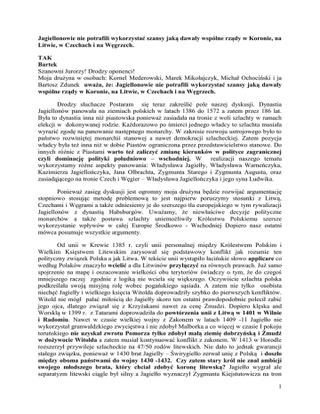 Jagiellonowie nie potrafili wykorzystać szansy jaką dawały wspólne rządy w Koronie, na Litwie, w Czechach i na Węgrzech. TAK Bartek Szanowni Jurorzy! Drodzy oponenci! Moja drużyna w osobach: Kornel Mederowski, Marek Mikołajczyk, Michał Ochociński i ja Bartosz Zdunek uważa, że: Jagiellonowie nie potrafili wykorzystać szansy jaką dawały wspólne rządy w Koronie, na Litwie, w Czechach i na Węgrzech. Drodzy słuchacze Postaram się teraz zakreślić pole naszej dyskusji. Dynastia Jagiellonów panowała na ziemiach polskich w latach 1386 do 1572 a zatem przez 186 lat. Była to dynastia inna niż piastowska ponieważ zasiadała na tronie z woli szlachty w ramach elekcji w dokonywanej rodzie. Każdorazowo po śmierci jednego władcy to szlachta musiała wyrazić zgodę na panowanie następnego monarchy. W zakresie rozwoju ustrojowego było to państwo rozwiniętej monarchii stanowej a nawet demokracji szlacheckiej. Zatem pozycja władcy była też inna niż w dobie Piastów ograniczona przez przedstawicielstwo stanowe. Do innych różnic z Piastami warto też zaliczyć zmianę kierunków w polityce zagranicznej czyli dominację polityki południowo – wschodniej. W realizacji naszego tematu wykorzystamy różne aspekty panowania: Władysława Jagiełły, Władysława Warneńczyka, Kazimierza Jagiellończyka, Jana Olbrachta, Zygmunta Starego i Zygmunta Augusta, oraz zasiadąjącego na tronie Czech i Węgier – Władysława Jagiellończyka i jego syna Ludwika. Ponieważ zasięg dyskusji jest ogromny moja drużyna będzie rozwijać argumentację stopniowo stosując metodę problemową to jest najpierw poruszymy stosunki z Litwą, Czechami i Węgrami a także odniesiemy je do szerszego tła europejskiego w tym rywalizacji Jagiellonów z dynastią Habsburgów. Uważamy, że niewłaściwe decyzje polityczne monarchów a także postawa szlachty uniemożliwiły Królestwu Polskiemu szersze wykorzystanie wpływów w całej Europie Środkowo - Wschodniej Dopiero nasz ostatni mówca posumuje wszystkie argumenty. Od unii w Krewie 1385 r. czyli unii personalnej między Królestwem Polskim i Wielkim Księstwem Litewskim zarysował się podstawowy konflikt jak rozumie ten polityczny związek Polska a jak Litwa. W tekście unii wystąpiło łacińskie słowo applicare co według Polaków znaczyło wcielić a dla Litwinów przyłączyć na równych prawach. Już samo spojrzenie na mapę i oszacowanie wielkości obu terytoriów świadczy o tym, że do czegoś mniejszego raczej zgodnie z logiką nie wciela się większego. Oczywiście szlachta polska podkreślała swoją misyjną rolę wobec pogańskiego sąsiada. A zatem nie tylko osobista niechęć Jagielły i wielkiego księcia Witolda doprowadziły szybko do pierwszych konfliktów. Witold nie mógł pałać miłością do Jagiełły skoro ten ostatni prawdopodobnie polecił zabić jego ojca, dlatego związał się z Krzyżakami nawet za cenę Żmudzi. Dopiero klęska and Worsklą w 1399 r. z Tatarami doprowadziła do powtórzenia unii z Litwą w 1401 w Wilnie i Radomiu. Nawet w czasie wielkiej wojny z Zakonem w latach 1409 -11 Jagiełło nie wykorzystał grunwaldzkiego zwycięstwa i nie zdobył Malborka a co więcej w czasie I pokoju toruńskiego nie uzyskał zwrotu Pomorza tylko zdobył małą ziemię dobrzyńską i Żmudź w dożywocie Witolda a zatem musiał kontynuować konflikt z zakonem. W 1413 w Horodle rozszerzył przywileje szlacheckie na 47/50 rodów litewskich. Nie dało to jednak gwarancji stałego związku, ponieważ w 1430 brat Jagielły – Świrygiełło zerwał unię z Polską i doszło między oboma państwami do wojny 1430 -1432. Czy zatem stary król nie znał ambicji swojego młodszego brata, który chciał zdobyć koronę litewską? Jagiełło wygrał ale separatyzm litewski ciągle był silny a Jagiełło wyznaczył Zygmunta Kiejstutowicza na tron 1 wielkoksiążęcy dożywotno (do 1440 r.). Po śmierci Władysława Warneńczyka były trzy lata bezkrólewia i dopiero w 1447 Kazimierz Jagiellończyk przywrócił unię z Litwą. Dopiero w 1569 r. Zygmunt August zawarł unię realną z Litwą w Lublinie ale podczas tej unii Magnaci litewscy przeciwstawiali się przede wszystkim wspólnym sejmom. Ich opór został w końcu przełamany przez króla Zygmunta Augusta, który dniu 5 marca 1569 roku zarządził inkorporację Podlasia oraz Wołynia z ziemią bracławską nakazując tamtejszym urzędnikom złożenie przysięgi na wierność Koronie. Unia lubelska była zatem bezpośrednim wynikiem siłowej demonstracji króla Zygmunta Augusta. Magnateria litewska w istocie nie pogodziła się z unią polsko-litewską także po jej zawarciu. A sama inkorporacja stała się przyczyną polityczną późniejszych powstań kozackich, ponieważ szlachta polska traktowała ten obszar jak kolonię a ludność miejscową jak niewolników. Szanowni Państwo! Tylko pokrótce omówiłem problem litewski ale gdyby istotnie Litwini tak bardzo chcieli związku z Królestwem to dualizm nie trwałby do konstytucji 3 maja czyli 1791 r. Zatem i władcy i szlachta polska nie traktowali Litwinów poważnie i nie dbali w sposób wystarczający o ich związek z Polską Kornel Szanowni Jurorzy! Drodzy Adwersarze! Szanowni Państwo! Stanowczo nie zgadzamy się z argumentami strony przeciwnej i uważamy, że Jagiellonowie nie potrafili wykorzystać szansy jaką dawały wspólne rządy w Koronie, na Litwie, w Czechach i na Węgrzech. Ze względu na ogrom faktografii koniecznej do rozwinięcia naszego stanowiska postaram odnieść się do naszego związku z Litwą w kontekście walki z Moskwą , Tatarami i Krzyżakami. Dokończę też omawianie naszego stosunku do obietnic Jagiełły z unii w Krewie Szanowni słuchacze przecież król Władysław nie spełnił obietnicy zawartej w treści unii w Krewie, że wszystkie kiedykolwiek utracone przez Polskę ziemie odzyska Nie tylko nie odzyskał Pomorza i zrobił to dopiero Kazimierz Jagiellończyk lecz także 