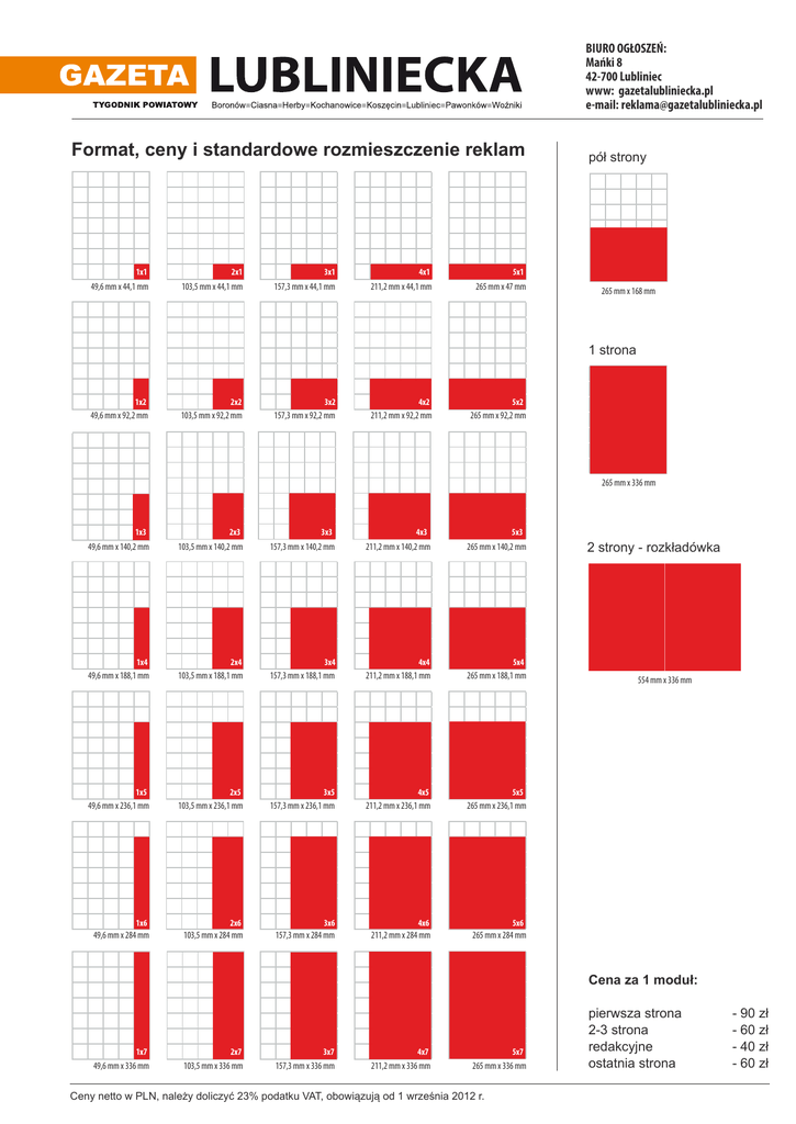 BIURO OGŁOSZEŃ: Mańki 8 42-700 Lubliniec www: gazetalubliniecka.pl e-mail: [email protected] Format, ceny i standardowe rozmieszczenie reklam 1x1 2x1 3x1 4x1 5x1 49,6 mm x 44,1 mm 103,5 mm x 44,1 mm 157,3 mm x 44,1 mm 211,2 mm x 44,1 mm 265 mm x 47 mm pół strony 265 mm x 168 mm 1 strona 1x2 2x2 3x2 4x2 5x2 49,6 mm x 92,2 mm 103,5 mm x 92,2 mm 157,3 mm x 92,2 mm 211,2 mm x 92,2 mm 265 mm x 92,2 mm 265 mm x 336 mm 1x3 49,6 mm x 140,2 mm 2x3 3x3 103,5 mm x 140,2 mm 157,3 mm x 140,2 mm 4x3 211,2 mm x 140,2 mm 5x3 265 mm x 140,2 mm 1x4 2x4 3x4 4x4 5x4 49,6 mm x 188,1 mm 103,5 mm x 188,1 mm 157,3 mm x 188,1 mm 211,2 mm x 188,1 mm 265 mm x 188,1 mm 1x5 2x5 3x5 4x5 49,6 mm x 236,1 mm 103,5 mm x 236,1 mm 157,3 mm x 236,1 mm 211,2 mm x 236,1 mm 2 strony - rozkładówka 554 mm x 336 mm 5x5 265 mm x 236,1 mm 1x6 2x6 3x6 4x6 5x6 49,6 mm x 284 mm 103,5 mm x 284 mm 157,3 mm x 284 mm 211,2 mm x 284 mm 265 mm x 284 mm Cena za 1 moduł: 1x7 2x7 3x7 4x7 49,6 mm x 336 mm 103,5 mm x 336 mm 157,3 mm x 336 mm 211,2 mm x 336 mm 5x7 265 mm x 336 mm Ceny netto w PLN, należy doliczyć 23% podatku VAT, obowiązują od 1 września 2012 r. pierwsza strona 2-3 strona redakcyjne ostatnia strona - 90 zł - 60 zł - 40 zł - 60 zł BIURO OGŁOSZEŃ: Mańki 8 42-700 Lubliniec www: gazetalubliniecka.pl e-mail: [email protected] 4 powody, dla których reklama w Gazecie Lublinieckiej" " to dobra inwestycja Cennik reklam modułowych pierwsza strona . . . . . . . . . . . 90 zł 2-3 strona . . . . . . . . . . . . . . . . 60 zł redakcyjne . . . . . . . . . . . . . . . 40 zł ostatnia strona . . . . . . . . . . . . 60 zł artykuł sponsorowany . . . . . . . 48 zł /moduł 1. Duża grupa docelowa „Gazeta Lubliniecka” to jedyny i największy tygodnik powiatowy, który ukazuje się w powiecie lublinieckim, liczącym 85 tys. mieszkańcow. Najświeższe informacje z terenu, ciekawe artykuły i fotoreportaże, największa baza ogłoszeń z powiatu, przygotowywane co tydzień przez wykwalifikowanych ludzi powodują, że każdego tygodnia czyta nas co czwarty mieszkaniec powiatu. Wśród nich może być także Twój klient. Ogłoszenia drobne słowo . . . . . . . . . . . . . . . . . . . . 0,62 zł mały moduł w ramce . . . . . . . 20 zł Podziękowania, nekrologi mały moduł . . . . . . . . . . . . . . . 50 zł duży moduł . . . . . . . . . . . . . . . 100 zł 2. Bezpośrednie dotarcie Żeby reklama była skuteczna, potencjalni klienci muszą ją zobaczyć. Dlatego każdy numer naszego tygodnika trafia do punktów sprzedaży w naszym powiecie, należących do największych sieci w Polsce – RUCHU i KOLPORTERA. Wychodząc naprzeciw oczekiwaniom naszym Czytelników, prowadzimy rownież dystrybucję własną w mniejszych miejscowościach oraz wszędzie tam, gdzie Ruch i Kolporter nie ma swoich saloników prasowych. Obecnie nasz tygodnik można kupić aż w 300 miejscach w powiecie. Można nas rownież czytać w większości lokalnych restauracjach i kawiarniach, gdzie znajdują się bezpłatne egzemplarze „Gazety Lublinieckiej”. gazetalublinecka.pl baner górny VIP . . . . . . . . . . . . . . 300 zł/tydzień 1 moduł ruchomy . . . . . . . . . . . . . 200 zł/tydzień 2 moduły ruchome . . . . . . . . . . . . 150 zł/tydzień Termin nadsyłania zleceń: najpóźniej 3 dni robocze przed datą emisji Termin nadsyłania materiałów: najpóźniej 2 dni robocze przed datą emisji Zasięg Tygodnika Wydanie papierowe: Boronów, Ciasna, Herby, Kochanowice, Koszęcin, Lubliniec, Pawonków, Woźniki i okolice 3. Mieszkaniec Lublińca, może też być Twoim klientem Ze względu na bliską, zaledwie kilkunastokilometrową odległość do sąsiadujących miast, między innymi Częstochowy, Czytelnicy „Gazety Lublinieckiej ” niejednokrotnie korzystają z usług i zakupów właśnie w tych miejscowościach. Warto zadbać, aby Twój produkt był im znany. Ciasna Cała prawda o Twoim Powiecie Herby Kochanowice Pawonków 4. Okno na świat „Reklama dźwignią handlu” – w osiągnięciu sukcesu pomoże Ci „Gazeta Lubliniecka”. Nasz doradca bezpłatnie dojeżdża do klienta, pomaga wybrać najlepsze miejsce w gazecie, dopasowuje rozmiar reklamy w zależności od potrzeb naszego reklamodawcy, a zespół grafików wykonuje dla każdego naszego klienta projekt reklamy gratis. Ceny netto w PLN, należy doliczyć 23% podatku VAT, obowiązują od 1 września 2012 r. Boronów Lubliniec Koszęcin Woźniki Wydanie internetowe: cały świat