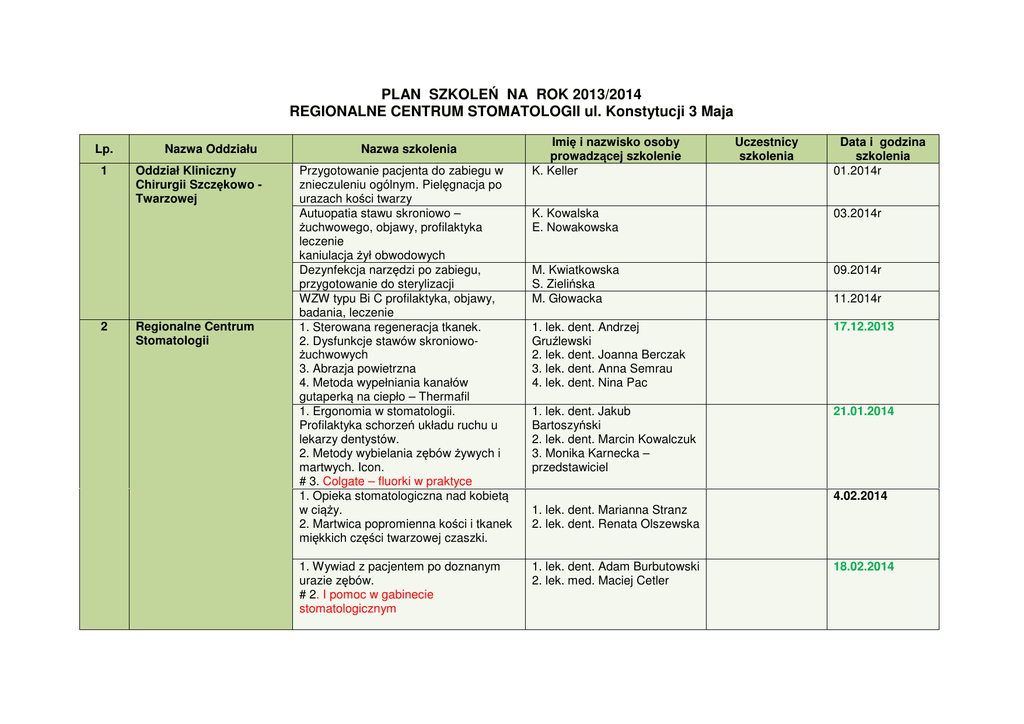 PLAN SZKOLEŃ NA ROK 2013/2014 REGIONALNE CENTRUM STOMATOLOGII ul. Konstytucji 3 Maja Lp. 1 2 Nazwa Oddziału Oddział Kliniczny Chirurgii Szczękowo Twarzowej Regionalne Centrum Stomatologii Nazwa szkolenia Przygotowanie pacjenta do zabiegu w znieczuleniu ogólnym. Pielęgnacja po urazach kości twarzy Autuopatia stawu skroniowo – żuchwowego, objawy, profilaktyka leczenie kaniulacja żył obwodowych Dezynfekcja narzędzi po zabiegu, przygotowanie do sterylizacji WZW typu Bi C profilaktyka, objawy, badania, leczenie 1. Sterowana regeneracja tkanek. 2. Dysfunkcje stawów skroniowożuchwowych 3. Abrazja powietrzna 4. Metoda wypełniania kanałów gutaperką na ciepło – Thermafil 1. Ergonomia w stomatologii. Profilaktyka schorzeń układu ruchu u lekarzy dentystów. 2. Metody wybielania zębów żywych i martwych. Icon. # 3. Colgate – fluorki w praktyce 1. Opieka stomatologiczna nad kobietą w ciąży. 2. Martwica popromienna kości i tkanek miękkich części twarzowej czaszki. 1. Wywiad z pacjentem po doznanym urazie zębów. # 2. I pomoc w gabinecie stomatologicznym Imię i nazwisko osoby prowadzącej szkolenie K. Keller Uczestnicy szkolenia Data i godzina szkolenia 01.2014r K. Kowalska E. Nowakowska 03.2014r M. Kwiatkowska S. Zielińska M. Głowacka 09.2014r 1. lek. dent. Andrzej Gruźlewski 2. lek. dent. Joanna Berczak 3. lek. dent. Anna Semrau 4. lek. dent. Nina Pac 17.12.2013 1. lek. dent. Jakub Bartoszyński 2. lek. dent. Marcin Kowalczuk 3. Monika Karnecka – przedstawiciel 21.01.2014 11.2014r 4.02.2014 1. lek. dent. Marianna Stranz 2. lek. dent. Renata Olszewska 1. lek. dent. Adam Burbutowski 2. lek. med. Maciej Cetler 18.02.2014 1. Postępowanie po urazach zębów mlecznych i stałych, apeksyfikacja, apeksogeneza 2. Zespół zmian endo-perio. 1. Wykwity pierwotne i wtórne w jamie ustnej z przykładami chorób. 2. Ameloblastoma. # 3. Blend-a-med. – Oral B – prezentacja firmy 1. Kość i materiały kościozastępcze – zastosowanie w periodontologii. 2. Zespół pieczenia jamy ustnej (MBS) 1. Nikotynizm – objawy i ryzyko z nim związane 2. Atraumatyczne ekstrakcje zębów. # 3. SAF – SYSTEM – prezentacja systemu 1. lek. dent. Marcin Kowalczuk 2. lek. dent. Magdalena Piwońska 4.03.2014 1. lek. dent. Kamil Jaczkowski 2. lek. dent. Katarzyna Gryń 3. Magdalena Jakubiak – przedstawiciel 18.03.2014 1.lek. dent. Krzysztof Pisuk 2. lek. dent. Magdalena Piwońska 1. lek. dent. Jacek Dworak 2. lek. dent. Adam Burbutowski 3. Maja Brodzińska – przedstawiciel 1.04.2014 1. Ozon w stomatologii. 2. Chemo-mechaniczne usuwanie próchnicy – Carisolv 1. lek. dent. Błażej Wysiecki 2. lek. dent. Nina Pac 6.05.2014 1. Sinuslift – wskazania, przeciwwskazania, metody. 2. Czujność onkologiczna w gabinecie stomatologicznym # 3. Nowe produkty firmy GABA International (Elmex) 1. Zakażenie HIV – zmiany na błonie śluzowej jamy ustnej w przebiegu infekcji oportunistycznych. 2. Preparaty do płukania kanałów w endodoncji i metody płukania. 1. Manifestacja chorób krwi w jamie ustnej. 2. Pacjent z cukrzycą w gabinecie stomatologicznym # 3. Novamin – przełomowa technologia zwalczania nadwrażliwości. 1. lek. dent. Jacek Dworak 2. lek. dent. Jakub Bartoszyński 3. Joanna Biczyk przedstawiciel 20.05.2014 1.lek. dent. Marianna Stranz 2. lek. dent. Krzysztof Pisuk 10.06.2014 1. lek. dent. Błażej Wysiecki 2. lek. dent. Anna Semrau 3. Kinga Skalska – przedstawiciel GlaxoSmithKline 24.06.2014 15.04.2014 2. Regionalne Centrum Stomatologii 1. Dysplazja włóknista 2. Powikłania po leczeniu endodontycznym. 3. Endokorony 1. Hipoplazja siekaczowo-trzonowcowa. 2. Pacjent stomatologiczny a leczenie przeciwkrzepliwe – aktualne poglądy 1. lek. dent. Katarzyna Gryń 2. lek. dent. Kamil Jaczkowski 3. lek. dent. Renata Olszewska 23.09.2014 1. lek. dent. Kinga Kowalik Maszewska 2. lek. stom. Justyna Piechocka 21.10.2014 1. Bruksizm – diagnostyka, leczenie. 2. Koferdam. 1. lek. dent. Marcin Gajkowski 2. lek. dent. Paulina Osińska 18.11.2014 1. …. (protetyka) 2. … (zachowawcza) 3. Usuwanie złamanych narzędzi kanałowych. 1. Specyfika pracy w gabinecie chirurgii stomatologicznej 2. Scaling 3. Jak odpoczywać żeby odpocząć Skuteczny relaks po pracy 4. Aspekty leczenia stomatologicznego dzieci specjalnej troski, pacjentów niepełnosprawnych 5. Komunikacja w gabinecie stomatologicznym 6. Higienistka a pierwsza wizyta dziecka w gabinecie stomatologicznym 7. Higiena jamy ustnej w leczeniu ortodontycznym 1. lek. dent. Joanna Berczak 2. lek. dent. Iwona Sokołowska 3. lek. dent. Paulina Osińska 16.12.2014 Luty 2014r Marzec 2014r Kwiecień 2014r Maj 2014r Wrzesień 2014r Październik 2014 Listopad 2014r