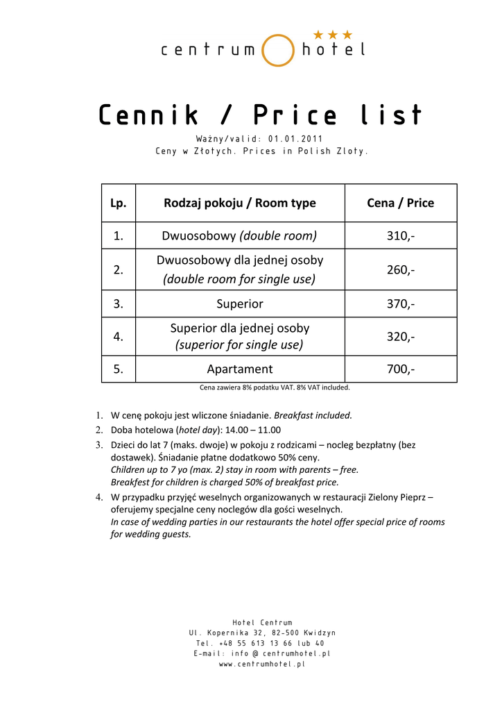 Cennik / Price list Ważny/valid: 01.01.2011 Ceny w Złotych. Prices in Polish Zloty. Lp. Rodzaj pokoju / Room type Cena / Price 1. Dwuosobowy (double room) 310,- 2. Dwuosobowy dla jednej osoby (double room for single use) 260,- 3. Superior 370,- 4. Superior dla jednej osoby (superior for single use) 320,- 5. Apartament 700,- Cena zawiera 8% podatku VAT. 8% VAT included. 1. W cenę pokoju jest wliczone śniadanie. Breakfast included. 2. Doba hotelowa (hotel day): 14.00 – 11.00 3. Dzieci do lat 7 (maks. dwoje) w pokoju z rodzicami – nocleg bezpłatny (bez dostawek). Śniadanie płatne dodatkowo 50% ceny. Children up to 7 yo (max. 2) stay in room with parents – free. Breakfest for children is charged 50% of breakfast price. 4. W przypadku przyjęć weselnych organizowanych w restauracji Zielony Pieprz – oferujemy specjalne ceny noclegów dla gości weselnych. In case of wedding parties in our restaurants the hotel offer special price of rooms for wedding guests. Hotel Centrum Ul. Kopernika 32, 82-500 Kwidzyn Tel. +48 55 613 13 66 lub 40 E-mail: info @ centrumhotel.pl www.centrumhotel.pl