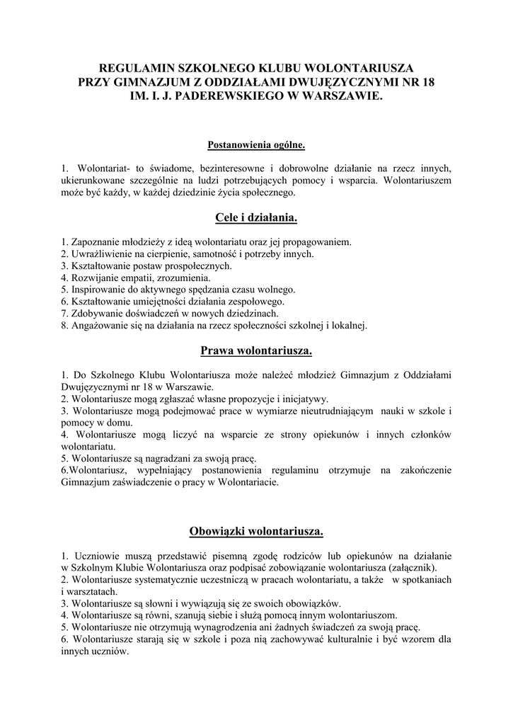 REGULAMIN SZKOLNEGO KLUBU WOLONTARIUSZA PRZY GIMNAZJUM Z ODDZIAŁAMI DWUJĘZYCZNYMI NR 18 IM. I. J. PADEREWSKIEGO W WARSZAWIE. Postanowienia ogólne. 1. Wolontariat- to świadome, bezinteresowne i dobrowolne działanie na rzecz innych, ukierunkowane szczególnie na ludzi potrzebujących pomocy i wsparcia. Wolontariuszem może być każdy, w każdej dziedzinie życia społecznego. Cele i działania. 1. Zapoznanie młodzieży z ideą wolontariatu oraz jej propagowaniem. 2. Uwrażliwienie na cierpienie, samotność i potrzeby innych. 3. Kształtowanie postaw prospołecznych. 4. Rozwijanie empatii, zrozumienia. 5. Inspirowanie do aktywnego spędzania czasu wolnego. 6. Kształtowanie umiejętności działania zespołowego. 7. Zdobywanie doświadczeń w nowych dziedzinach. 8. Angażowanie się na działania na rzecz społeczności szkolnej i lokalnej. Prawa wolontariusza. 1. Do Szkolnego Klubu Wolontariusza może należeć młodzież Gimnazjum z Oddziałami Dwujęzycznymi nr 18 w Warszawie. 2. Wolontariusze mogą zgłaszać własne propozycje i inicjatywy. 3. Wolontariusze mogą podejmować prace w wymiarze nieutrudniającym nauki w szkole i pomocy w domu. 4. Wolontariusze mogą liczyć na wsparcie ze strony opiekunów i innych członków wolontariatu. 5. Wolontariusze są nagradzani za swoją pracę. 6.Wolontariusz, wypełniający postanowienia regulaminu otrzymuje na zakończenie Gimnazjum zaświadczenie o pracy w Wolontariacie. Obowiązki wolontariusza. 1. Uczniowie muszą przedstawić pisemną zgodę rodziców lub opiekunów na działanie w Szkolnym Klubie Wolontariusza oraz podpisać zobowiązanie wolontariusza (załącznik). 2. Wolontariusze systematycznie uczestniczą w pracach wolontariatu, a także w spotkaniach i warsztatach. 3. Wolontariusze są słowni i wywiązują się ze swoich obowiązków. 4. Wolontariusze są równi, szanują siebie i służą pomocą innym wolontariuszom. 5. Wolontariusze nie otrzymują wynagrodzenia ani żadnych świadczeń za swoją pracę. 6. Wolontariusze starają się w szkole i poza nią zachowywać kulturalnie i być wzorem dla innych uczniów. 7. Wolontariusz może zostać skreślony z listy wolontariuszy za nieprzestrzeganie Regulaminu Szkolnego Klubu Wolontariusza. O skreśleniu z listy decydują opiekunowie Szkolnego Klubu Wolontariusza. 8. Wolontariusz zobowiązany jest do co najmniej dwu letniej pracy w Szkolnym Klubie Wolontariusza. Struktura i organizacja. 1. Opiekunem Szkolnego KlubuWolontariusza jest nauczyciel, który wyrazi chęć prowadzenia takiego Klubu. 2. Klub podzielone jest na grupy, którymi kierują liderzy wybrani spośród uczniów. 3. Liderzy są w stałym kontakcie z opiekunem i zgłaszają mu wszystkie problemy związane z wykonywaną pracą. 4. Spotkania wszystkich członków Klubu odbywają się raz w miesiącu w celu omówienia wykonanych działań, wymiany doświadczeń i planowania dalszej pracy. Obszary działania. 1. Szkolny Klub Wolontariuszy działa zasadniczo na dwu obszarach: w środowisku szkolnym i lokalnym. Nagradzanie wolontariuszy. 1. Członkowie Szkolnego Klubu Wolontariusza mogą być nagrodzeni poprzez: a) wyrażenie uznania słownego; b) pochwałę na forum szkoły; c) przyznanie punktów zgodnie z wewnątrzszkolnym systemem oceniania. 2. Nagradzanie wolontariuszy ma walor motywujący, podkreślający uznanie dla działalności wolontariusza. Zasady przyznawania punktów za pracę w wolontariacie. 1. Przyznawanie punktów odbywa się raz w semestrze, zgodnie z wewnątrzszkolnym systemem oceniania. 2. Punkty przyznają opiekunowie Szkolnego Klubu Wolontariusza. 3. Wolontariusz może uzyskać punkty dodatnie i ujemne. 4. Punkty dodatnie przyznawane są za aktywną pracę w wolontariacie (uczestniczenie w spotkaniach organizacyjnych, akcjach, zbiórkach, wyjściach itp.). Ich maksymalna liczba to +20 punktów. 5. Punkty ujemne przyznawane są za niewywiązywanie się z powierzonych obowiązków. Ich maksymalna liczba to -5 punktów. Załącznik do Regulaminu Szkolnego Koła Wolontariusza Zobowiązanie wolontariusza. Przystępując do Szkolnego Klubu Wolontariusza oświadczam, że znam i akceptuję jego cele oraz zasady pracy. Zobowiązuję się do przestrzegania Regulaminu Szkolnego Klubu Wolontariusza oraz sumiennego i bezinteresownego wykonywania powierzonych mi zadań. Warszawa……………. ..……………………….. (podpis wolontariusza) ………………………….. (podpis rodzica/ opiekuna)