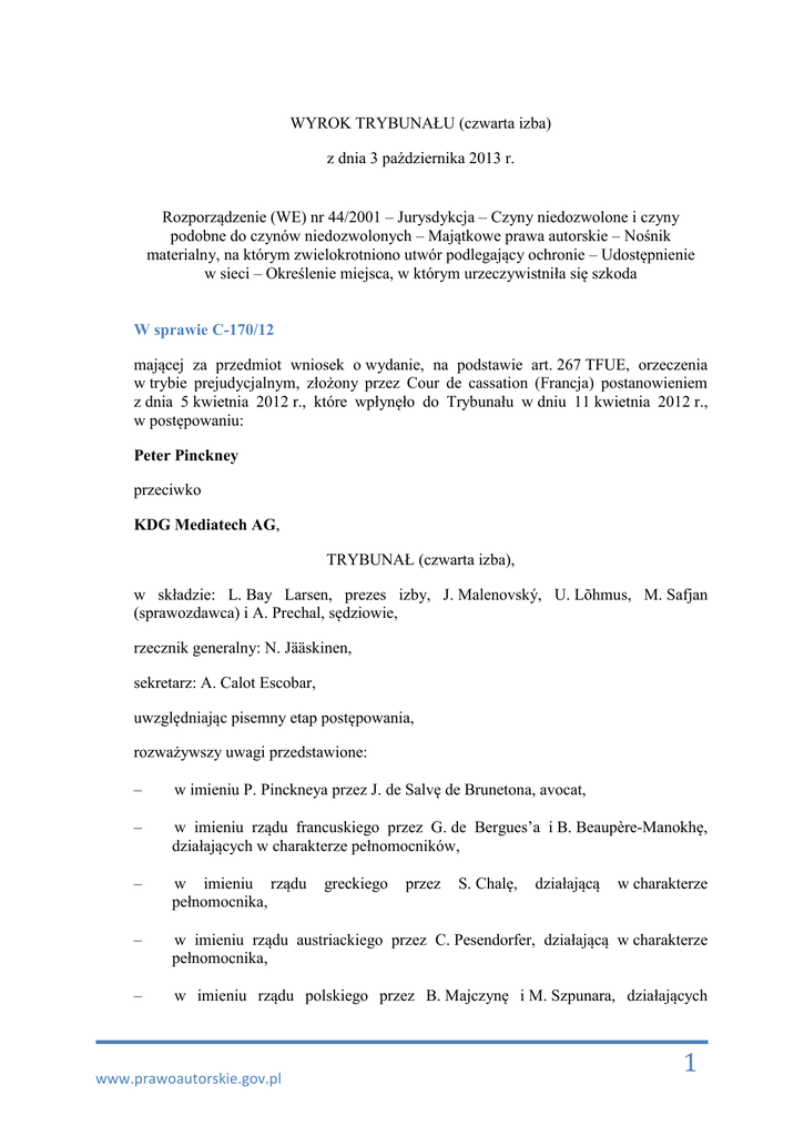 WYROK TRYBUNAŁU (czwarta izba) z dnia 3 października 2013 r. Rozporządzenie (WE) nr 44/2001 – Jurysdykcja – Czyny niedozwolone i czyny podobne do czynów niedozwolonych – Majątkowe prawa autorskie – Nośnik materialny, na którym zwielokrotniono utwór podlegający ochronie – Udostępnienie w sieci – Określenie miejsca, w którym urzeczywistniła się szkoda W sprawie C-170/12 mającej za przedmiot wniosek o wydanie, na podstawie art. 267 TFUE, orzeczenia w trybie prejudycjalnym, złożony przez Cour de cassation (Francja) postanowieniem z dnia 5 kwietnia 2012 r., które wpłynęło do Trybunału w dniu 11 kwietnia 2012 r., w postępowaniu: Peter Pinckney przeciwko KDG Mediatech AG, TRYBUNAŁ (czwarta izba), w składzie: L. Bay Larsen, prezes izby, J. Malenovský, U. Lõhmus, M. Safjan (sprawozdawca) i A. Prechal, sędziowie, rzecznik generalny: N. Jääskinen, sekretarz: A. Calot Escobar, uwzględniając pisemny etap postępowania, rozważywszy uwagi przedstawione: – w imieniu P. Pinckneya przez J. de Salvę de Brunetona, avocat, – w imieniu rządu francuskiego przez G. de Bergues’a i B. Beaupère-Manokhę, działających w charakterze pełnomocników, – w imieniu rządu pełnomocnika, – w imieniu rządu austriackiego przez C. Pesendorfer, działającą w charakterze pełnomocnika, – w imieniu rządu polskiego przez B. Majczynę i M. Szpunara, działających www.prawoautorskie.gov.pl greckiego przez S. Chalę, działającą w charakterze 1 w charakterze pełnomocników, – w imieniu Komisji Europejskiej w charakterze pełnomocnika, przez A.M. Rouchaud-Joët, działającą po zapoznaniu się z opinią rzecznika generalnego na posiedzeniu w dniu 13 czerwca 2013 r., wydaje następujący Wyrok 1 Wniosek o wydanie orzeczenia w trybie prejudycjalnym dotyczy wykładni art. 5 pkt 3 rozporządzenia Rady (WE) nr 44/2001 z dnia 22 grudnia 2000 r. w sprawie jurysdykcji i uznawania orzeczeń sądowych oraz ich wykonywania w sprawach cywilnych i handlowych (Dz.U. L 12, s. 1, zwanego dalej „rozporządzeniem”). 2 Wniosek ten został złożony w ramach sporu między P. Pinckneyem, zamieszkałym we Francji, a KDG Mediatech AG (zwaną dalej „spółką Mediatech”), spółką z siedzibą w Austrii, w przedmiocie żądania odszkodowania z tytułu naruszenia majątkowych praw autorskich P. Pinckneya, jakiego miała się dopuścić wspomniana spółka. Ramy prawne Rozporządzenie 3 Motywy 2, 11, 12 i 15 rozporządzenia stwierdzają: „(2) Różnice pomiędzy przepisami poszczególnych państw o jurysdykcji i uznawaniu orzeczeń utrudniają należyte funkcjonowanie rynku wewnętrznego. Dlatego nieodzownym jest wydanie przepisów celem ujednolicenia przepisów o jurysdykcji w sprawach cywilnych i handlowych oraz uproszczenia formalności ze względu na szybkie i nieskomplikowane uznawanie i wykonywanie orzeczeń z państw członkowskich związanych niniejszym rozporządzeniem. […] (11) Przepisy o jurysdykcji powinny być w wysokim stopniu przewidywalne i powinny zależeć zasadniczo od miejsca zamieszkania pozwanego, a tak ustalona jurysdykcja powinna mieć miejsce zawsze, z wyjątkiem kilku dokładnie określonych przypadków, w których ze względu na przedmiot sporu lub umowę stron uzasadnione jest inne kryterium powiązania. Siedziba osób prawnych musi być zdefiniowana wprost w rozporządzeniu celem wzmocnienia przejrzystości wspólnych przepisów i uniknięcia konfliktów kompetencyjnych. (12) Jurysdykcja oparta na łączniku miejsca zamieszkania powinna zostać uzupełniona jurysdykcją opartą na innych łącznikach, które powinny zostać dopuszczone ze względu na ścisły związek pomiędzy sądem a sporem prawnym www.prawoautorskie.gov.pl 2 lub w interesie prawidłowego wymiaru sprawiedliwości. […] (15) W interesie zgodnego [jednolitości] wymiaru sprawiedliwości należy unikać tak dalece, jak jest to tylko możliwe, równoległych postępowań, aby w dwóch państwach członkowskich nie zapadały niezgodne ze sobą orzeczenia […]”. 4 Przepisy o jurysdykcji ujęte są w rozdziale II rozporządzenia, który obejmuje art. 2–31. 5 Artykuł 2 rozporządzenia, który wchodzi w skład sekcji 1 rozdziału II, zatytułowanej „Przepisy ogólne”, ma następujące brzmienie: „Z zastrzeżeniem przepisów niniejszego rozporządzenia osoby mające miejsce zamieszkania na terytorium państwa członkowskiego mogą być pozywane, niezależnie od ich obywatelstwa, przed sądy tego państwa członkowskiego”. 6 Artykuł 3 rozporządzenia, zawarty w tej samej sekcji, stanowi w ust. 1: „Osoby mające miejsce zamieszkania na terytorium państwa członkowskiego mogą być pozywane przed sądy innego państwa członkowskiego tylko zgodnie z przepisami sekcji 2–7 niniejszego rozdziału”. 7 W sekcji 2 rozdziału II rozporządzenia, zatytułowanej „Jurysdykcja szczególna”, znajduje się między innymi jego art. 5. Artykuł ten w pkt 3 przewiduje, że: „Osoba, która ma miejsce zamieszkania na terytorium państwa członkowskiego, może być pozwana w innym państwie członkowskim: […] 3) jeżeli przedmiotem postępowania jest czyn niedozwolony lub czyn podobny do czynu niedozwolonego albo roszczenia wynikające z takiego czynu – przed sąd miejsca, gdzie nastąpiło lub może nastąpić zdarzenie wywołujące szkodę”. Dyrektywa 2001/29/WE 8 Dyrektywa 2001/29/WE Parlamentu Europejskiego i Rady z dnia 22 maja 2001 r. w sprawie harmonizacji niektórych aspektów praw autorskich i pokrewnych w społeczeństwie informacyjnym (Dz.U. L 167, s. 10) zawiera rozdział II, zatytułowany „Prawa i wyjątki”, w którym mieszczą się między innymi art. 2–4, dotyczące, odpowiednio, prawa do publicznego udostępniania utworów i prawa podawania do publicznej wiadomości innych przedmiotów objętych ochroną oraz prawa do rozpowszechniania. Postępowanie główne i pytania prejudycjalne 9 Peter Pinckney, zamieszkały w Tuluzie (Francja), twierdzi, że jes