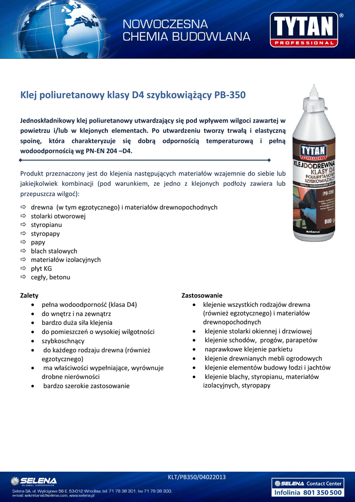 Klej poliuretanowy klasy D4 szybkowiążący PB-350 Jednoskładnikowy klej poliuretanowy utwardzający się pod wpływem wilgoci zawartej w powietrzu i/lub w klejonych elementach. Po utwardzeniu tworzy trwałą i elastyczną spoinę, która charakteryzuje się dobrą odpornością temperaturową i pełną wodoodpornością wg PN-EN 204 –D4. Produkt przeznaczony jest do klejenia następujących materiałów wzajemnie do siebie lub jakiejkolwiek kombinacji (pod warunkiem, ze jedno z klejonych podłoży zawiera lub przepuszcza wilgoć): drewna (w tym egzotycznego) i materiałów drewnopochodnych stolarki otworowej styropianu styropapy papy blach stalowych materiałów izolacyjnych płyt KG cegły, betonu Zalety pełna wodoodporność (klasa D4) do wnętrz i na zewnątrz bardzo duża siła klejenia do pomieszczeń o wysokiej wilgotności szybkoschnący do każdego rodzaju drewna (również egzotycznego) ma właściwości wypełniające, wyrównuje drobne nierówności bardzo szerokie zastosowanie Zastosowanie klejenie wszystkich rodzajów drewna (również egzotycznego) i materiałów drewnopochodnych klejenie stolarki okiennej i drzwiowej klejenie schodów, progów, parapetów naprawkowe klejenie parkietu klejenie drewnianych mebli ogrodowych klejenie elementów budowy łodzi i jachtów klejenie blachy, styropianu, materiałów izolacyjnych, styropapy KLT/PB350/04022013 DANE TECHNICZNE Kolor Czas pracy Czas docisku Zalecana siła docisku Czas osiągnięcia pełnej wytrzymałości spoiny Temperatura pracy Odporność termiczna po utwardzeniu wydajność brązowy 5-10 min 50-60 min (+20OC) ; elementy gięte min 70 min >0,6 MPa ok. 72 godz. od +5°C do +30°C od -40°C do +100°C 0,12 – 0,25 kg/m2 SPOSÓB UŻYCIA klejone powierzchnie wyrównać, dokładnie oczyścić i odtłuścić cienką warstwę kleju nanieść na obie klejone powierzchnie klejone elementy natychmiast docisnąć rozkładając równomiernie siłę nacisku na cały klejony materiał. Narzędzia i wszystkie zabrudzenia czyścić natychmiast po zakończeniu pracy (przed utwardzeniem kleju) – utwardzony klej można usuwać tylko mechanicznie. PRZECHOWYWANIE I OPAKOWANIE Klej można przechowywać w oryginalnie zamkniętych opakowaniach w temperaturze od +5oC do +20oC, w suchych, dobrze wentylowanych pomieszczeniach, przez okres 12 miesięcy od daty produkcji. Indeks KLT-DR-D4-PU-080 KLT-DR-D4-PU-500 Pojemność (kg) 0,8 5 Opakowanie Butelka wiadro Kod kreskowy 5903518059148 5903518059155 Ilość sztuk w kartonie 6 - Ostrzeżenia i zalecenia BHP Należy przestrzegać zwykłych zasad higieny pracy. PRZED ZASTOSOWANIEM NALEŻY ZAPOZNAĆ SIĘ Z KARTĄ BEZPIECZEŃSTWA PRODUKTU LUB PRZECZYTAĆ ETYKIETĘ NA OPAKOWANIU. Data sporządzenia 04.02.2013 Powyższe dane, zalecenia i wskazówki opierają się na naszej najlepszej wiedzy, badaniach oraz doświadczeniach i zostały udzielone w dobrej wierze, zgodnie z zasadami obowiązującymi w naszej firmie i u naszych dostawców. Zaproponowane sposoby postępowania uznane są za powszechne, jednak każdy z użytkowników tego materiału powinien upewnić się na wszelkie możliwe sposoby, włącznie ze sprawdzeniem produktu końcowego w odpowiednich warunkach, o przydatności dostarczanych materiałów dla osiągnięcia celów przez niego zamierzonych. Ani Spółka, ani jej upoważnieni przedstawiciele nie mogą ponosić odpowiedzialności za jakiekolwiek straty poniesione na skutek nieprawidłowego, bądź błędnego użycia jej materiałów. KLT/PB350/04022013