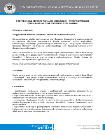 PODYPLOMOWE STUDIUM TŁUMACZY LITERACKICH i AUDIOWIZUALNYCH JĘZYK ANGIELSKI, JĘZYK NIEMIECKI, JĘZYK ROSYJSKI Informacja o studiach: Podyplomowe Studium Tłumaczy Literackich i Audiowizualnych Dwusemestralne studia podyplomowe dla tłumaczy literackich i audiowizualnych przygotowują słuchaczy posiadających biegłą znajomość języka angielskiego, niemieckiego, rosyjskiego (przynajmniej na poziomie B2/C1) do pracy w charakterze tłumacza literatury lub tłumacza audiowizualnego oraz doskonalą warsztat pracy tłumaczy początkujących. Studia adresowane są do osób zainteresowanych podnoszeniem swoich kwalifikacji zawodowych, które pragną zdobyć umiejętności i wiedzę z zakresu przekładu tekstów literackich i kulturowych oraz przekładu audiowizualnego. Studia kończą się wewnętrznym egzaminem dyplomowym. Studia trwają dwa semestry i obejmują łącznie 220 godzin dydaktycznych. Słuchacze: Studia adresowane są do osób zainteresowanych podnoszeniem swoich kwalifikacji zawodowych, które pragną zdobyć umiejętności i wiedzę z zakresu przekładu tekstów literackich i kulturowych oraz przekładu audiowizualnego. Cel studiów: • przekazanie słuchaczom wiedzy i praktycznych umiejętności niezbędnych do wykonywania zawodu tłumacza literackiego i audiowizualnego, • zapoznanie słuchaczy z metodyką i warsztatem pracy tłumacza tekstów literackich i kulturowych oraz tłumacza audiowizualnego, • przekazanie słuchaczom wiedzy z zakresu literaturoznawstwa i kulturoznawstwa, analizy krytycznej i interpretacji utworów literackich, tekstów kulturowych oraz redakcji tekstu, • zapoznanie słuchaczy z praktycznymi sposobami tłumaczenia tekstów literackich i kulturowych, warsztatem pracy tłumacza audiowizualnego oraz wyrobienie u słuchaczy właściwych nawyków tłumaczeniowych. Ramowy program studiów: Program Podyplomowego Studium Tłumaczy Literackich i Audiowizualnych spełnia wymagania Ministerstwa Nauki i Szkolnictwa Wyższego, obejmuje wiedzę ogólną z zakresu literatury, literaturoznawstwa, kulturoznawstwa, krytycznej analizy i interpretacji tekstów, etc. oraz praktyczne umiejętności językowe niezbędne do wykonywania zawodu tłumacza literackiego i audiowizualnego. Program studiów obejmuje: 1. Teorię i pragmatykę przekładu tekstów literackich i kulturowych 2. Krytyczną analizę i interpretację tekstu 3. Podstawy literaturoznawstwa i kulturoznawstwa 4. Metodologię przekładu literatury oraz przekładu audiowizualnego 5. Stylistykę języka polskiego 6. Podstawy edytorstwa dla tłumaczy Metody prowadzenia zajęć • Wykłady • Konwersatoria • Ćwiczenia • Warsztaty przekładowe: o tłumaczenie pisemne w tym praktyczna nauka przekładu tekstów literackich i kulturowych o analiza krytyczna i interpretacja tekstu oraz podstawy edytorstwa o tłumaczenie audiowizualne: redagowanie napisów, przygotowanie list dialogowych, audiodeskrypcja Atuty Podyplomowego Studium Tłumaczy Literackich i Audiowizualnych w Lingwistycznej Szkole Wyższej w Warszawie: • wysoki poziom jakości kształcenia, • wysoko wykwalifikowana kadra naukowo-dydaktyczna, • tłumacze-specjaliści z wieloletnim doświadczeniem w zawodzie, • właściwie dobrane materiały dydaktyczne dla Słuchaczy, • indywidualne podejście do każdego Słuchacza, • możliwość podnoszenia i zdobycia nowych kwalifikacji zawodowych, • baza dydaktyczna i biblioteczna, • lokalizacja w centrum Warszawy (dogodny dojazd). Wymagania ogólne wobec Kandydatów: Kandydat musi spełnić następujące wymagania: • bardzo dobra znajomość języka obcego (B2/C1) • płynna znajomość języka polskiego • doświadczenie w tłumaczeniu tekstów • pozytywny wynik postępowania rekrutacyjnego (rozmowa kwalifikacyjna) Aby uzyskać świadectwo ukończenia Podyplomowego Studium Tłumaczy Literackich i Audiowizualnych należy: • uzyskać pozytywną średnią ocen z prac zaliczeniowych na zajęciach praktycznych, • przygotować pracę dyplomową i zdać egzamin końcowy z wynikiem pozytywnym z zakresu wiedzy dotyczącej przekładu i literatury (w tym podstawy literaturoznawstwa, kulturoznawstwa), analizy krytycznej i interpretacji tekstów oraz praktycznych umiejętności tłumaczenia i redakcji tekstu. Rekrutacja na studia – wymagane dokumenty: Rekrutacja odbywa się na podstawie rozmowy kwalifikacyjnej. Kandydaci na studia podyplomowe składają następujące dokumenty: • podanie kandydata o przyjęcie na studia • odpis dyplomu ukończenia studiów wyższych ( w tym inżynierskich lub licencjackich), • 2 aktualne fotografie o wymiarach 37x50 mm, bez nakrycia głowy na jasnym tle, podpisane imieniem i nazwiskiem, • kserokopię dowodu osobistego lub innego dowodu potwierdzającego tożsamość kandydata, • kserokopię dowodu wniesienia opłaty rekrutacyjnej w wysokości 200 zł. Dokumenty należy składać w Sekretariacie Lingwistycznej Szkoły Wyższej: ul. Żelazna 87 (róg Ogrodowej i Żelaznej) 00-879 Warszawa Opłaty: Zapisując się na studia podyplomowe kandydaci wnoszą opłaty: • 200zł tytułem dopuszczenia do egzaminu wstępnego i rozmowy kwalifikacyjnej • Opłata semestralna: 2650zł lub Opłata ratalna za semestr: 850zł + 490zł płatne w 4 kolejnych ratach Kontakt: Studia Podyplomowe: mgr Ewa Łuczyńska-Gut Tel.: Tel. 506 664 469 lub 22 886 50 12 (wew. 104) Kierownik Studiów Podyplomowych: mgr Alicja Fandrejewska Email: [email protected]