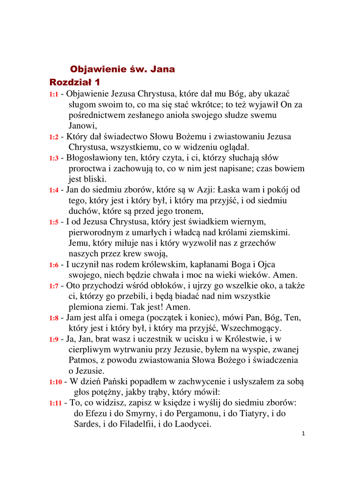 Objawienie św. Jana Rozdział 1 1:1 - Objawienie Jezusa Chrystusa, które dał mu Bóg, aby ukazać sługom swoim to, co ma się stać wkrótce; to też wyjawił On za pośrednictwem zesłanego anioła swojego słudze swemu Janowi, 1:2 - Który dał świadectwo Słowu Bożemu i zwiastowaniu Jezusa Chrystusa, wszystkiemu, co w widzeniu oglądał. 1:3 - Błogosławiony ten, który czyta, i ci, którzy słuchają słów proroctwa i zachowują to, co w nim jest napisane; czas bowiem jest bliski. 1:4 - Jan do siedmiu zborów, które są w Azji: Łaska wam i pokój od tego, który jest i który był, i który ma przyjść, i od siedmiu duchów, które są przed jego tronem, 1:5 - I od Jezusa Chrystusa, który jest świadkiem wiernym, pierworodnym z umarłych i władcą nad królami ziemskimi. Jemu, który miłuje nas i który wyzwolił nas z grzechów naszych przez krew swoją, 1:6 - I uczynił nas rodem królewskim, kapłanami Boga i Ojca swojego, niech będzie chwała i moc na wieki wieków. Amen. 1:7 - Oto przychodzi wśród obłoków, i ujrzy go wszelkie oko, a także ci, którzy go przebili, i będą biadać nad nim wszystkie plemiona ziemi. Tak jest! Amen. 1:8 - Jam jest alfa i omega (początek i koniec), mówi Pan, Bóg, Ten, który jest i który był, i który ma przyjść, Wszechmogący. 1:9 - Ja, Jan, brat wasz i uczestnik w ucisku i w Królestwie, i w cierpliwym wytrwaniu przy Jezusie, byłem na wyspie, zwanej Patmos, z powodu zwiastowania Słowa Bożego i świadczenia o Jezusie. 1:10 - W dzień Pański popadłem w zachwycenie i usłyszałem za sobą głos potężny, jakby trąby, który mówił: 1:11 - To, co widzisz, zapisz w księdze i wyślij do siedmiu zborów: do Efezu i do Smyrny, i do Pergamonu, i do Tiatyry, i do Sardes, i do Filadelfii, i do Laodycei. 1 - I obróciłem się, aby zobaczyć, co to za głos, który mówił do mnie; a gdy się obróciłem, ujrzałem siedem złotych świeczników, 1:13 - A pośród tych świeczników kogoś podobnego do Syna Człowieczego, odzianego w szatę do stóp długą i przepasanego przez pierś złotym pasem; 1:14 - Głowa zaś jego i włosy były lśniące jak śnieżnobiała wełna, a oczy jego jak płomień ognisty, 1:15 - A nogi jego podobne do mosiądzu w piecu rozżarzonego, głos zaś jego jakby szum wielu wód. 1:16 - W prawej dłoni swej trzymał siedem gwiazd, a z ust jego wychodził obosieczny ostry miecz, a oblicze jego jaśniało jak słońce w pełnym swoim blasku. 1:17 - Toteż gdy go ujrzałem, padłem do nóg jego jakby umarły. On zaś położył na mnie swoją prawicę i rzekł: Nie lękaj się, Jam jest pierwszy i ostatni, 1:18 - I żyjący. Byłem umarły, lecz oto żyję na wieki wieków i mam klucze śmierci i piekła. 1:19 - Napisz więc, co widziałeś i co jest, i co się stanie potem. 1:20 - Co do tajemnicy siedmiu gwiazd, które widziałeś w prawej dłoni mojej, i siedmiu złotych świeczników: siedem gwiazd, to aniołowie siedmiu zborów, a siedem świeczników, to siedem zborów. 1:12 Rozdział 2 2:1 - Do anioła zboru w Efezie napisz: To mówi Ten, który trzyma siedem gwiazd w prawicy swojej, który się przechadza pośród siedmiu złotych świeczników: 2:2 - Znam uczynki twoje i trud, i wytrwałość twoją, i wiem, że nie możesz ścierpieć złych, i że doświadczyłeś tych, którzy podają się za apostołów, a nimi nie są, i stwierdziłeś, że są kłamcami. 2:3 - Masz też wytrwałość i cierpiałeś dla imienia mego, a nie ustałeś. 2:4 - Lecz mam ci za złe, że porzuciłeś pierwszą twoją miłość. 2 - Wspomnij więc, z jakiej wyżyny spadłeś i upamiętaj się, i spełniaj uczynki takie, jak pierwej; a jeżeli nie, to przyjdę do ciebie i ruszę świecznik twój z jego miejsca, jeśli się nie upamiętasz. 2:6 - Na swoją obronę masz to, że nienawidzisz uczynków nikolaitów, których i ja nienawidzę. 2:7 - Kto ma uszy, niechaj słucha, co Duch mówi do zborów. Zwycięzcy dam spożywać z drzewa żywota, które jest w raju Bożym. 2:8 - A do anioła zboru w Smyrnie napisz: To mówi pierwszy i ostatni, który był umarły, a ożył; 2:9 - Znam ucisk twój i ubóstwo, lecz tyś bogaty, i wiem, że bluźnią tobie ci, którzy podają się za Żydów, a nimi nie są, ale są synagogą szatana. 2:10 - Nie lękaj się cierpień, które mają przyjść na cię. Oto diabeł wtrąci niektórych z was do więzienia, abyście byli poddani próbie, i będziecie w udręce przez dziesięć dni. Bądź wierny aż do śmierci, a dam ci koronę żywota. 2:11 - Kto ma uszy, niechaj słucha, co Duch mówi do zborów. Zwycięzca nie dozna szkody od drugiej śmierci. 2:12 - A do anioła zboru w Pergamie napisz: To mówi Ten, który ma ostry miecz obosieczny. 2:13 - Wiem, gdzie mieszkasz, tam, gdzie jest tron szatana; a jednak trzymasz się mocno mego imienia i nie zaparłeś się wiary we mnie, nawet w dniach, kiedy Antypas, świadek mój wierny, został zabity u was, gdzie szatan ma swoje mieszkanie. 2:14 - Lecz mam ci nieco za złe, mianowicie, że są tam tacy, którzy trzymają się nauki Balaama, który nauczał Balaka, jak uwodzić synów izraelskich, by spożywali rzeczy bałwanom ofiarowane i uprawiali nierząd. 2:15 - Tak i ty masz u siebie takich, którzy również trzymają się nauki nikolaitów. 2:16 - Upamiętaj się więc; a jeżeli nie, przyjdę do ciebie wkrótce i będę z nimi walczył mieczem ust moich. 2:5 3 - Kto ma uszy, niechaj słucha, co Duch mówi do zborów. Zwycięzcy dam nieco z manny ukrytej i kamyk dam mu biały, a na kamyku tym wypisane nowe imię, którego nikt nie zna, jak tylko ten, który je otrzymuje. 2:18 - A do anioła zboru w Tiatyrze napisz: To mówi Syn Boży, który ma oczy jak płomień ognia, a nogi jego podobne są do mosiądzu. 2:19 - Znam uczynki twoje i miłość, i wiarę, i służbę, i wytrwałość twoją, i wiem, że ostatnich uczynków twoich jest więcej niż pierwszych. 2:20 - Lecz mam ci za złe, że pozwalasz niewieście Izebel, która 