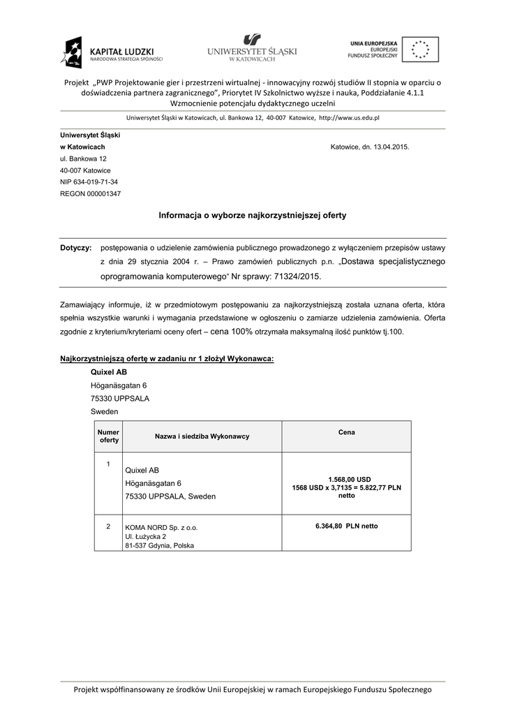 Projekt „PWP Projektowanie gier i przestrzeni wirtualnej - innowacyjny rozwój studiów II stopnia w oparciu o doświadczenia partnera zagranicznego”, Priorytet IV Szkolnictwo wyższe i nauka, Poddziałanie 4.1.1 Wzmocnienie potencjału dydaktycznego uczelni Uniwersytet Śląski w Katowicach, ul. Bankowa 12, 40-007 Katowice, http://www.us.edu.pl Uniwersytet Śląski w Katowicach Katowice, dn. 13.04.2015. ul. Bankowa 12 40-007 Katowice NIP 634-019-71-34 REGON 000001347 Informacja o wyborze najkorzystniejszej oferty Dotyczy: postępowania o udzielenie zamówienia publicznego prowadzonego z wyłączeniem przepisów ustawy z dnia 29 stycznia 2004 r. – Prawo zamówień publicznych p.n. „Dostawa specjalistycznego oprogramowania komputerowego” Nr sprawy: 71324/2015. Zamawiający informuje, iż w przedmiotowym postępowaniu za najkorzystniejszą została uznana oferta, która spełnia wszystkie warunki i wymagania przedstawione w ogłoszeniu o zamiarze udzielenia zamówienia. Oferta zgodnie z kryterium/kryteriami oceny ofert – cena 100% otrzymała maksymalną ilość punktów tj.100. Najkorzystniejszą ofertę w zadaniu nr 1 złożył Wykonawca: Quixel AB Höganäsgatan 6 75330 UPPSALA Sweden Numer oferty 1 Nazwa i siedziba Wykonawcy Quixel AB Höganäsgatan 6 75330 UPPSALA, Sweden 2 Cena KOMA NORD Sp. z o.o. Ul. Łużycka 2 81-537 Gdynia, Polska 1.568,00 USD 1568 USD x 3,7135 = 5.822,77 PLN netto 6.364,80 PLN netto Projekt współfinansowany ze środków Unii Europejskiej w ramach Europejskiego Funduszu Społecznego Projekt „PWP Projektowanie gier i przestrzeni wirtualnej - innowacyjny rozwój studiów II stopnia w oparciu o doświadczenia partnera zagranicznego”, Priorytet IV Szkolnictwo wyższe i nauka, Poddziałanie 4.1.1 Wzmocnienie potencjału dydaktycznego uczelni Uniwersytet Śląski w Katowicach, ul. Bankowa 12, 40-007 Katowice, http://www.us.edu.pl Najkorzystniejszą ofertę w zadaniu nr 2 złożył Wykonawca: The Foundry 5 Golden Square W1F 9HT London, Great Britain Numer oferty 1 Nazwa i siedziba Wykonawcy The Foundry 5 Golden Square W1F 9HT London, Great Britain 2 Cena 7.089,00 EUR 7089 EUR x 4,0340 = 28.597,03 PLN netto 30.702,00 PLN netto KOMA NORD Sp. z o.o. Ul. Łużycka 2 81-537 Gdynia, Polska Najkorzystniejszą ofertę w zadaniu nr 3 złożył Wykonawca: Allegorithmic 31 Rue Gonod 63000 Clermont-Ferrand France Numer oferty 1 Nazwa i siedziba Wykonawcy Allegorithmic 31 Rue Gonod 63000 Clermont-Ferrand, France 2 Cena KOMA NORD Sp. z o.o. Ul. Łużycka 2 81-537 Gdynia, Polska 3.044,70 USD 3044,70 USD x 3,7135 = 11.306,49 PLN netto 68.258,40 PLN netto Z Wykonawcą, którego oferta została uznana za najkorzystniejszą, Zamawiający zawrze umowę lub zamówienie w formie pisemnej, na zasadach określonych w ogłoszeniu o zamiarze udzielenia zamówienia oraz w załącznikach do tego ogłoszenia (w szczególności na zasadach określonych we wzorze umowy, jeżeli został zamieszczony). Zamawiający skontaktuje się z Wykonawcą w celu ustalenia szczegółowych warunków i terminu zawarcia umowy lub zamówienia w przedmiotowym postępowaniu. Sprawę prowadzi: Katarzyna Giel-Cieślińska Projekt współfinansowany ze środków Unii Europejskiej w ramach Europejskiego Funduszu Społecznego