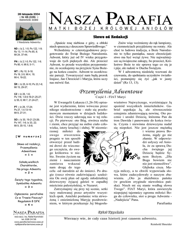 28 listopada 2004 :: Nr 48 (328) :: ISSNI506 3089 Słowo od Redakcji I Niedziela Adwentu ND :: Iz 2, 1-5; Ps 122, 1-9; Rz 13, 11-14; Ps 85, 8; Mt 24, 37-44; PN :: Iz 2,1-5; Ps 122, 1-9; Ps 80, 4; Mt 8, 5-11; WT :: Rz 10, 9-18; Ps 19, 2-5; Mt 4, 19; Mt 4, 18-22; ŚR :: Iz 25, 6-10; Ps 23,1-6; Mt 15, 29-37; CZ :: Iz 26, 1-6; Ps 118, 1.8-9.19-21.25-27; Iz 55, 6; Mt 7, 21.24-27; PT :: Iz 29, 17-24; Ps 27, 1.4.13-14; Mt 9, 27-31; SO :: Iz 30, 19-21.23-26; Ps 147, 1-6; Iz 33, 22; Mt 9, 35-10, 1.6-8; [W numerze] Słowo od redakcji, Przemyślenia Adwentowe » 1 « Szkołą wielkich Charakterów, Na progu Adwentu » 2 « Święty tego tygodnia, Symbolika Adwentu » 3 « Ogłoszenia parafialne Co w Trawie Piszczy? Regulamin 8 DFK » 4 « „Spuście rosę niebiosa z góry, a obłoki niech spuszczą z deszczem Sprawiedliwego.” Wchodzimy w czterotygodniowe przygotowanie do Świąt Bożego Narodzenia. Adwent, który już od IV wieku przygotowuje do tych pięknych dni. Ale przecież Adwent, to przede wszystkim przypomnienie, że oczekujemy na przyjście Syna Bożego na końcu czasów. Adwent to oczekiwanie paruzji. Towarzyszyć nam będą prorok Izajasz, Jan Chrzciciel i Maryja, która uczy nas mówić fiat. Znów więc weźmiemy do rąk lampiony, w ciemnościach przyjdziemy na roraty. Ale choć to ludowa tradycja, a Boże Narodzenie to tylko pamiątka, nasze chrześcijaństwo ma być wciąż żywe. Nie najważniejsze są świąteczne zakupy, bo przecież, Królestwo Boże to nie sprawa tego co się je i pije, ale radość w Duchu Świętym. W I adwentową niedzielę wezwani do czuwania, do spełniania uczynków światłości, postarajmy się żyć „jak w jasny dzień” (Rz 13, 13). Przemyślenia Adwentowe Część I - FIAT Maryi W Ewangelii Łukasza (1,26-38) opisane jest wydarzenie, które wówczas przez nikogo niedostrzeżone - stało się przełomowym momentem w dziejach ludzkości. Dwie rzeczy uderzają nas w tej relacji. Po pierwsze: oto Bóg, stwórca nieba i ziemi, chce przyjąć na siebie ciało człowieka, istoty kruchej i słabej. W niezmierzonej miłości do swego stworzenia pragnie w ten sposób otworzyć przed ludźmi drzwi do wiecznego szczęścia, do swego królestwa w niebie. Swoim życiem na ziemi i nauczaniem zamierza wskazać nam drogę do tego celu -od narodzin aż do śmierci. Po drugie (rzecz równie zadziwiająca): uzależnia On swój plan od zgody młodziutkiej dziewczyny żyjącej gdzieś w zapadłej mieścinie palestyńskiej, w Nazaret. Zatrzymajmy się przy tej scenie, setki razy malowanej przez artystów wszystkich epok. Anielski posłaniec wita strwożoną i onieśmieloną Maryję pozdrowieniem, w którym przekazuje Jej błogosła- wieństwo Najwyższego, wyróżniające Ją spośród wszystkich śmiertelników. Gabriel uspokaja Ją, ale równocześnie oznajmia zdumiewającą nowinę. Oto pocznie i urodzi Dziecię, któremu Pan da tron Dawida i panowanie do końca świata. Czysta i niewinna dziewczyna nadal się niepokoi. Nie jest jeszcze mężatką i wierna prawu Bożemu, nigdy go nie złamie. W odpowiedzi usłyszy od Anioła, że za sprawą Ducha świętego jej Dziecię będzie Synem Bożym. „Dla Boga bowiem nic nie jest niemożliwe”. Głęboka cisza. Maryja milczy, a to chwili wypowiada słowa, które zadecydowały o naszym zbawieniu. „Oto ja służebnica pańska (w greckim oryginale niewolnica pańska). Niech mi się stanie według słowa Twego”. FIAT Maryi, która zawierzyła niepojętej tajemnicy ogromu miłości Boga do człowieka, stoi u progu Adwentu „Nadejścia” Pana. Parafianka Cytat Tygodnia red.nacz.: ks. Rafał Kamiński tel. 638 24 58 www.parafia-bemowo.waw.pl [email protected] Wierzący wie, że cały czas historii jest czasem adwentu. Reinhold Shneider 2 N A S Z A P A R A F I A Szkoła Wielkich Charakterów Rozważań część II Nasz wielki wychowawca ks. Bronisław Markiewicz, podaje podstawy w kształtowaniu wielkiego charakteru. Jest nią nieugięta moc woli i jej wykształcenie. I tu pozwolę sobie na dłuższe wyjaśnienie. Człowiek w całym bogactwie swojej osobowości posiada między innymi trzy ważne władze, nazywamy je: uczuciami, rozumem i wolą. Każda z nich ma swoje zadanie i za coś odpowiada. Uczucia informują nas o tym co aktualnie przeżywamy w sobie. Przeważnie związane są z czasem, z inną osobą lub z wydarzeniami. I tak, jeżeli coś co przeżywamy dotyczy przyszłości, związane jest często z uczuciami lęku, strachu ,niepewności lub ekscytacji. Uczucie żalu, na pewno związane będzie z naszą przeszłością, a uczucie zniechęcenia z teraźniejszością. W uczuciach co do osób zauważamy , że jednych lubimy bardziej innych mniej, są ludzie którzy wzbudzają w nas uczucia fascynacji, inni wręcz odwrotnie niechęci i niepokoju. W uczuciach co do wydarzeń, to te związane z sukcesami wzbudzają w nas radość, poczucie dumy. Przykre doświadczenia wspominamy niechętnie i łączą się często z negatywnymi uczuciami takimi jak niesmak, zawstydzenie, czy zakłopotanie. I tu ważna uwaga co do uczuć. Same uczucia nie są podstawą do podejmowania decyzji. Ich zadaniem jest tyl- ko informowanie nas o tym co się w nas dzieje. Ile to przecierpieliśmy w naszym życiu lub inni przez nas, kiedy to jakaś kara została wymierzona na skutek emocji, czy pod wpływem negatywnych uczuć, a sytuacja nie była przedtem rzetelnie przemyślenia i oceniona. Następną władzą jest rozum. Odpowiada on w naszym organizmie za logikę w myśleniu to jest analizę i syntezę, za nasze wyobrażenia, postrzeżenia, pamięć, sposób pojmowania, rozumowania i wiele innych funkcji. Ale i ta władza nie jest kompetentna do podejmowania jakichkolwiek działań. Dopiero ta ostatnia władza może podejmować decyzje, a jest nią wola. To właśnie ona ma za zadanie poddać nasze uczucia rozumowi, aby ten zobaczył co to są za uczucia i skąd się one biorą. Daje również czas rozumowi na rozeznanie się w sytuacji, aby te