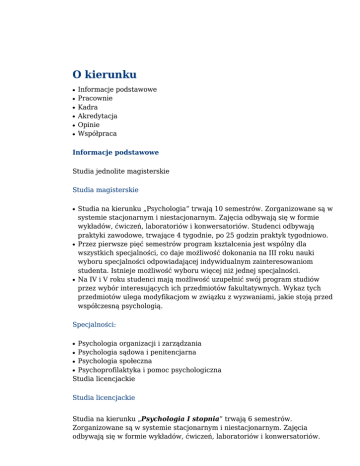 O kierunku ● ● ● ● ● ● Informacje podstawowe Pracownie Kadra Akredytacja Opinie Współpraca Informacje podstawowe Studia jednolite magisterskie Studia magisterskie ● ● ● Studia na kierunku „Psychologia” trwają 10 semestrów. Zorganizowane są w systemie stacjonarnym i niestacjonarnym. Zajęcia odbywają się w formie wykładów, ćwiczeń, laboratoriów i konwersatoriów. Studenci odbywają praktyki zawodowe, trwające 4 tygodnie, po 25 godzin praktyk tygodniowo. Przez pierwsze pięć semestrów program kształcenia jest wspólny dla wszystkich specjalności, co daje możliwość dokonania na III roku nauki wyboru specjalności odpowiadającej indywidualnym zainteresowaniom studenta. Istnieje możliwość wyboru więcej niż jednej specjalności. Na IV i V roku studenci mają możliwość uzupełnić swój program studiów przez wybór interesujących ich przedmiotów fakultatywnych. Wykaz tych przedmiotów ulega modyfikacjom w związku z wyzwaniami, jakie stoją przed współczesną psychologią. Specjalności: Psychologia organizacji i zarządzania Psychologia sądowa i penitencjarna Psychologia społeczna Psychoprofilaktyka i pomoc psychologiczna Studia licencjackie ● ● ● ● Studia licencjackie Studia na kierunku „Psychologia I stopnia” trwają 6 semestrów. Zorganizowane są w systemie stacjonarnym i niestacjonarnym. Zajęcia odbywają się w formie wykładów, ćwiczeń, laboratoriów i konwersatoriów. Studenci odbywają praktyki zawodowe trwające 75 godz. Przez pierwszy rok studiów program kształcenia jest wspólny dla wszystkich specjalności, co daje możliwość dokonania na II roku nauki wyboru specjalności odpowiadającej indywidualnym zainteresowaniom studenta. Istnieje możliwość wyboru więcej niż jednej specjalności. Specjalności: ● ● ● ● ● Psychologia w biznesie Psychologia w sporcie Psychologia w resocjalizacji Psychologia w reklamie i marketingu Psychologia w promocji zdrowia Przedmioty wspólne dla kierunku (niezależnie od specjalności): Przedmioty ogólne: Technologia informacyjna; Język angielski z elementami języka specjalistycznego; Wychowanie fizyczne; Moduł humanistyczny: społeczno-socjologiczny; Przedmioty podstawowe: Moduł humanistyczny: filozoficzno-psychologiczny; Biologiczne podstawy zachowań; Statystyka w psychologii; Metodologia badań psychologicznych; Elementy prawa dla psychologów; Przedmioty kierunkowe: Procesy poznawcze; Emocje i motywacja; Osobowość; Psychologia różnic indywidualnych; Psychologia rozwoju człowieka; Diagnoza psychologiczna; Pomoc psychologiczna; Psychologia społeczna; Psychopatologia; Psychologia kliniczna; Psychologia pracy; Seminarium dyplomowe; Pracownie PRACOWNIA PSYCHOPROFILAKTYKI I POMOCY PSYCHOLOGICZNEJ Zakład istnieje od roku akademickiego 2009/2010 Kierownik: prof. dr hab. Zbigniew B Gaś Etatowi pracownicy: dr Wiesław Poleszak, dr Monika Baryła-Matejczuk, dr Grzegorz Kata Pracownicy wspomagający: dr Jerzy Tomala, dr Ewa Ziarek, dr Katarzyna Hartfil Zakład sprawuje opiekę merytoryczną nad: ● ● ● ● ● następującymi zajęciami kursowymi: Trening adaptacyjny, Emocje i motywacja, Pomoc psychologiczna, Psychoterapia, wykład fakultatywny oraz seminarium magisterskie;. specjalnością psychoprofilaktyka i pomoc psychologiczna; Akademickim Centrum Wsparcia Rówieśniczego; Wolontariatem psychologicznym; Samorządem Studentów WSEI. Przy Zakładzie Psychoprofilaktyki i Pomocy Psychologicznej działa seminarium doktoranckie z zakresu psychologii, w którym aktualnie uczestniczą: mgr Iwona Czerniec, mgr Małgorzata Wojdyło, mgr Edyta Worobiej, mgr Agnieszka Chudzińska. PRACE BADAWCZE Badania naukowe pracowników Zakładu prowadzone są w ramach wieloletniego tematu badawczego: System rodzinny a jakość funkcjonowania psychospołecznego jego członków. PRACOWNIA PSYCHOLOGII ROZWOJOWEJ I WYCHOWAWCZEJ Zakład istnieje od roku akademickiego 2009/2010 Kierownik: prof. dr hab. Czesław Walesa Etatowi pracownicy: prof. dr hab. Lidia Łysiuk, dr Lilianna Kostańska Pracownicy wspomagający: dr Maria Panasiuk, mgr Lucyna Montusiewicz Zakład sprawuje opiekę merytoryczną nad następującymi zajęciami kursowymi: ● ● ● ● ● Psychologia rozwoju człowieka w cyklu życia Psychologia wychowawcza Psychologia rewalidacyjna wykład fakultatywny oraz seminarium magisterskie;. Czasopismem „Horyzonty Psychologii” PRACE BADAWCZE Badania naukowe pracowników Zakładu prowadzone są w ramach wieloletniego tematu badawczego: Przekonania Polaków XXI wieku w różnych okresach dorosłości (rozwojowe badania osób) Kierownik zespołu badawczego jest prof. dr hab. Czesław Walesa, a w skład zespołu badawczego wchodzą: prof. dr hab. Lidia Łysiuk i dr Lilianna Kostańska PRACOWNIA PSYCHOLOGII OGÓLNEJ I DIAGNOZY PSYCHOLOGICZNEJ Zakład istnieje od roku akademickiego 2011/2012 Kierownik: ks. prof. dr hab. Marian Stepulak Etatowi pracownicy: dr Ewelina Pękalska, ks. dr Jacek Łukasiewicz Zakład sprawuje opiekę kursowymi: ● ● ● ● ● merytoryczną nad następującymi zajęciami wprowadzenie do psychologii i historia myśli psychologicznej, psychologia różnic indywidualnych, procesy poznawcze, diagnoza psychologiczna, wykład fakultatywny i seminarium magisterskie. W ramach działań dodatkowych zakład podejmuje opiekę merytoryczną nad stroną internetową kierunku oraz opiekę merytoryczną nad czasopismem studenckiego ruchu naukowego Innowacje Psychologiczne. Zakład zorganizował dwie konferencji ogólnopolskie dotyczące koncepcji człowieka we współczesnej psychologii (2012) i problemów rodziny, ich diagnozie, profilaktyce i terapii (2013). PRACE BADAWCZE Zakładowy projekt badawczy na rok 2014 to „Temporalny aspekt funkcjonowania człowieka”. PRACOWNIA PSYCHOLOGII OSOBOWOŚCI I PSYCHOPATOLOGII Zakład istnieje od roku akademickiego 2011/2012 Kierownik: ks. prof. dr hab. Kazimierz Popielski. Etatowi pracownicy: dr Marta Pawelec, 