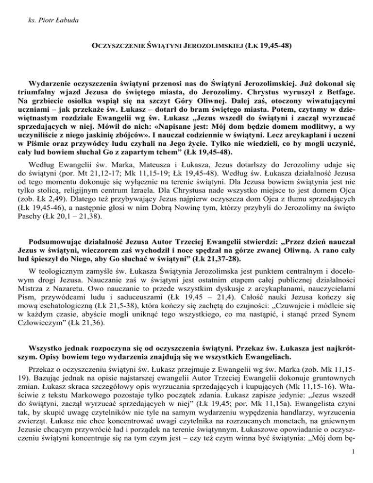 ks. Piotr Łabuda OCZYSZCZENIE ŚWIĄTYNI JEROZOLIMSKIEJ (ŁK 19,45-48) Wydarzenie oczyszczenia świątyni przenosi nas do Świątyni Jerozolimskiej. Już dokonał się triumfalny wjazd Jezusa do świętego miasta, do Jerozolimy. Chrystus wyruszył z Betfage. Na grzbiecie osiołka wspiął się na szczyt Góry Oliwnej. Dalej zaś, otoczony wiwatującymi uczniami – jak przekaże św. Łukasz – dotarł do bram świętego miasta. Potem, czytamy w dziewiętnastym rozdziale Ewangelii wg św. Łukasz „Jezus wszedł do świątyni i zaczął wyrzucać sprzedających w niej. Mówił do nich: «Napisane jest: Mój dom będzie domem modlitwy, a wy uczyniliście z niego jaskinię zbójców». I nauczał codziennie w świątyni. Lecz arcykapłani i uczeni w Piśmie oraz przywódcy ludu czyhali na Jego życie. Tylko nie wiedzieli, co by mogli uczynić, cały lud bowiem słuchał Go z zapartym tchem” (Łk 19,45-48). Według Ewangelii św. Marka, Mateusza i Łukasza, Jezus dotarłszy do Jerozolimy udaje się do świątyni (por. Mt 21,12-17; Mk 11,15-19; Łk 19,45-48). Według św. Łukasza działalność Jezusa od tego momentu dokonuje się wyłącznie na terenie świątyni. Dla Jezusa bowiem świątynia jest nie tylko stolicą, religijnym centrum Izraela. Dla Chrystusa nade wszystko miejsce to jest domem Ojca (zob. Łk 2,49). Dlatego też przybywający Jezus najpierw oczyszcza dom Ojca z tłumu sprzedających (Łk 19,45-46), a następnie głosi w nim Dobrą Nowinę tym, którzy przybyli do Jerozolimy na święto Paschy (Łk 20,1 – 21,38). Podsumowując działalność Jezusa Autor Trzeciej Ewangelii stwierdzi: „Przez dzień nauczał Jezus w świątyni, wieczorem zaś wychodził i noce spędzał na górze zwanej Oliwną. A rano cały lud śpieszył do Niego, aby Go słuchać w świątyni” (Łk 21,37-28). W teologicznym zamyśle św. Łukasza Świątynia Jerozolimska jest punktem centralnym i docelowym drogi Jezusa. Nauczanie zaś w świątyni jest ostatnim etapem całej publicznej działalności Mistrza z Nazaretu. Owo nauczanie to przede wszystkim dyskusje z arcykapłanami, nauczycielami Pism, przywódcami ludu i saduceuszami (Łk 19,45 – 21,4). Całość nauki Jezusa kończy się mową eschatologiczną (Łk 21,5-38), która kończy się zachętą do czujności: „Czuwajcie i módlcie się w każdym czasie, abyście mogli uniknąć tego wszystkiego, co ma nastąpić, i stanąć przed Synem Człowieczym” (Łk 21,36). Wszystko jednak rozpoczyna się od oczyszczenia świątyni. Przekaz św. Łukasza jest najkrótszym. Opisy bowiem tego wydarzenia znajdują się we wszystkich Ewangeliach. Przekaz o oczyszczeniu świątyni św. Łukasz przejmuje z Ewangelii wg św. Marka (zob. Mk 11,1519). Bazując jednak na opisie najstarszej ewangelii Autor Trzeciej Ewangelii dokonuje gruntownych zmian. Łukasz skraca szczegółowy opis wyrzucania sprzedających i kupujących (Mk 11,15-16). Właściwie z tekstu Markowego pozostaje tylko początek zdania. Łukasz zapisze jedynie: „Jezus wszedł do świątyni, zaczął wyrzucać sprzedających w niej” (Łk 19,45; por. Mk 11,15a). Ewangelista czyni tak, by skupić uwagę czytelników nie tyle na samym wydarzeniu wypędzenia handlarzy, wyrzucenia zwierząt. Łukasz nie chce koncentrować uwagi czytelnika na rozrzucanych monetach, na gniewnym Jezusie chcącym przywrócić ład i porządek na terenie świątynnym. Łukaszowe opowiadanie o oczyszczeniu świątyni koncentruje się na tym czym jest – czy też czym winna być świątynia: „Mój dom bę1 dzie domem modlitwy, a wy uczyniliście go jaskinią zbójców” (Łk 19,46)1. Jezus oskarża przywódców narodu wybranego, że ze świątyni która winna być przede wszystkim miejscem modlitwy, oni uczynili miejsce nieprawości. Podkreśla, iż to co dzieje się, to co obecnie ma miejsce w murach świątyni, jest ich winą. Oni sprawili, iż świątynia jest „miejscem nieprawości” – „jaskinia zbójców”. Całość wydarzenia Łukasz podsumowuje zwięzłą informacją dotyczącą działalności Jezusa na terenie świątyni. Przedstawia dwie różne postawy Żydów względem Mistrza z Nazaretu: z jednej strony wrogość arcykapłanów, uczonych w Piśmie i przywódców narodu, z drugiej zaś strony niezwykłe zasłuchanie otaczającego Jezusa ludu. Świątynia Jerozolimska – miejsce święte narodu wybranego. W czasach Chrystusa istniała świątynia przebudowana przez Heroda Wielkiego. Chcąc zyskać życzliwość swoich rodaków w 20/19 r. przed Chr. syn Heroda Antypatera rozpoczął przebudowę świątyni wybudowanej przez Zorobabela. Dedykacja świątyni Heroda nastąpiła w 10 r. przed Chr., ale prace przy świątyni zakończył dopiero w 64 r. król Agryppa II. Wkrótce potem, w 70 r. po Chr. świątynia została zburzona przez Tytusa. Sama świątynia miała rozmiary świątyni Salomona (zob. 1 Krl 6 – 8). Dużo większe jednak były konstrukcje zewnętrzne świątyni oraz przedsionek. Była to potężna budowla. Zewnętrzna jej długość wynosiła ok. 450 metrów, wewnętrzna zaś ponad 310 metrów. Fasada była wykonana w stylu hellenistycznym. Herod jednak szczególną uwagą zwrócił na rozbudowę placu świątynnego. Według różnych podań (zob. m.Mid 2,1) teren świątyni stanowił kwadrat o boku 500 łokci (1 łokieć = ok. 45 cm). Dzisiaj plac świątynny objęty murami w zasadzie z czasów Heroda, ma formę trapezu: długość muru od strony zachodniej wynosi 491 metrów2, od strony wschodniej – 462 metrów, od strony północnej – 310 metrów, a od strony południowej – 281 metrów. Cały plac świątynny był otoczony murem. Do muru przylegały portyki. Od strony wschodniej, północnej i zachodniej znajdowały się portyki trzyrzędowe. W południowej części znajdował się portyk z czterema rzędami kolumn – tzw. Portyk Królewski, który miał formę bazyliki. We wschodniej części placu znajdował się Portyk Salomona. Do północno-zachodniej strony pla