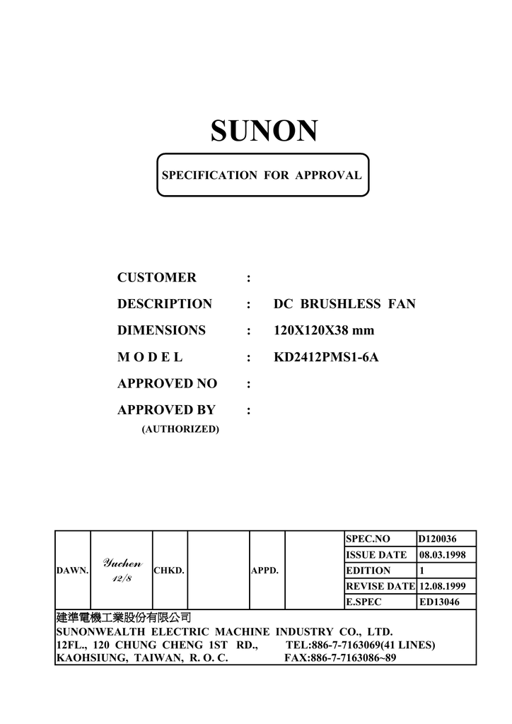 SUNON SPECIFICATION FOR APPROVAL CUSTOMER : DESCRIPTION : DC BRUSHLESS FAN DIMENSIONS : 120X120X38 mm MODEL : KD2412PMS1-6A APPROVED NO : APPROVED BY : (AUTHORIZED) DAWN. Yuchen 12/8 CHKD. APPD. SPEC.NO D120036 ISSUE DATE 08.03.1998 EDITION 1 REVISE DATE 12.08.1999 E.SPEC ED13046 建準電機工業股份有限公司 SUNONWEALTH ELECTRIC MACHINE INDUSTRY CO., LTD. 12FL., 120 CHUNG CHENG 1ST RD., TEL:886-7-7163069(41 LINES) KAOHSIUNG, TAIWAN, R. O. C. FAX:886-7-7163086~89 SUNON DC BRUSHLESS FAN MODEL: KD2412PMS1-6A CHARACTERISTICS 1. Motor Design : Patented single-coil DC brushless 6 poles motor design. 2. Insulation Resistance : More than 500M ohm between internal stator and lead wire(+) measured by DC 500V. 3. Dielectric Strength : Applied AC 500V for one minute or AC 600V for 2 seconds between housing and lead wire(+) 4. Noise Level : Measured in an semi-anechoic chamber with background noise level below 15 dB(A). The fan is running in free air with microphone at a distance of one meter from the fan intake. 5. Input power, Current & Speed : Measured after continuous 30 minutes operation at rated voltage in clean air at ambient temperature of 25 degrees C. 6. Tolerances : ±15% on rated power and current. 7. Motor Protection : Polarity protected & Locked rotor protected. 8. Air Performance : Measured by a double chamber. The value are recorded when the fan speed is stabilized at rated voltage. SPEC.NO 建準電機工業股份有限公司 ISSUE DATE SUNONWEALTH ELECTRIC MACHINE INDUSTRY CO., LTD. PA G E D120036 REVISE DATE 08. 03. 1998 E D I T I O N 0 2 OF 6 SUNON SPECIFICATIONS MODEL: KD2412PMS1-6A 1-1. Rated Voltage : 24 VDC 1-2. Operating Voltage Range : 20.4-27.6 VDC 1-3. Starting Voltage : 16 VDC 1-4. Rated Speed : 3000 RPM ± 250 RPM 1-5. Air Delivery : 107 CFM 1-6. Static Pressure : 0.30 Inch-H2O 1-7. Rated Current : 0.28 AMP 1-8. Rated Power : 6.7 WATTS 1-9. Noise Level : 41 dB(A) 1-10. Direction of Rotation : Counter-clockwise viewed front fan blade 1-11. Operating Temperature : -10 to +70 Deg.C 1-12. Storage Temperature : -40 to +70 Deg.C 1-13. Bearing System : Lubricated sleeve bearing system 1-14. Weight : 326g 1-15. Safety : UL/CUR/TUV/CE Approvals 1-16. Vibration : Vibration of acceleration 1.5G and Frequency 5~50~5Hz is applied in the 3 directions(X,Y,Z) for 30 minutes, each Direction at the cycle of 1 minute. 1-17. Locked Rotor Protection : Automatic Restart Capability SPEC.NO 建準電機工業股份有限公司 ISSUE DATE SUNONWEALTH ELECTRIC MACHINE INDUSTRY CO., LTD. PA G E D120036 REVISE DATE 12. 08. 1999 08. 03. 1998 E D I T I O N 1 3 OF 6 SUNON MODEL : KD2412PMS1-6A PERFORMANCE CURVES STATIC PRESSURE mm-H2O Inch-H2O 12 0.40 24 VDC 8 0.20 4 0 CFM 0 0 50 100 1.42 2.84 m3/min SPEC.NO 建準電機工業股份有限公司 ISSUE DATE SUNONWEALTH ELECTRIC MACHINE INDUSTRY CO., LTD. PA G E D120036 REVISE DATE 08. 03. 1998 E D I T I O N 0 4 OF 6 SUNON MATERIAL 2-1. Frame : Thermoplastic PBT of UL 94V-0 2-2. Impeller : Thermoplastic PBT of UL 94V-0 2-3. Bobbin : Thermoplastic PBT of UL 94V-0 2-4. Lead Wire : UL1007,24AWG,+RED;-BLACK DIMENSIONS Air Flow Direction: Label side. :mm UNITS: SPEC.NO 建準電機工業股份有限公司 ISSUE DATE SUNONWEALTH ELECTRIC MACHINE INDUSTRY CO., LTD. PA G E D120036 REVISE DATE 08. 03. 1998 E D I T I O N 0 5 OF 6 SUNON Notes 1. SUNON will not guarantee the products if the application of our products is exceeded the limitation which is specified on this specification. 2. In case of change of the specification specified on this document, a written notice is requested in advance. 3. Please do not touch the impeller with pressure and never bring the fan with lead wire. The bearings and lead wire may be damaged. 4. No guarantee on the products against the safety problem or failure caused by powder dust, drop of water or insect. 5. If there is any data or related documentation different from this data sheet, this data sheet is the principal reference. 6. For the purpose of MIS, please indicate SPEC No. on every order. 7. In case of the fan has no polarity protection function, wires with same color (electrode) must be connected together during the assembly. (i.e. red + red, black + black) or the fan will be damaged immediately. 8. Please do not use the fan in the environment of corrosive gas or liquid or any detrimental gas. 9. Please do not store the fan in the environment of high / low temperature, high humidity or any detrimental gas. Please store the fan within 6 months, every 6 months, there shall be a linkage of electric current to the fan, even though the fan is stored in room temperature. 10.While the fan is in operation, please do not lock the fan intentionally for a long period of time, since the continuous stoppage will result in over-heat and thus burn-out of the fan. 11.During the installation of the fan, please pay substantial attention to possible noise cause by resonance vibration and vibration. 12.During the testing of the fan, please be sure to use finger guard to insure safety. 13.Unless otherwise specified, if there is any doubt in the judgement, the temperature and relative humidity range of environment will be take in according to the standard test condition as 25℃ and 65%. SPEC.NO 建準電機工業股份有限公司 ISSUE DATE SUNONWEALTH ELECTRIC MACHINE INDUSTRY CO., LTD. PA G E D120036 REVISE DATE 12. 08. 1999 08. 03. 1998 E D I T I O N 1 6 OF 6