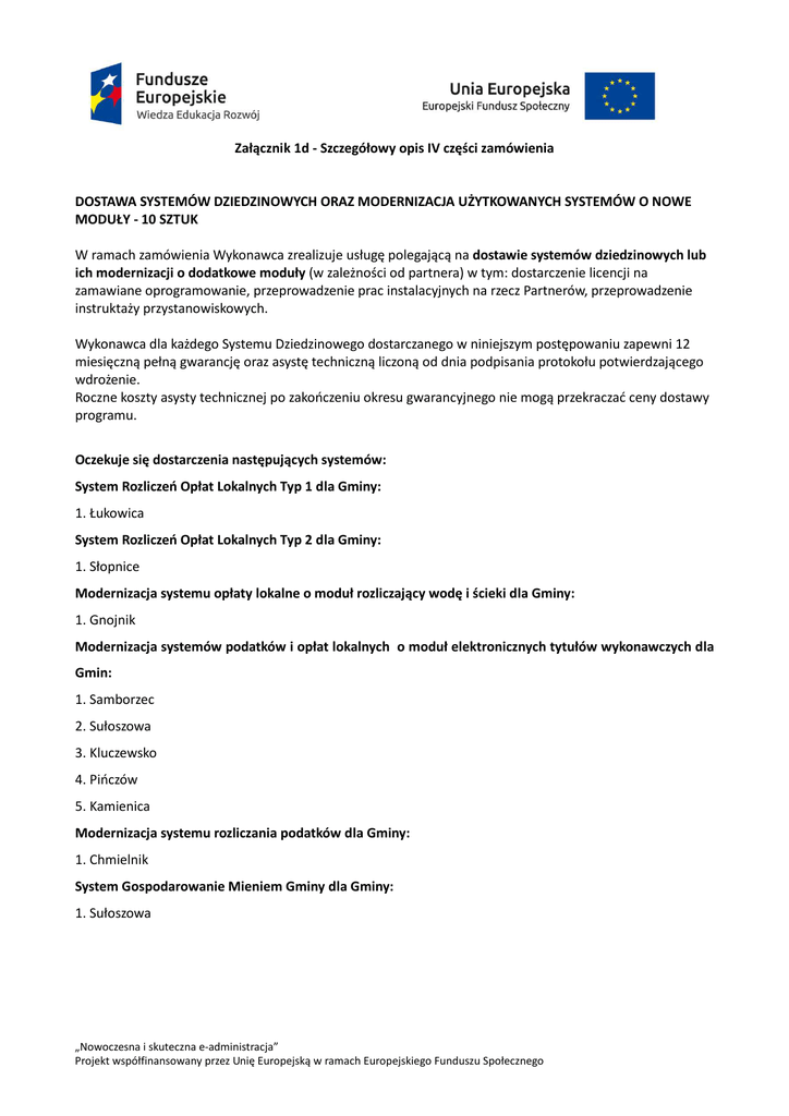 Załącznik 1d - Szczegółowy opis IV części zamówienia DOSTAWA SYSTEMÓW DZIEDZINOWYCH ORAZ MODERNIZACJA UŻYTKOWANYCH SYSTEMÓW O NOWE MODUŁY - 10 SZTUK W ramach zamówienia Wykonawca zrealizuje usługę polegającą na dostawie systemów dziedzinowych lub ich modernizacji o dodatkowe moduły (w zależności od partnera) w tym: dostarczenie licencji na zamawiane oprogramowanie, przeprowadzenie prac instalacyjnych na rzecz Partnerów, przeprowadzenie instruktaży przystanowiskowych. Wykonawca dla każdego Systemu Dziedzinowego dostarczanego w niniejszym postępowaniu zapewni 12 miesięczną pełną gwarancję oraz asystę techniczną liczoną od dnia podpisania protokołu potwierdzającego wdrożenie. Roczne koszty asysty technicznej po zakończeniu okresu gwarancyjnego nie mogą przekraczać ceny dostawy programu. Oczekuje się dostarczenia następujących systemów: System Rozliczeń Opłat Lokalnych Typ 1 dla Gminy: 1. Łukowica System Rozliczeń Opłat Lokalnych Typ 2 dla Gminy: 1. Słopnice Modernizacja systemu opłaty lokalne o moduł rozliczający wodę i ścieki dla Gminy: 1. Gnojnik Modernizacja systemów podatków i opłat lokalnych o moduł elektronicznych tytułów wykonawczych dla Gmin: 1. Samborzec 2. Sułoszowa 3. Kluczewsko 4. Pińczów 5. Kamienica Modernizacja systemu rozliczania podatków dla Gminy: 1. Chmielnik System Gospodarowanie Mieniem Gminy dla Gminy: 1. Sułoszowa „Nowoczesna i skuteczna e-administracja” Projekt współfinansowany przez Unię Europejską w ramach Europejskiego Funduszu Społecznego Oczekiwania wobec Systemu Opłat Lokalnych Typ 1– na dzień składania ofert: Wymagania ogólne: 1. System musi wykorzystywać relacyjną bazę danych typu SQL. 2. System musi pracować w technologii klient-serwer. 3. System musi pracować w oparciu o jedną wspólną scentralizowaną bazę danych dla wszystkich stanowisk roboczych i zakresów merytorycznych modułu. 4. System musi zapewniać przyjazną komunikację z użytkownikiem (zapewniać kontrolę wprowadzanych danych). 5. System musi wykorzystywać swoje własne słowniki obejmujące swym zakresem co najmniej dane teleadresowe, imiona, rejony, numery kont bankowych. 6. System musi współpracować (w zakresie sprawdzenia) ze słownikami miejscowości, ulic, kodów pocztowych, kodów terytorialnych nadanych przez GUS. 7. System musi posiadać mechanizmy w obszarze bezpieczeństwa w zakresie niepowołanego dostępu poprzez nadanie unikalnych loginów użytkowników i haseł. 8. System musi być zgodny z aktualnym stanem prawnym, obowiązującym w dniu uruchomienia i instalacji przedmiotu zamówienia. 9. System musi posiadać dokumentację w języku polskim przeznaczoną zarówno dla administratora jak i użytkownika, pozwalającą na samodzielną naukę i pracę z modułem. 10. System musi posiadać funkcję administracji użytkownikami. 11. System musi ewidencjonować i identyfikować operacje wprowadzane przez poszczególnych użytkowników. Wymagania funkcjonalne: 1. System musi być dedykowany dla Jednostek Samorządu Terytorialnego związanych z dochodami rozliczającymi m.in. opłatę targową, rentę planistyczną, opłatę skarbową, zajęcie pasa drogowego, opłatę adiacencką, opłatę za parkingi, najem, reklamy, opłaty za sprzedaż, dzierżawę i wieczyste użytkowanie 2. System musi umożliwiać obsługę ewidencyjną i księgową wielu jednostek organizacyjnych JST „Nowoczesna i skuteczna e-administracja” Projekt współfinansowany przez Unię Europejską w ramach Europejskiego Funduszu Społecznego 3. System umożliwia zakładanie/tworzenie kartotek płatników z ich danymi szczegółowymi 4. System musi umożliwiać ewidencję osób fizycznych, instytucji prawnych, złożonych grup płatników 5. System musi prezentować historię zmian danych dokonanych na edytowanym podmiocie 6. System musi korzystać z wielu słowników automatycznie aktualizowanych przy tworzeniu nowych podmiotów i kartotek np. słownika miejscowości, ulic, kodów pocztowych itp. 7. System musi umożliwiać definicję dowolnych rodzajów rozliczanych należności (co najmniej tych wymienionych w pkt. 1) 8. System musi umożliwiać tworzenie własnych grup płatników, i ich dowolny podział 9. System musi umożliwiać definiowanie własnych szablonów umów (zawierające : nazwę, okres rozliczeniowy tj. częstotliwość naliczenia rat, stawka VAT, terminy płatności, możliwość określenia stawek zmiennych – dotyczy obliczania umów i opłat naliczanych na podstawie m.in. stawek publikowanych przez GUS, sposób obliczania rat – rozliczane proporcjonalnie lub za pełny okres obowiązywania umowy) 10. System musi umożliwiać szczegółową obsługę umów dla płatników (zawierającą co najmniej informacje o: dacie zawarcia, dacie obowiązywania, dacie zakończenia, numerze umowy, numerze decyzji, ew. uldze, kwocie umowy oraz możliwość zdefiniowania własnej listy dodatkowych informacji tyczących się danej umowy) 11. System musi umożliwiać prowadzenie umów wieloletnich 12. System musi posiadać funkcjonalność wprowadzenia ulg dla umów (procentowa, roczna, dla raty) 13. System musi posiadać możliwość modyfikacji/szybszego zakończenia wskazanej umowy z uwzględnieniem i automatycznym przeliczeniem kwot wynikających z danych pierwotnie zawartej umowy. 14. System musi posiadać możliwość wprowadzania stawek zmiennych dla umów opartych o różne okresy czasowe (miesiąc, kwartał, półrocze, rok) 15. System musi umożliwiać zmianę precyzji (zaokrąglenie, określenie dokładności wyliczeń – miejsc dziesiętnych, setnych, tysięcznych) dla stawek zmiennych używanych w szablonach umów 16. System musi umożliwiać szczegółową obsługę należności jednorazowych dla płatników 17. System musi umożliwiać definiowanie własnych danych dodatkowych dla umów/należności jednorazowych (np. dane działki, powierzchnia, położenie, adres dzierżawcy – tj. dane szczegóło