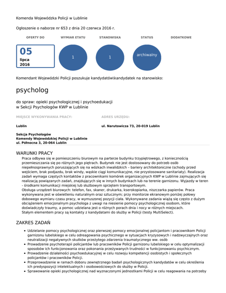 Komenda Wojewódzka Policji w Lublinie Ogłoszenie o naborze nr 653 z dnia 20 czerwca 2016 r. OFERTY DO 05 lipca 2016 WYMIAR ETATU STANOWISKA 1 1 STATUS DODATKOWE archiwalny Komendant Wojewódzki Policji poszukuje kandydatów\kandydatek na stanowisko: psycholog do spraw: opieki psychologicznej i psychoedukacji w Sekcji Psychologów KWP w Lublinie MIEJSCE WYKONYWANIA PRACY: ADRES URZĘDU: Lublin ul. Narutowicza 73, 20-019 Lublin Sekcja Psychologów Komendy Wojewódzkiej Policji w Lublinie ul. Północna 3, 20-064 Lublin WARUNKI PRACY Praca odbywa się w pomieszczeniu biurowym na parterze budynku trzypiętrowego, z koniecznością przemieszczania się po różnych jego piętrach. Budynek nie jest dostosowany do potrzeb osób niepełnosprawnych poruszających się na wózkach inwalidzkich – bariery architektoniczne (schody przed wejściem, brak podjazdu, brak windy, wąskie ciągi komunikacyjne, nie przystosowane sanitariaty). Realizacja zadań wymaga częstych kontaktów z pracownikami komórek organizacyjnych KWP w Lublinie zajmujących się realizacją powiązanych zadań, znajdujących się w innych budynkach lub na terenie garnizonu. Wyjazdy w teren - środkami komunikacji miejskiej lub służbowym sprzętem transportowym. Obsługa urządzeń biurowych: telefon, fax, skaner, drukarka, kserokopiarka, niszczarka papierów. Praca wykonywana jest w oświetleniu naturalnym oraz sztucznym; przy monitorze ekranowym poniżej połowy dobowego wymiaru czasu pracy, w wymuszonej pozycji ciała. Wykonywane zadania wiążą się często z dużym obciążeniem emocjonalnym psychologa z uwagi na niesienie pomocy psychologicznej osobom, które doświadczyły traumy, a pomoc udzielana jest o różnych porach dnia i nocy w różnych miejscach. Stałym elementem pracy są kontakty z kandydatami do służby w Policji (testy MultiSelect). ZAKRES ZADAŃ Udzielanie pomocy psychologicznej oraz pierwszej pomocy emocjonalnej policjantom i pracownikom Policji garnizonu lubelskiego w celu odreagowania psychicznego w sytuacjach kryzysowych i nadzwyczajnych oraz neutralizacji negatywnych skutków przeżytego zdarzenia traumatycznego ww. osób Prowadzenie psychoterapii policjantów lub pracowników Policji garnizonu lubelskiego w celu optymalizacji sposobów ich funkcjonowania oraz pokonania przeżywanych trudności w funkcjonowaniu psychicznym. Prowadzenie działalności psychoedukacyjnej w celu rozwoju kompetencji osobistych i społecznych policjantów i pracowników Policji. Przeprowadzenie w ramach doboru zewnętrznego badań psychologicznych kandydatów w celu określenia ich predyspozycji intelektualnych i osobowościowych do służby w Policji. Sprawowanie opieki psychologicznej nad wyznaczonymi jednostkami Policji w celu reagowania na potrzeby funkcjonariuszy i pracowników Policji w zakresie pomocy psychologicznej oraz promocji zdrowia psychicznego. Sporządzanie psychologicznej analizy samobójstwa lub usiłowania samobójstwa przez policjanta lub pracownika Policji w celu analizy przyczyn ww. i wysunięcia ewentualnych propozycji profilaktycznych w tym zakresie. WYMAGANIA NIEZBĘDNE Wykształcenie: wyższe na kierunku psychologia doświadczenie zawodowe: 1 rok w realizacji zadań z zakresu psychologii Umiejętność komunikowania się, analizy i syntezy, Umiejętność rozwiązywania problemów, radzenia sobie w sytuacjach stresujących Umiejętność współpracy Dyspozycyjność i mobilność Posiadanie poświadczenia bezpieczeństwa uprawniającego do dostępu do informacji niejawnych o klauzuli „poufne” lub oświadczenie o wyrażeniu zgody na poddanie się procedurze sprawdzającej umożliwiającej wydanie upoważnienia do dostępu do informacji niejawnych opatrzonych klauzulą “poufne” Posiadanie obywatelstwa polskiego Korzystanie z pełni praw publicznych Nieskazanie prawomocnym wyrokiem za umyślne przestępstwo lub umyślne przestępstwo skarbowe WYMAGANIA DODATKOWE Wykształcenie: wyższe specjalizacja kliniczna lub stosowana (studia podyplomowe z ww. zakresu) doświadczenie zawodowe: 2 lata na stanowisku psychologa pracującego w obszarze pomocy psychologicznej z osobami dorosłymi Umiejętność podejmowania decyzji, organizacji pracy własnej, Umiejętność obsługi komputera (pakiet biurowy) Szybkość w działaniu Kreatywność, inicjatywa DOKUMENTY I OŚWIADCZENIA NIEZBĘDNE Życiorys/CV i list motywacyjny Kopie dokumentów potwierdzających spełnienie wymagania niezbędnego w zakresie wykształcenia Kopie dokumentów potwierdzających spełnienie wymagania niezbędnego w zakresie doświadczenia zawodowego / stażu pracy Poświadczenie bezpieczeństwa uprawniającego do dostępu do informacji niejawnych o klauzuli „poufne” lub oświadczenie o wyrażeniu zgody na poddanie się procedurze sprawdzającej umożliwiającej wydanie upoważnienia do dostępu do informacji niejawnych opatrzonych klauzulą “poufne” Oświadczenie o posiadaniu obywatelstwa polskiego albo kopia dokumentu potwierdzającego posiadanie polskiego obywatelstwa Oświadczenie o wyrażeniu zgody na przetwarzanie danych osobowych do celów naboru Oświadczenie o korzystaniu z pełni praw publicznych Oświadczenie o nieskazaniu prawomocnym wyrokiem za umyślne przestępstwo lub umyślne przestępstwo skarbowe DOKUMENTY I OŚWIADCZENIA DODATKOWE Kopie dokumentów potwierdzających spełnienie wymagania dodatkowego w zakresie wykształcenia Kopie dokumentów potwierdzających spełnienie wymagania dodatkowego w zakresie doświadczenia zawodowego / stażu pracy TERMINY I MIEJSCE SKŁADANIA DOKUMENTÓW Dokumenty należy złożyć do: 05 lipca 2016 r. Decyduje data: stempla pocztowego / osobistego dostarczenia oferty do urzędu Miejsce składania dokumentów: Komenda Wojewódzka Policji, ul. Narutowicza 73, 20-019 Lublin INNE INFORMACJE: W miesiącu poprzedzającym datę upublicznienia ogłoszenia wskaźnik zatrudnienia osób niepełnosprawnych w urzędzie, w rozumieniu przepisów o rehabilitacji zawodowej i społe