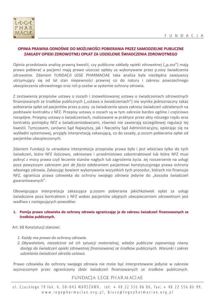 OPINIA PRAWNA ODNOŚNIE DO MOŻLIWOŚCI POBIERANIA PRZEZ SAMODZIELNE PUBLICZNE ZAKŁADY OPIEKI ZDROWOTNEJ OPŁAT ZA UDZIELENIE ŚWIADCZENIA ZDROWOTNEGO Opinia przedstawia analizę prawną kwestii, czy publiczne zakłady opieki zdrowotnej („p.zoz”) mają prawo pobierad a pacjenci mają prawo uiszczad opłaty za wykonywane przez p.zozy świadczenia zdrowotne. Zdaniem FUNDACJI LEGE PHARMACIAE taka analiza była niezbędna zważywszy utrzymujący się od lat stan niepewności prawnej co do natury i zakresu powszechnego ubezpieczenia zdrowotnego oraz roli p.zozów w systemie ochrony zdrowia. Z zestawienia przepisów ustawy o zozach i znowelizowanej ustawy o świadczeniach zdrowotnych finansowanych ze środków publicznych („ustawa o świadczeniach”) nie wynika jednoznaczny zakaz pobierania opłat od pacjentów przez p.zozy za świadczenia spoza zakresu świadczeo udzielanych na podstawie kontraktu z NFZ. Przepisy ustawy o zozach są w tym zakresie bardzo ogólne i częściowo niespójne. Przepisy ustawy o świadczeniach, realizowane w praktyce przez akty niższego rzędu oraz kontrakty pomiędzy NFZ a świadczeniodawcami, również nie zawierają szczegółowej regulacji tej kwestii. Tymczasem, zarówno Sąd Najwyższy, jak i Naczelny Sąd Administracyjny, opierając się na wykładni systemowej, przyjęły interpretację zakazującą, co do zasady, p.zozom pobierania opłat od pacjentów ubezpieczonych. Zdaniem Fundacji ta utrwalona interpretacja przepisów prawa była i jest właściwa tylko do tych świadczeo, które NFZ ilościowo, zakresowo i przedmiotowo zakontraktował lub które NFZ musi pokryd z mocy prawa czyli leczenie stanów nagłych lub zagrożenia życia. Jej rozszerzenie na usługi poza powyższym zakresem jest de facto odebraniem pacjentowi konstytucyjnego prawa ochrony własnego zdrowia. Zakazując bowiem wykonywania wszystkich tych procedur, których nie finansuje NFZ, ogranicza prawa człowieka do ochrony swojego zdrowia jedynie do „koszyka świadczeo gwarantowanych”. Obowiązująca interpretacja zakazująca p.zozom pobierania jakichkolwiek opłat za usługi świadczone poza kontraktem z NFZ wobec pacjentów objętych ubezpieczeniem zdrowotnym jest wadliwa z następujących powodów: 1. Pomija prawo człowieka do ochrony zdrowia ograniczając je do zakresu świadczeo finansowanych ze środków publicznych. Art. 68 Konstytucji stanowi: 1. Każdy ma prawo do ochrony zdrowia. 2. Obywatelom, niezależnie od ich sytuacji materialnej, władze publiczne zapewniają równy dostęp do świadczeo opieki zdrowotnej finansowanej ze środków publicznych. Warunki i zakres udzielania świadczeo określa ustawa. Prawo człowieka do ochrony swojego zdrowia nie może byd interpretowane jedynie w zakresie wyznaczonym przez ograniczony zbiór świadczeo finansowanych ze środków publicznych. Rozszerzenie interpretacyjne zakazu pobierania od pacjentów opłat na świadczenia, które nie są objęte kontraktem z NFZ, wydaje się nieporozumieniem. Wiadome jest, że NFZ nie pokrywa liczby i zakresu świadczeo wynikających z realnych potrzeb chorych, ale jedynie taką ich liczbę i zakres, które są określone w „koszyku” i na które posiada środki finansowe. W takiej sytuacji pacjenci p.zozów są skazani na korzystanie tylko z tych świadczeo, które gwarantuje im „koszyk”. Obecna interpretacja uderza więc bezpośrednio w pacjentów odbierając im możliwośd opłacania świadczeo spoza „koszyka”, a tym samym możliwośd ratowania swojego życia lub zdrowia. I to właśnie zakaz wnoszenia opłat za usługi świadczone przez p.zozy poza „koszykiem”, a nie działania nim objęte czyli rzeczone opłaty, jest w obecnym systemie niekonstytucyjny stanowiąc rażące ograniczenie prawa do ochrony zdrowia i życia, określonego w art. 68 i art. 38 ustawy zasadniczej. 2. Pomija naturę ubezpieczenia zdrowotnego, które jest ograniczone do świadczeo wymienionych w „koszyku”, przy której to konstrukcji istniejąca interpretacja jest niezasadna. MZ definiuje zakres „koszyka” a NFZ kontraktuje świadczenia w większości przypadków ograniczone przedmiotowo (co?), jakościowo (jak?) oraz ilościowo (ile?) w stosunku do mocy p.zozów i potrzeb pacjentów. Skutkiem tego sprzęt i lekarze nie są wykorzystywani odpowiednio do swoich możliwości, a kolejki pacjentów na planowane zabiegi wydłużają się. Tak więc, w interesie pacjentów leży, aby mieli oni prawo zapłacenia za świadczenie nie objęte już de facto kontraktem. Taka odpłatnośd nie może byd uznana za niezgodną z prawem, gdyż nie jest zabronioną przepisami podwójną płatnością za to samo świadczenie. NFZ nie finansuje jej już bowiem w ramach danego kontraktu. Należy uznad, że podmiotowe prawo człowieka do ochrony własnego zdrowia nie może byd ograniczone wobec iluzoryczności drugiego z jego praw konstytucyjnych, czyli prawa do równego dostępu do świadczeo finansowanych ze środków publicznych. Limitowane środki publiczne oraz ściśle określony zakres „koszyka” świadczeo gwarantowanych z definicji nie jest w stanie sprostad wszystkim potrzebom zdrowotnym pacjentów. A zgodnie z Konstytucją prawo do zaspokajania potrzeby ratowania swojego zdrowia i życia mają zagwarantowane. 3. Jest niekonsekwentna, gdyż de facto odnosi się tylko do zozów publicznych. W praktyce oznacza to, iż jedynie pacjenci p.zozów mają zakaz wnoszenia opłat za świadczenia wykraczające poza koszyk świadczeo gwarantowanych. W polskich realiach to p.zozy zajmują się najczęściej leczeniem przypadków najcięższych. Wobec braku możliwości pobierania opłat, są one stawiane wobec wyboru pomiędzy obowiązkami bezzwłocznego udzielania świadczeo, których odmowa lub zwłoka w udzieleniu mogłaby prowadzid do szkody na zdrowiu lub życiu, a realiami finansowymi wynikającymi z poziomu kontraktowania świadczeo z NFZ. 4. Jest korupcjogenna i oparta na hipokryzji, gdyż podtrzymuje iluzoryc